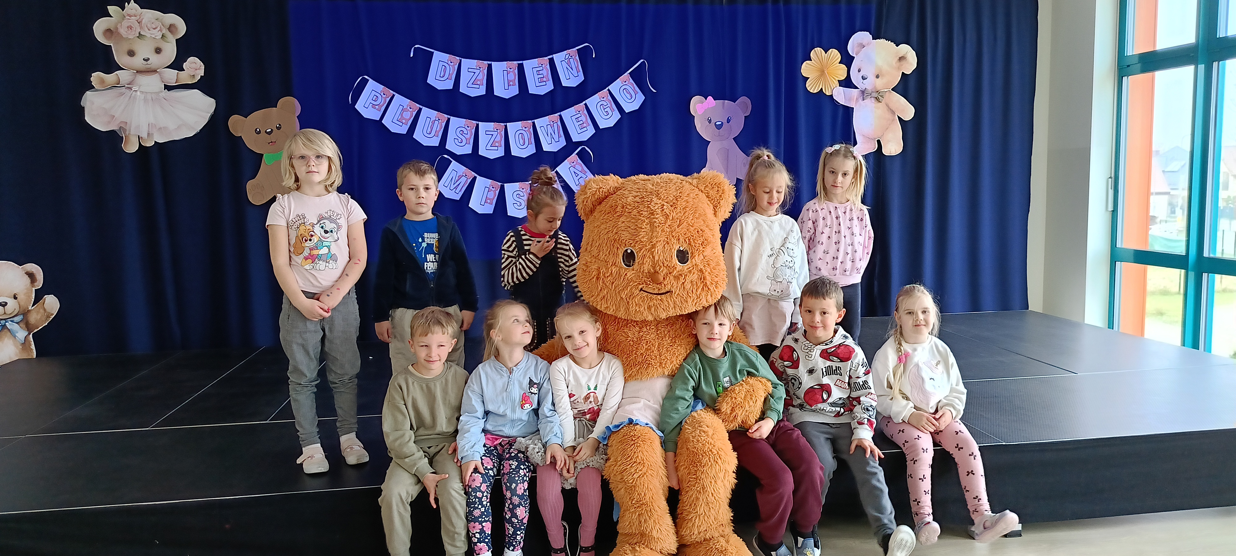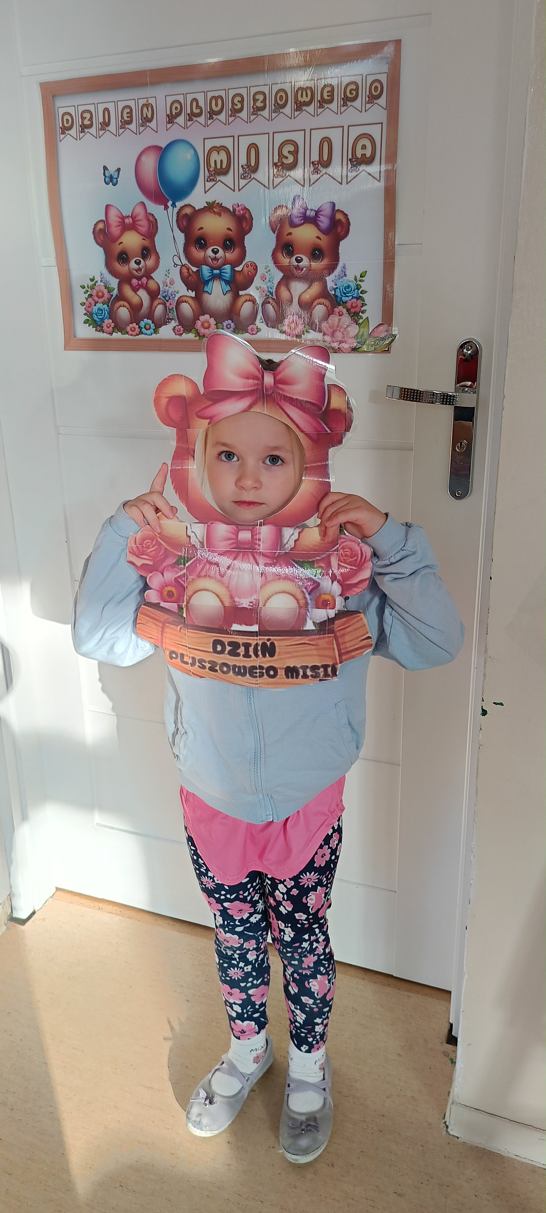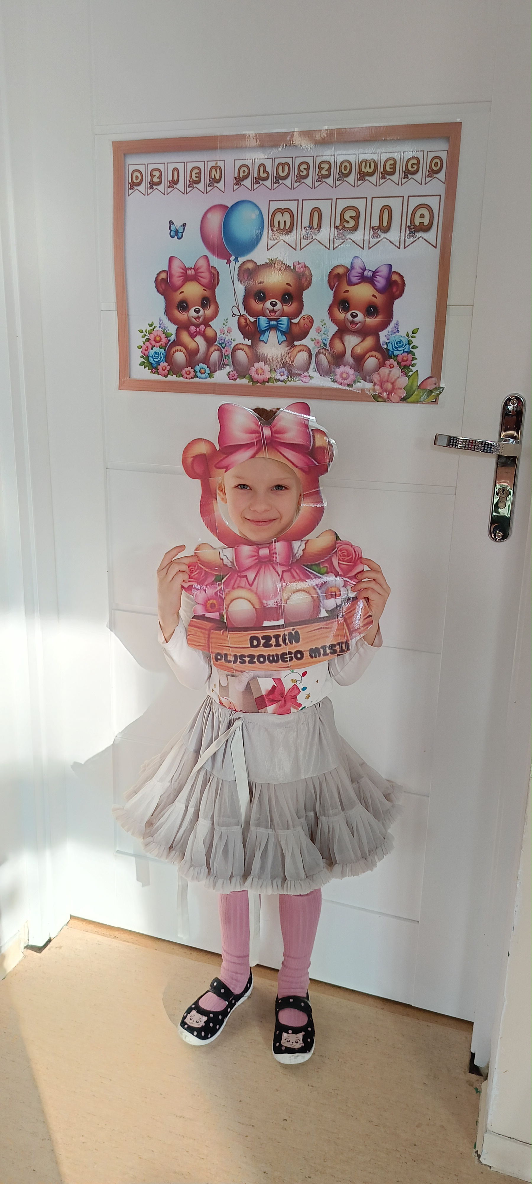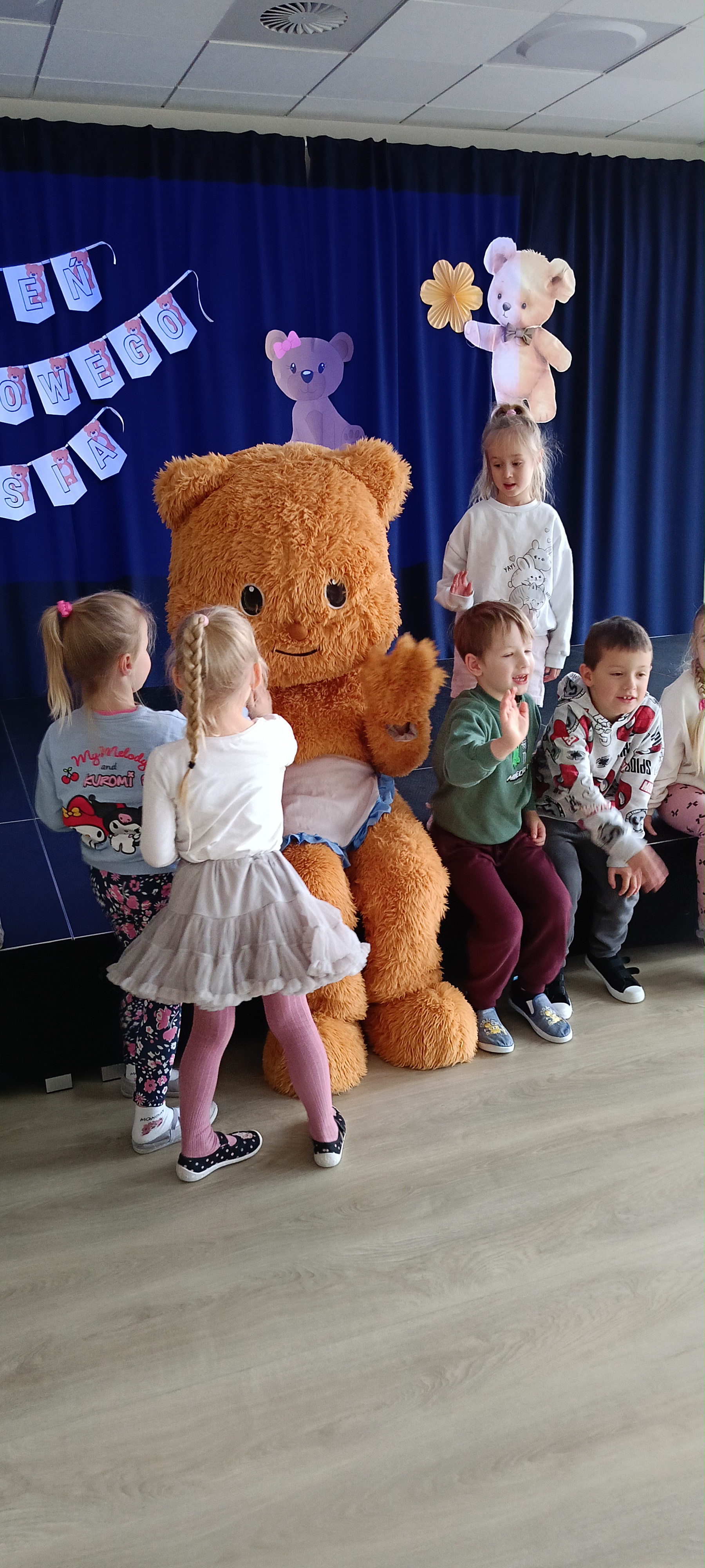 Dziś odwiedziliśmy w przedszkolu solenizanta dnia - pluszowego misia. Wszyscy razem od tańczyliśmy z nim taniec, odśpiewaliśmy sto lat zrobiliśmy wspólne zdjęcie. W klasie również obchodziliśmy dzień misia tworząc pacynkę misia, kolorując i przebierając się.