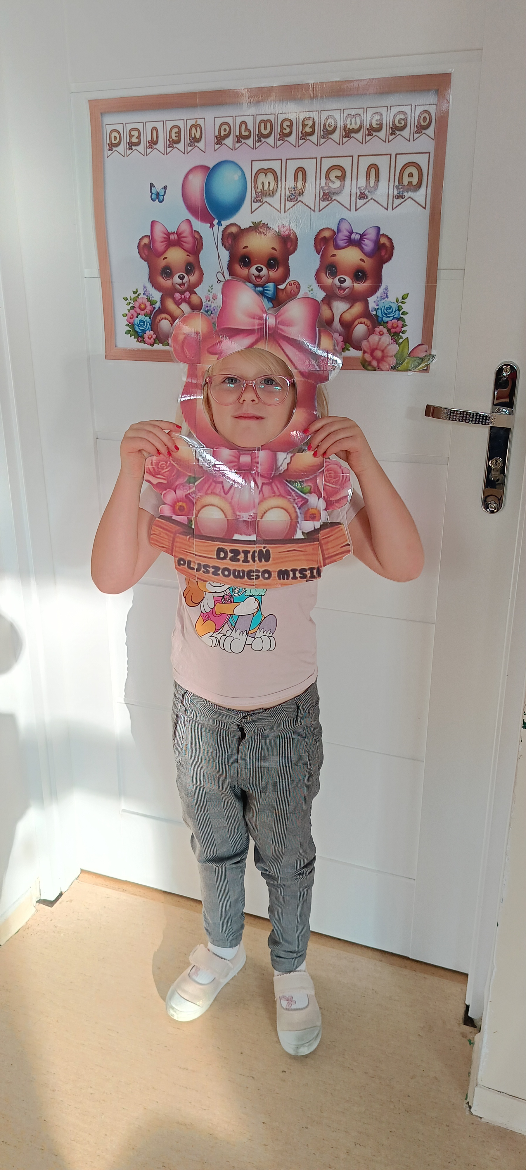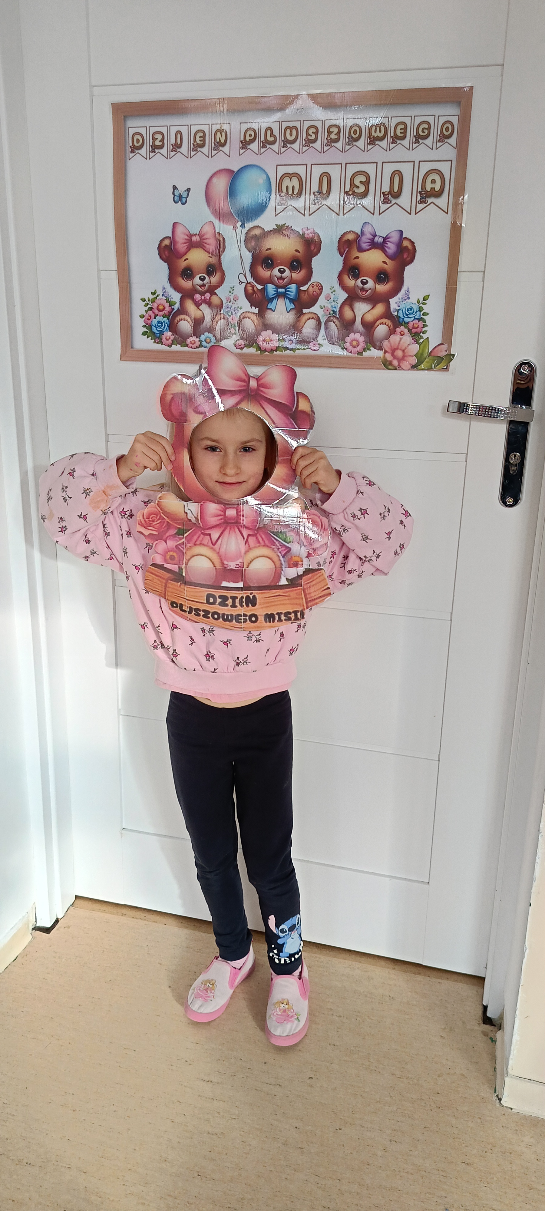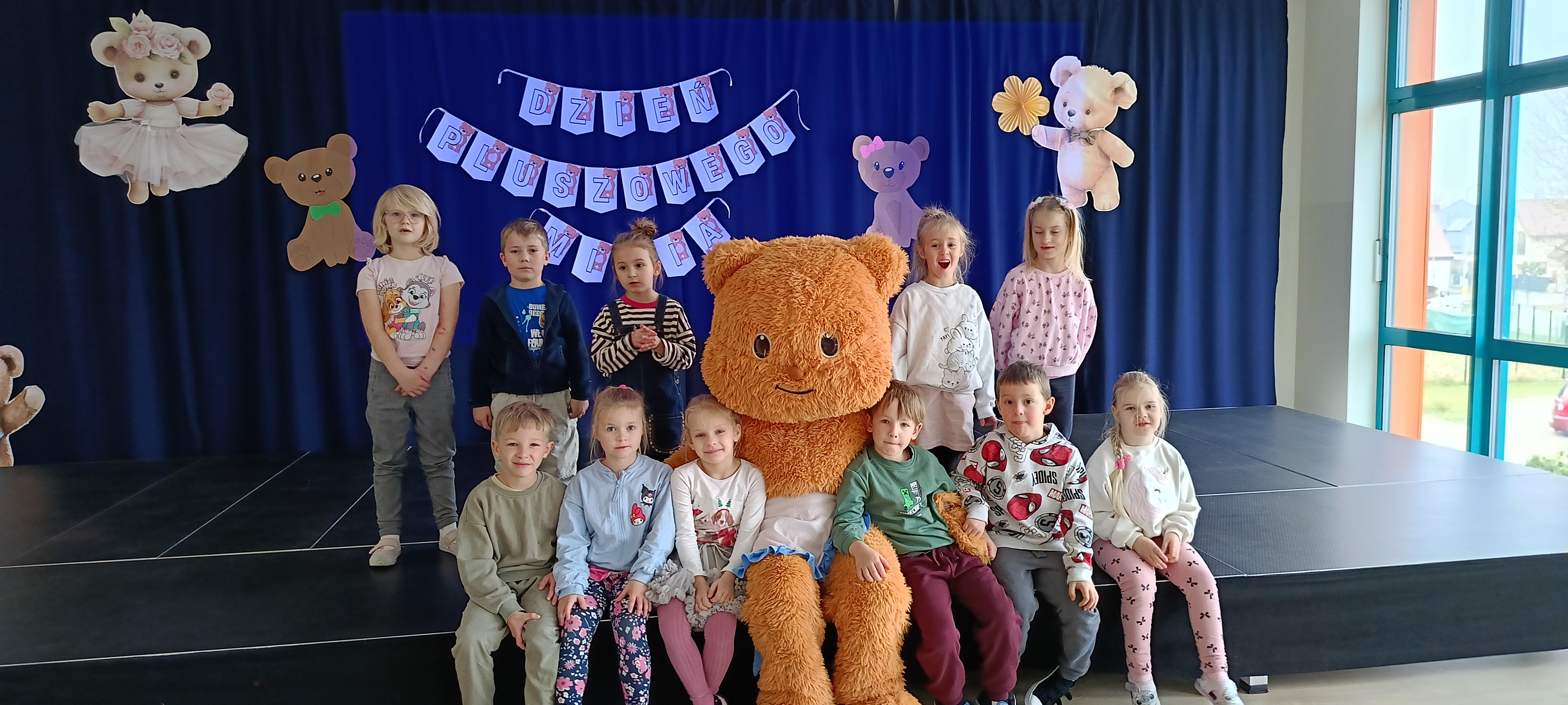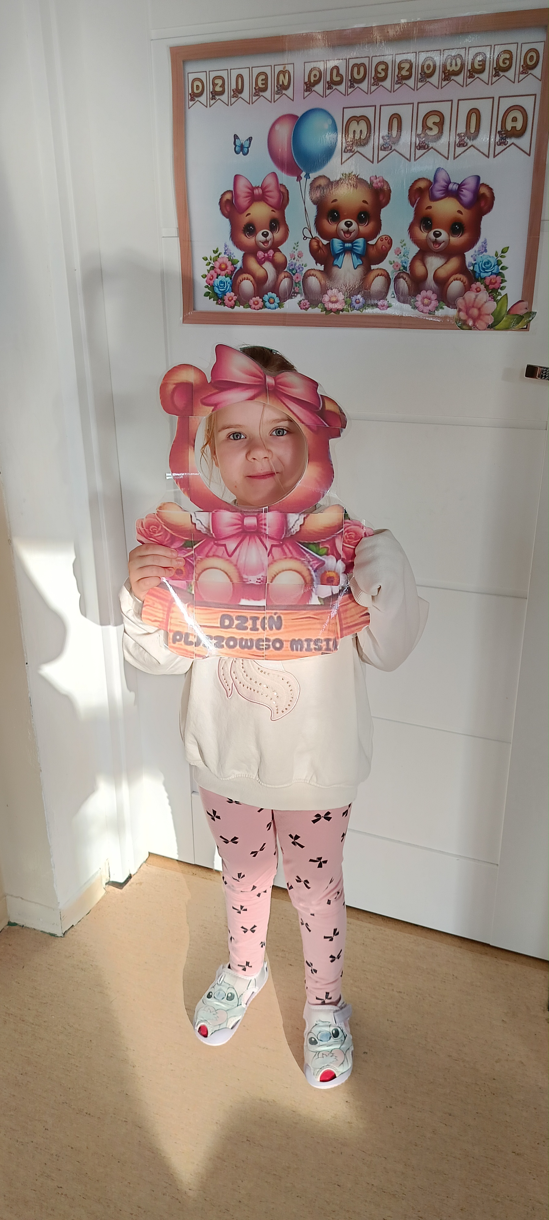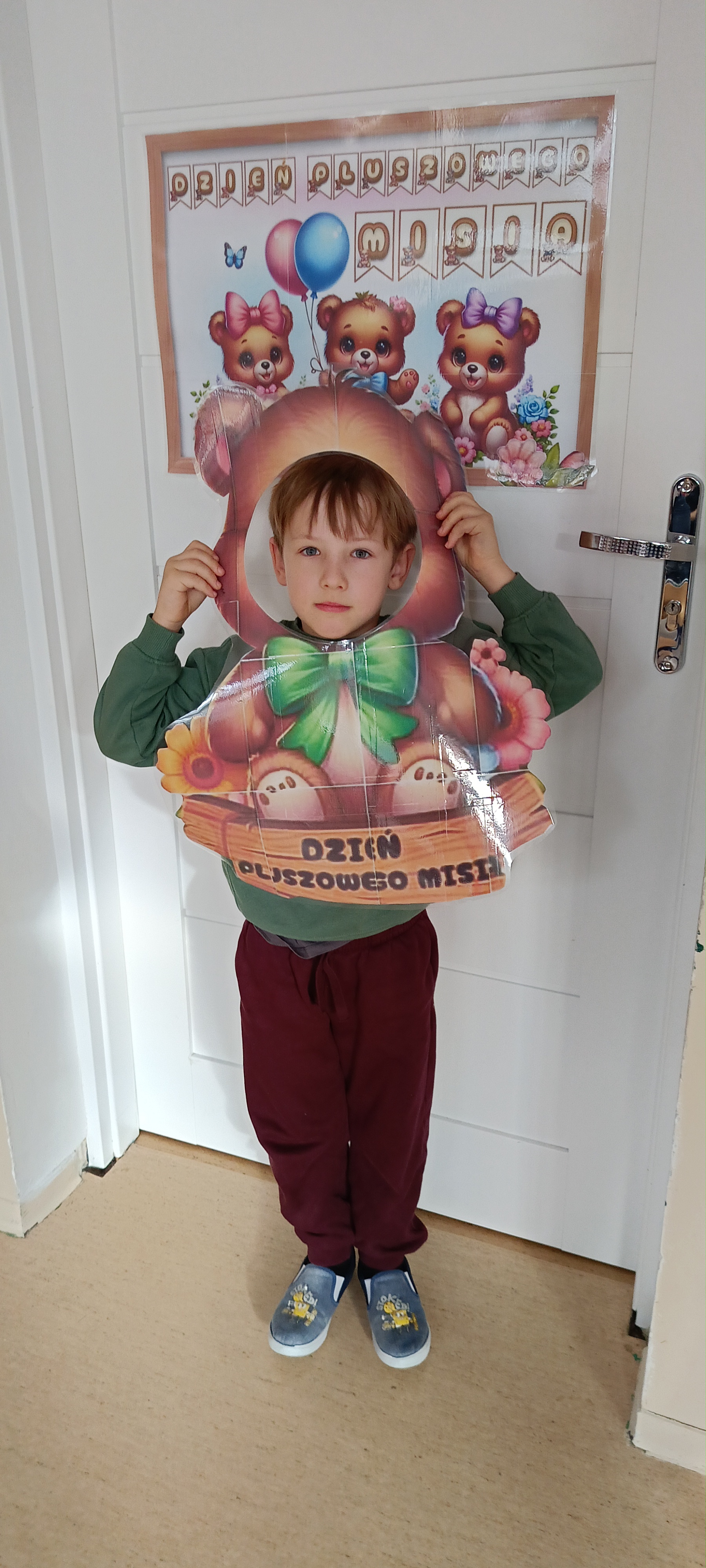 Dziś odwiedziliśmy w przedszkolu solenizanta dnia - pluszowego misia. Wszyscy razem od tańczyliśmy z nim taniec, odśpiewaliśmy sto lat zrobiliśmy wspólne zdjęcie. W klasie również obchodziliśmy dzień misia tworząc pacynkę misia, kolorując i przebierając się.