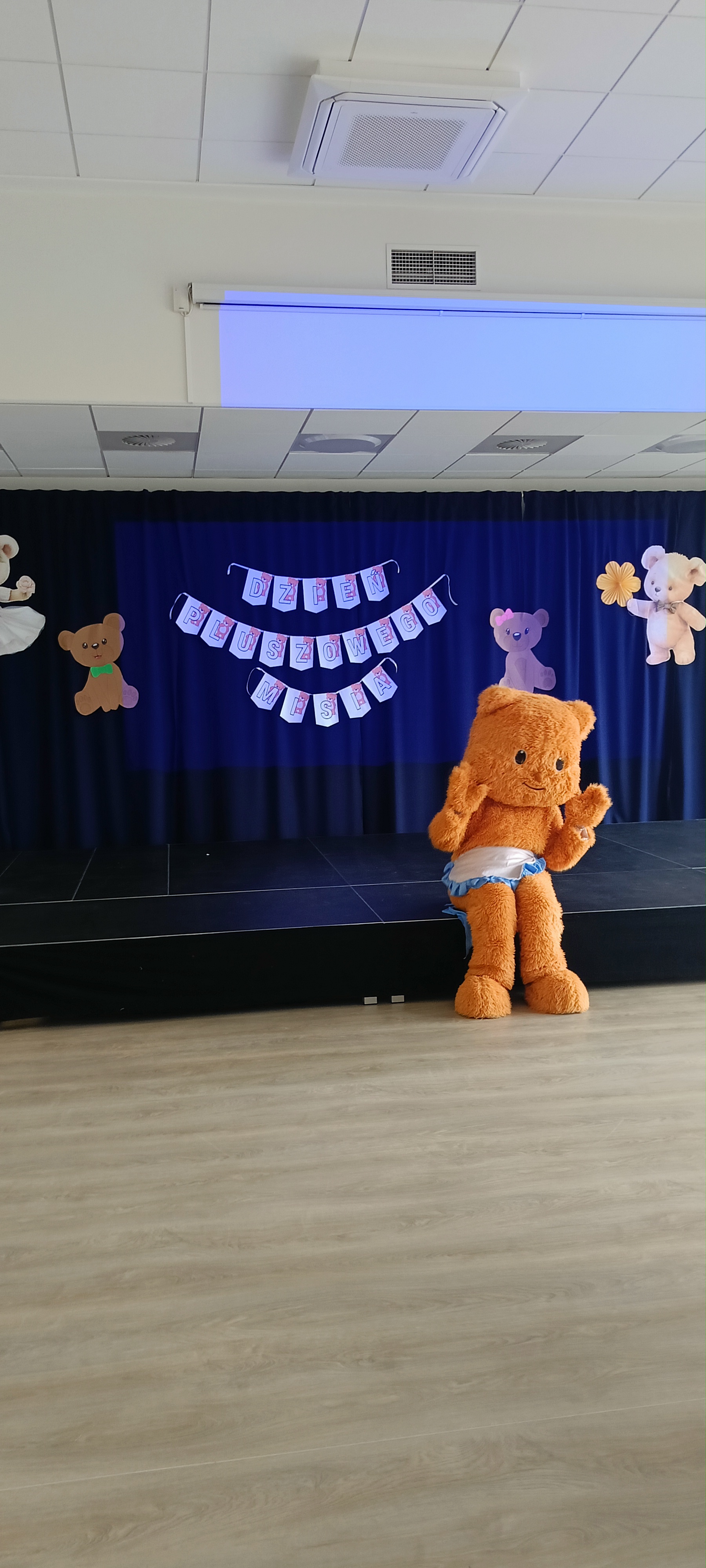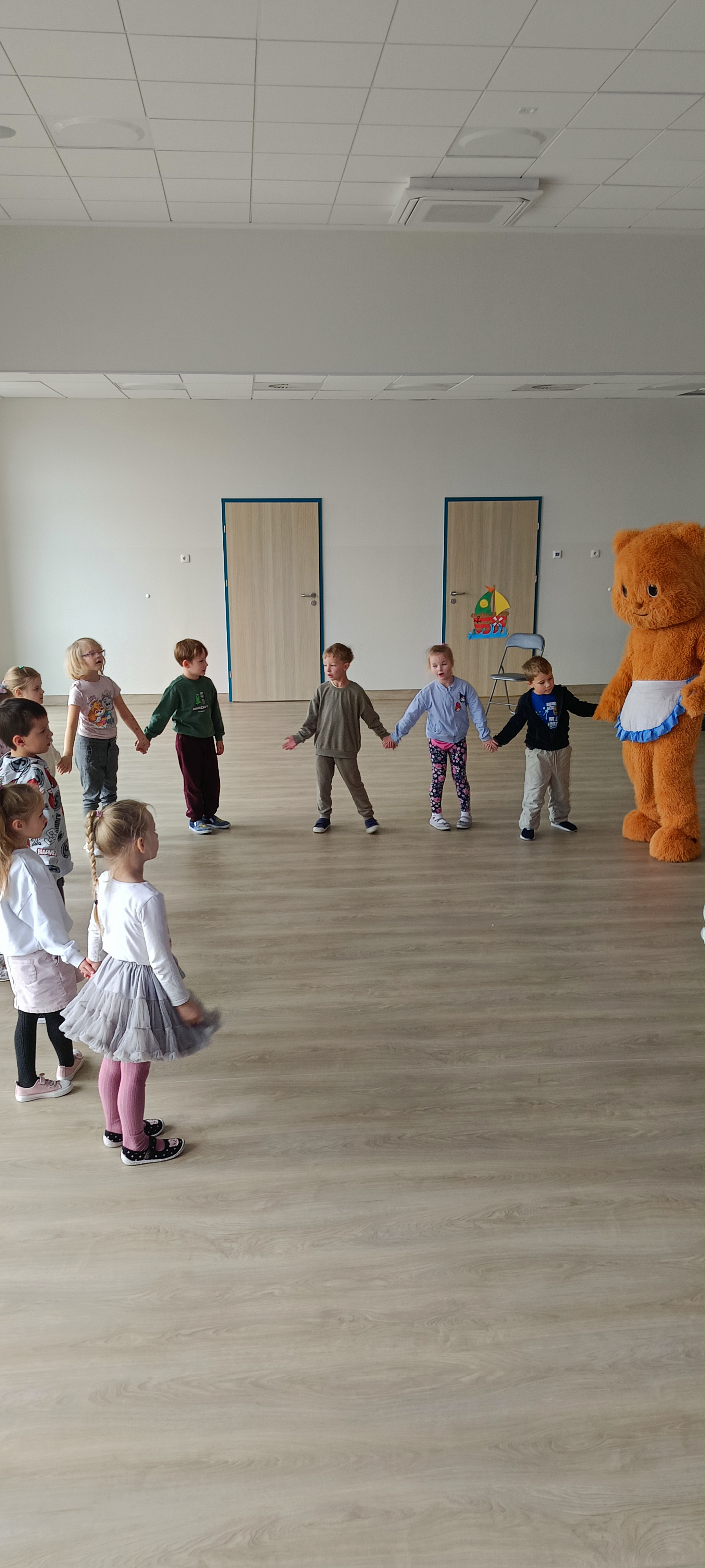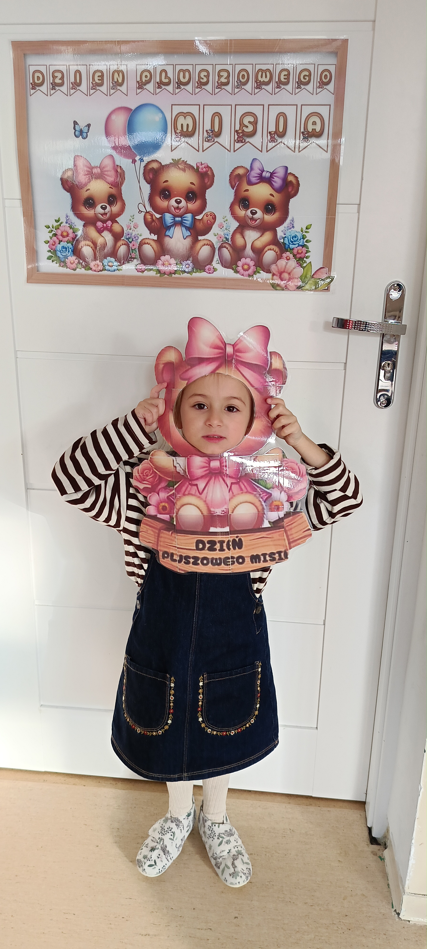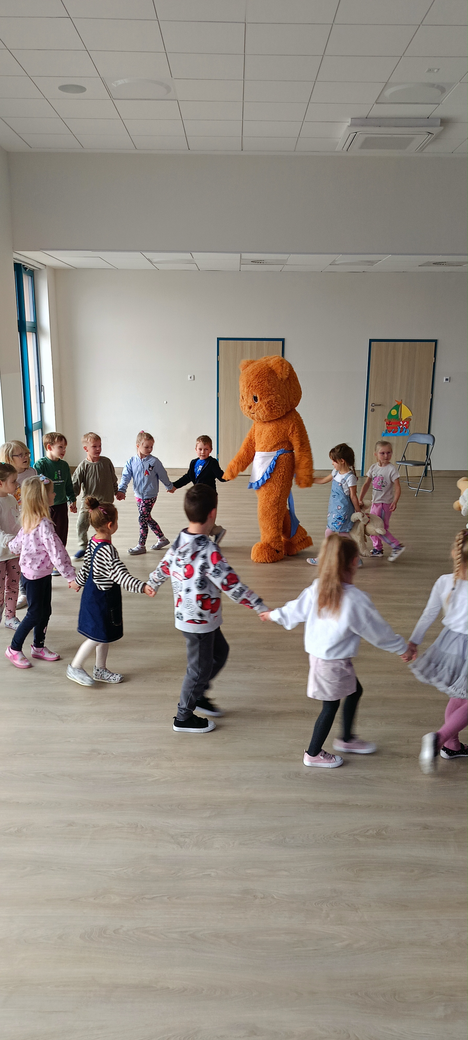 Dziś odwiedziliśmy w przedszkolu solenizanta dnia - pluszowego misia. Wszyscy razem od tańczyliśmy z nim taniec, odśpiewaliśmy sto lat zrobiliśmy wspólne zdjęcie. W klasie również obchodziliśmy dzień misia tworząc pacynkę misia, kolorując i przebierając się.