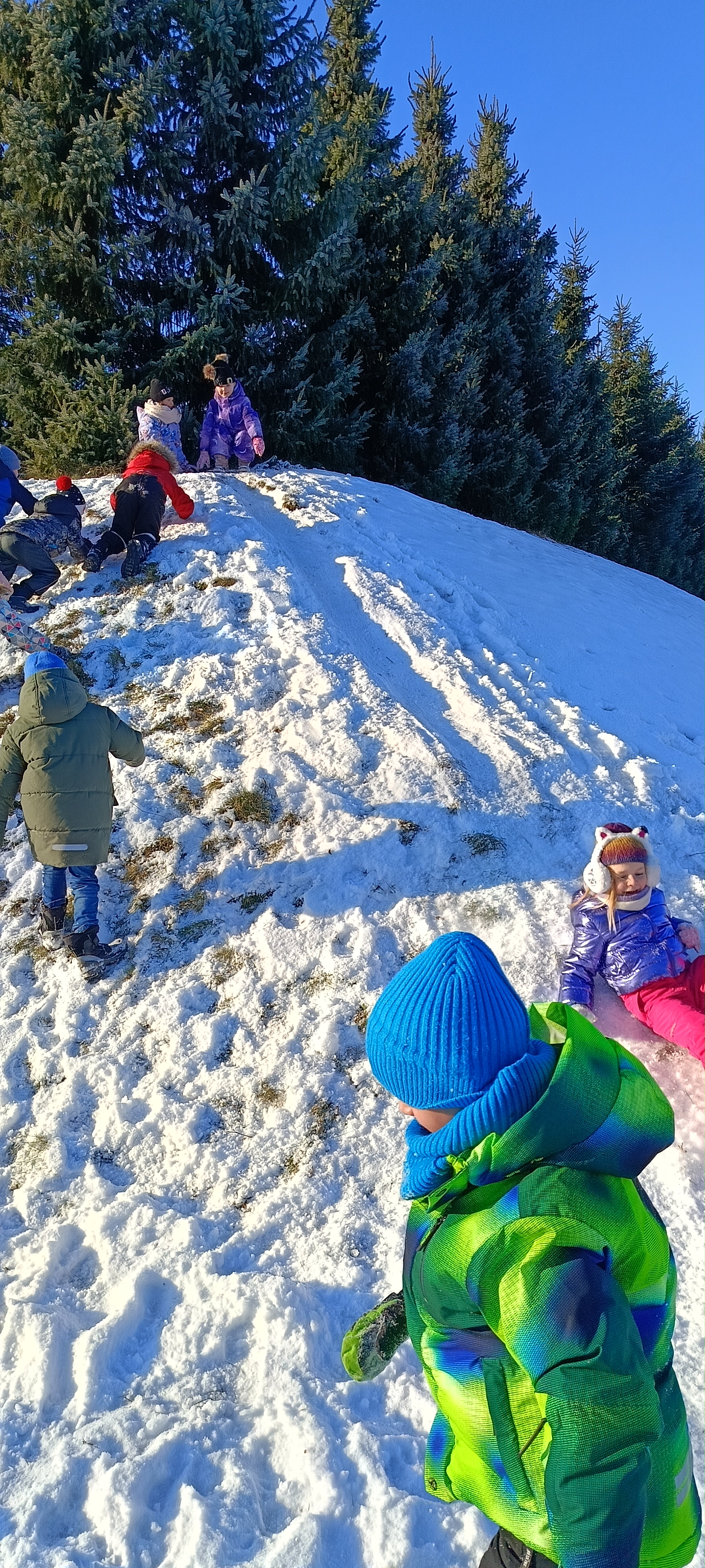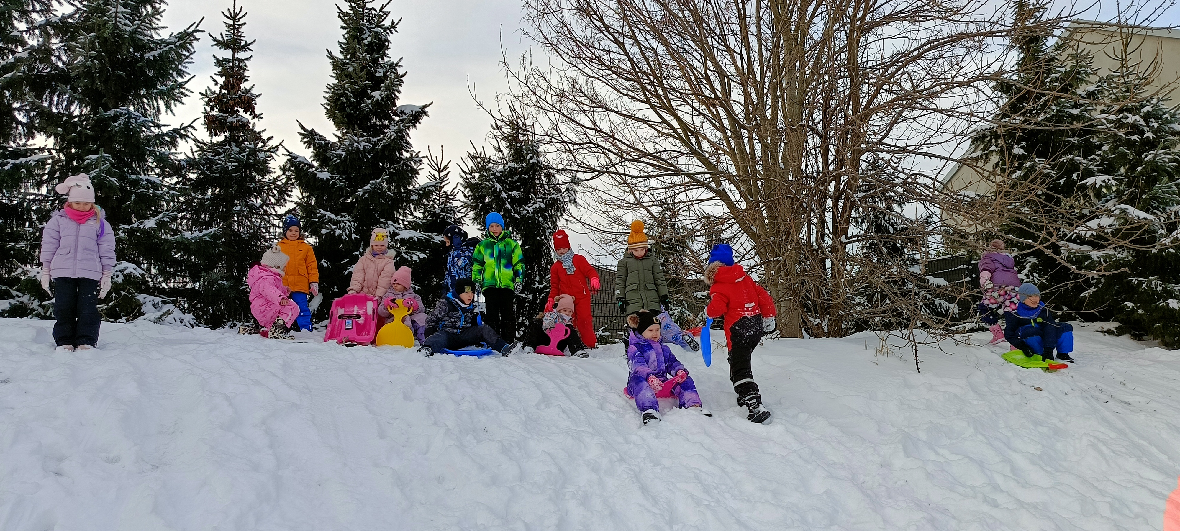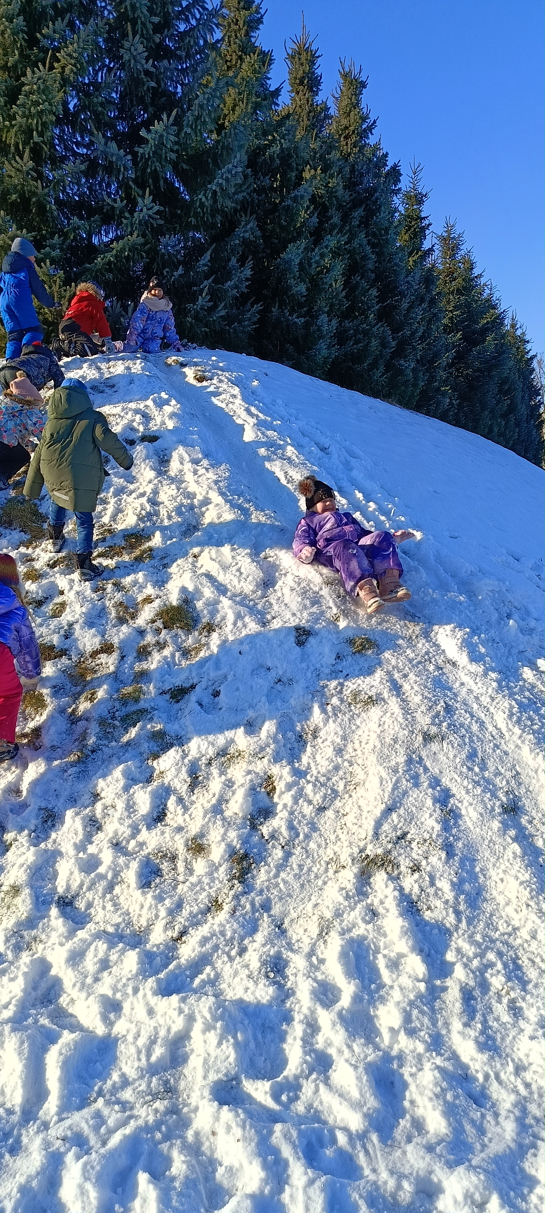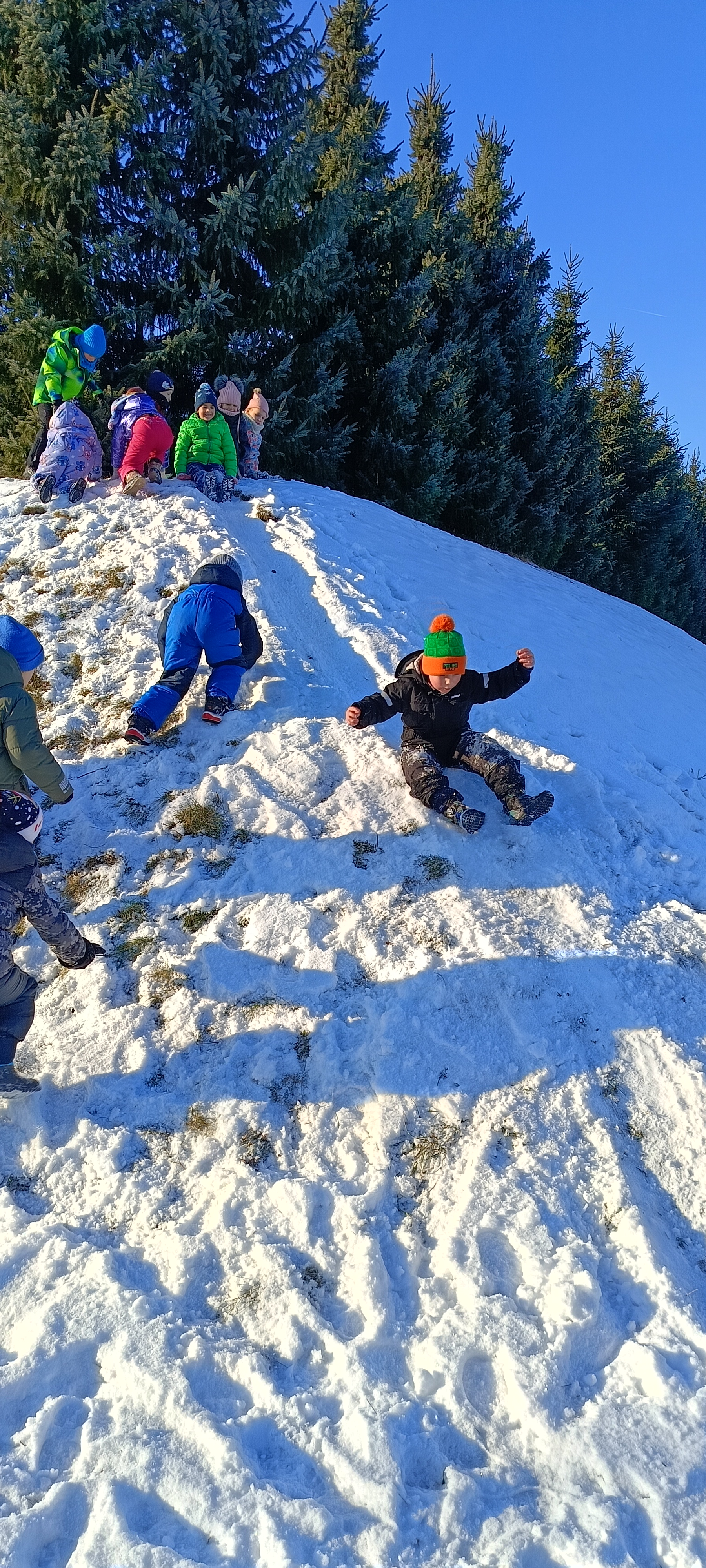 My się zimy nie boimy i na sanki wciąż chodzimy. Zima nam nie straszna a zjazdy z górki sprawiają tyle radości, że ciepło ubrane bursztynki zdobywają wszystkie możliwe górki w okolicy.