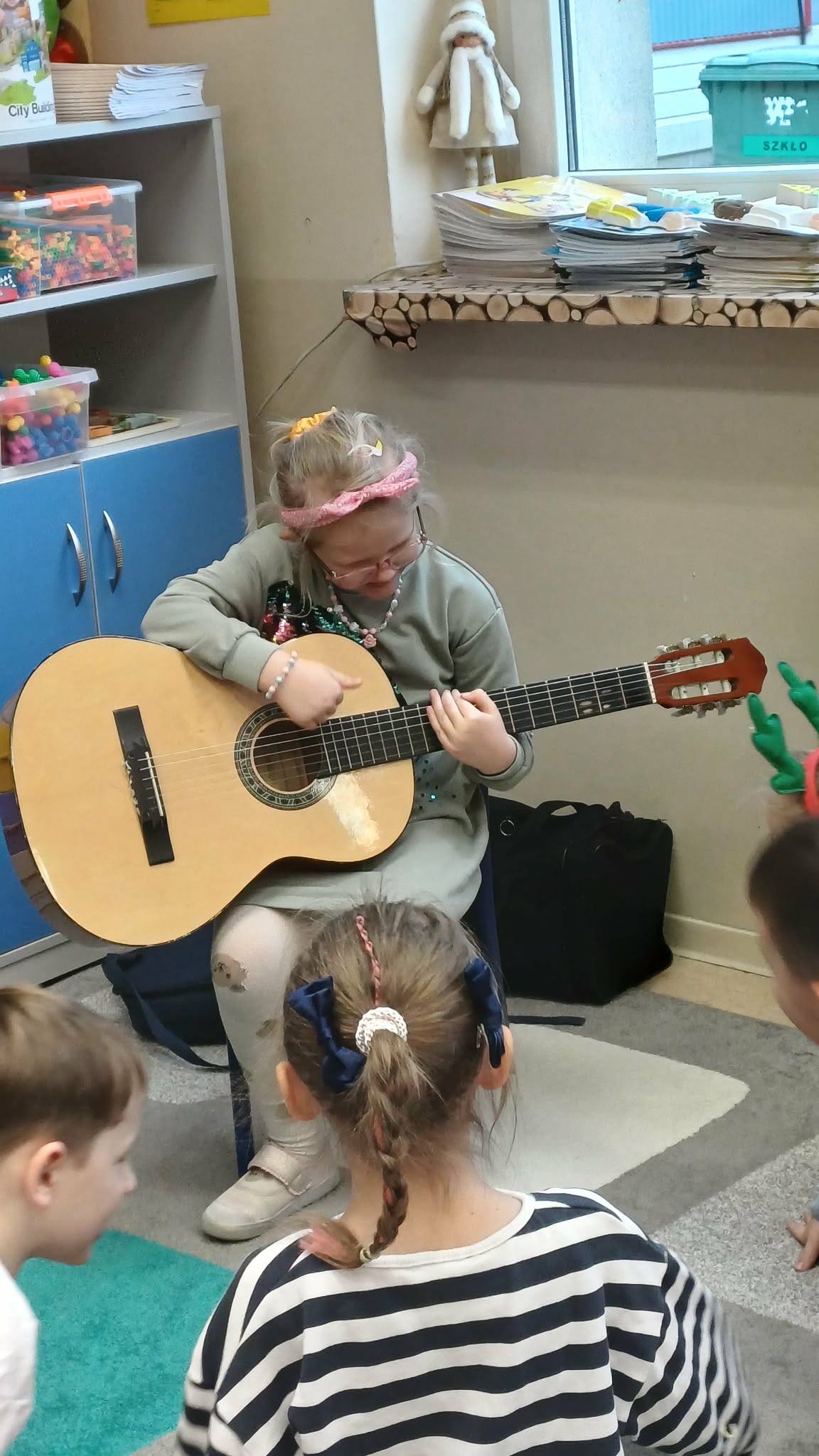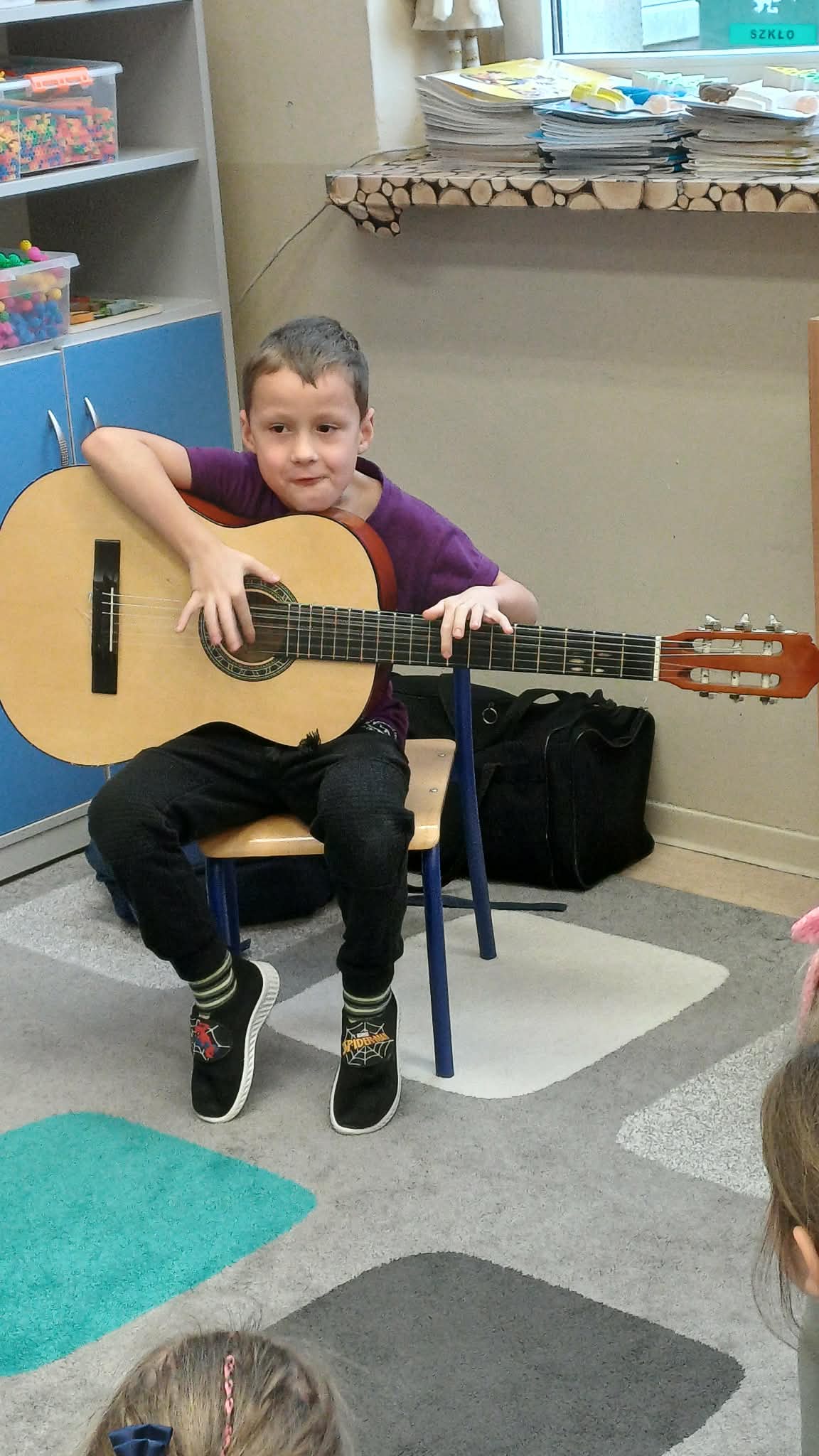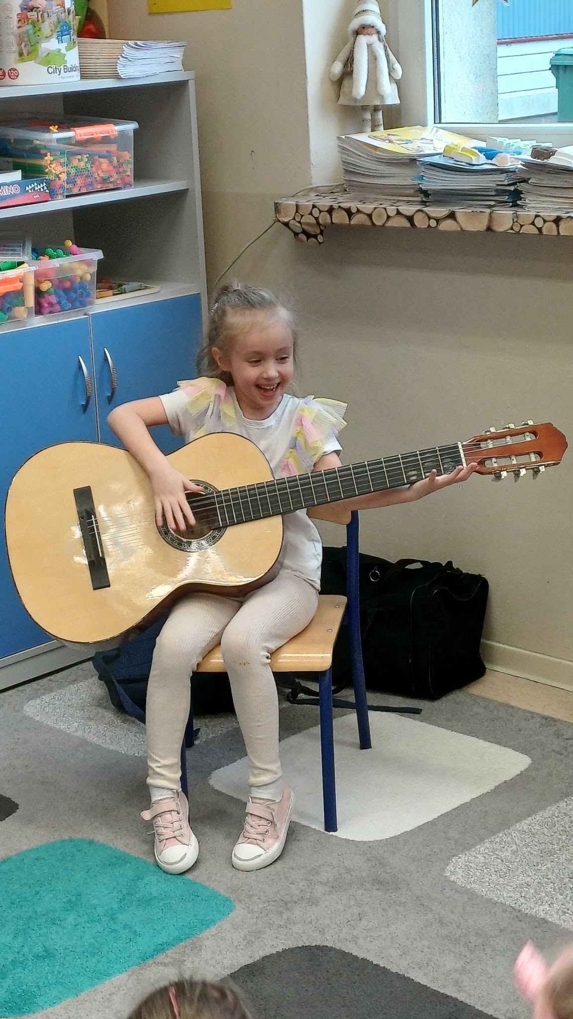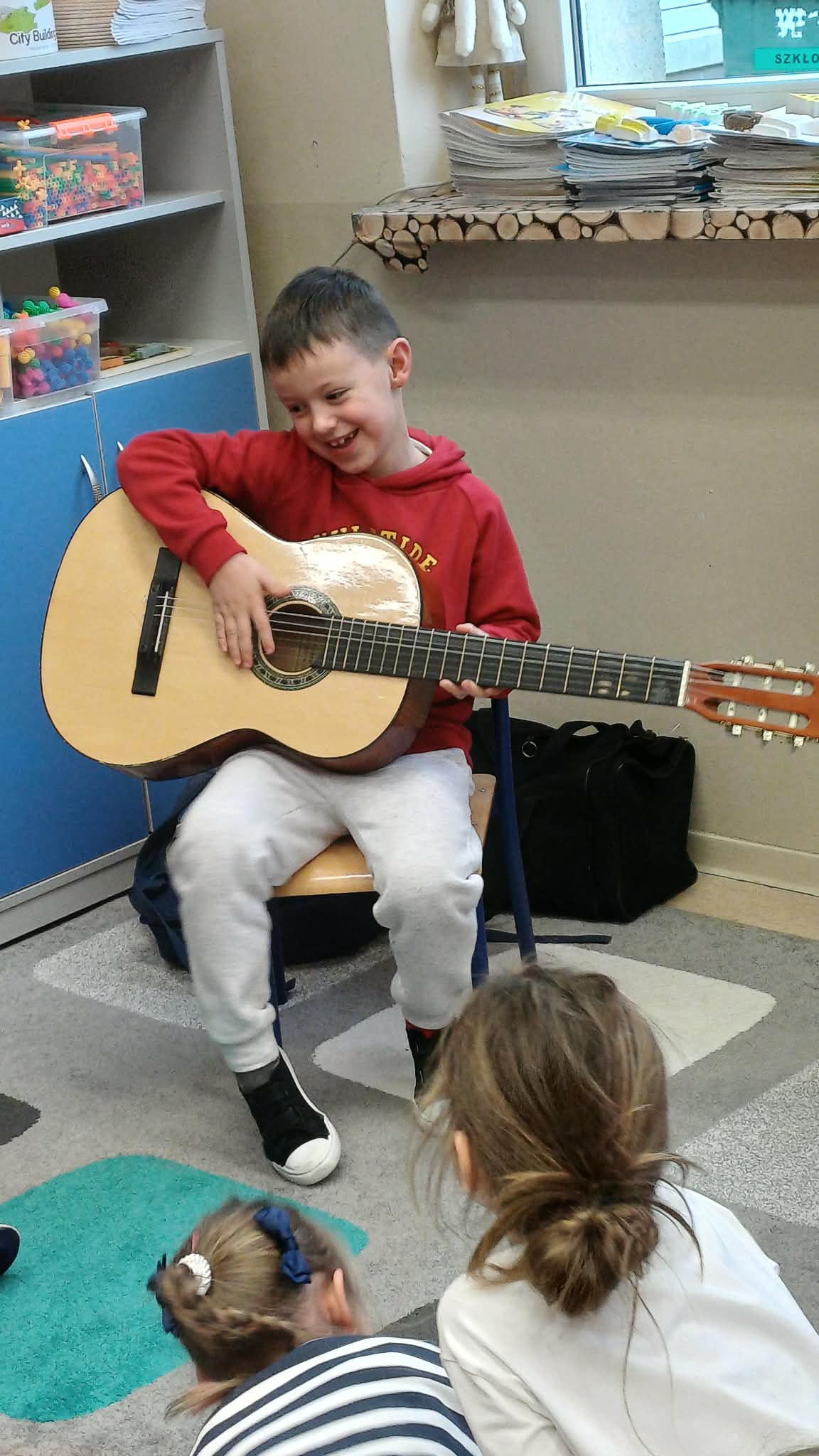 A w ciepłej sali na zajęciach z rytmiki dzieciaki grają na instrumentach i super się bawią.
