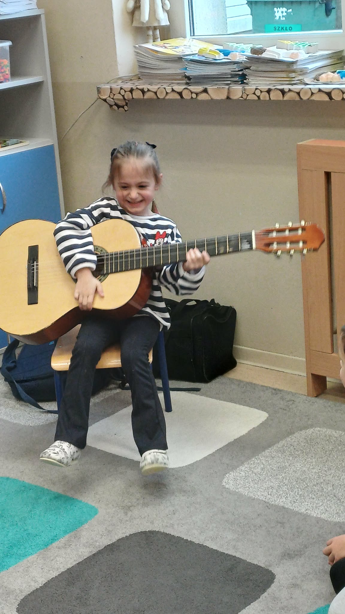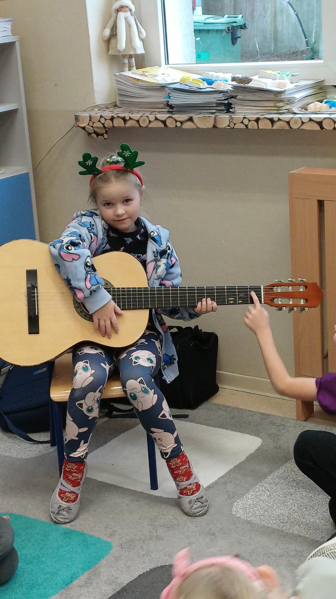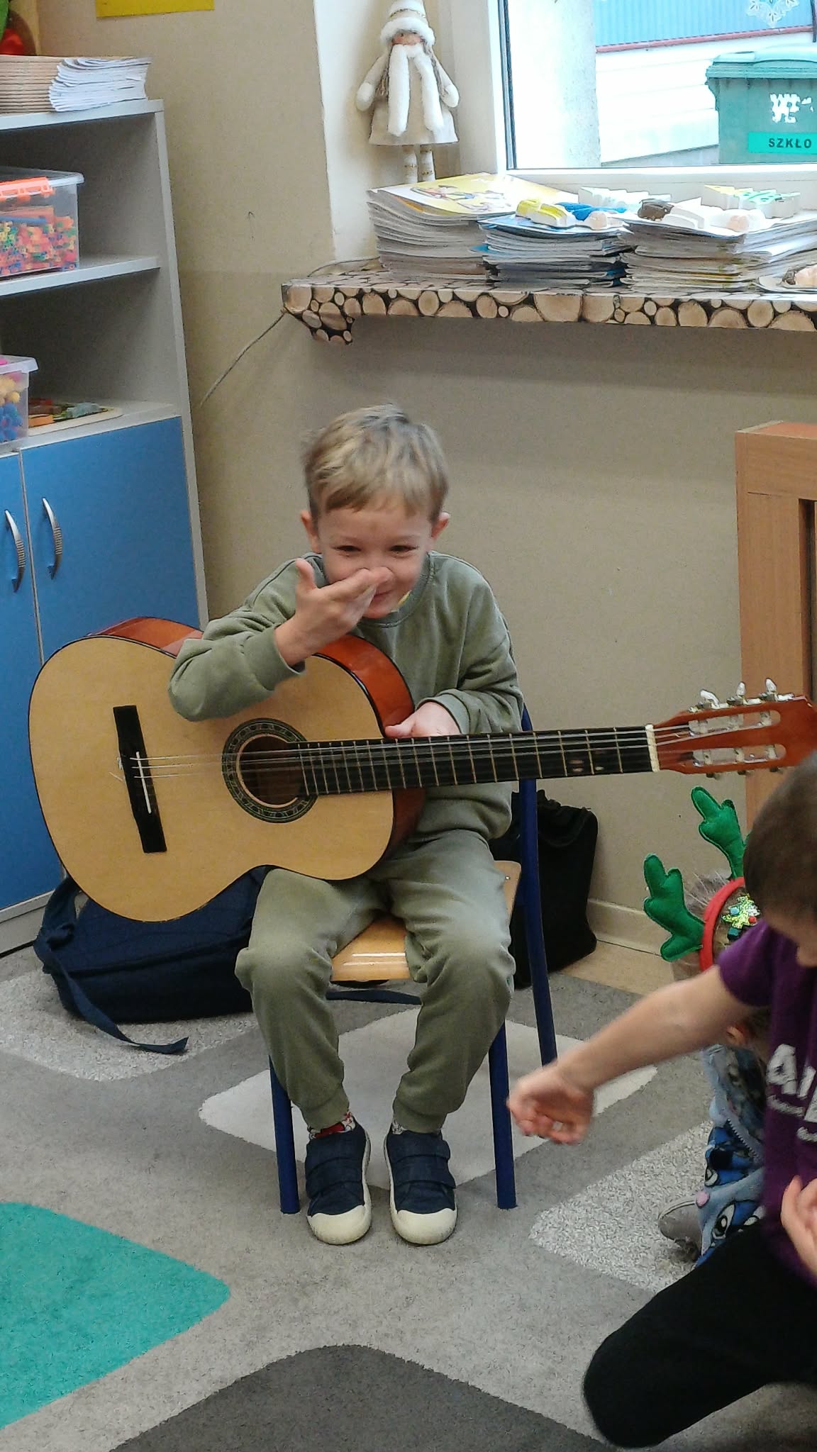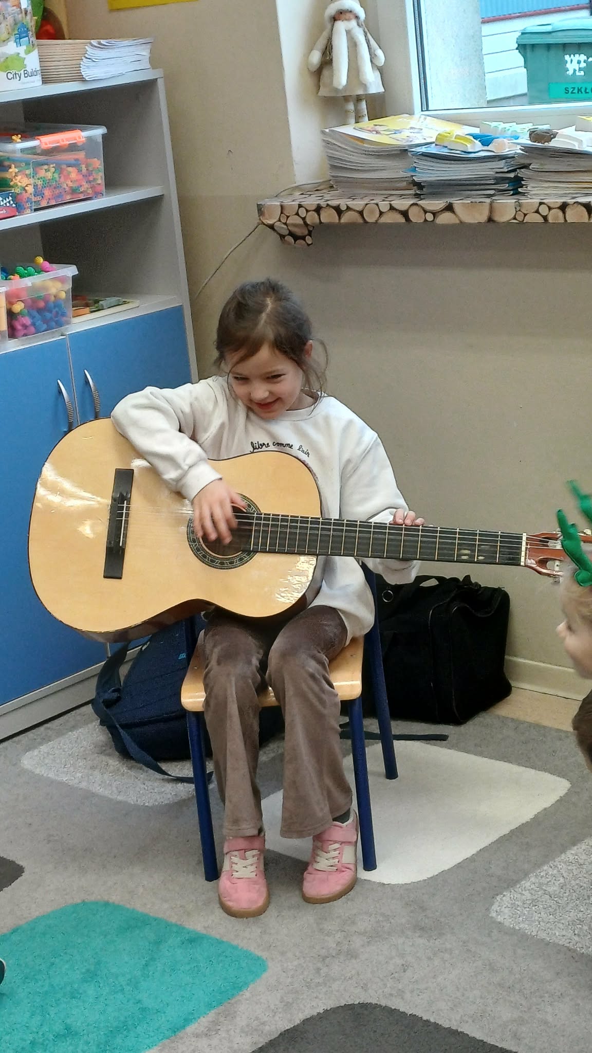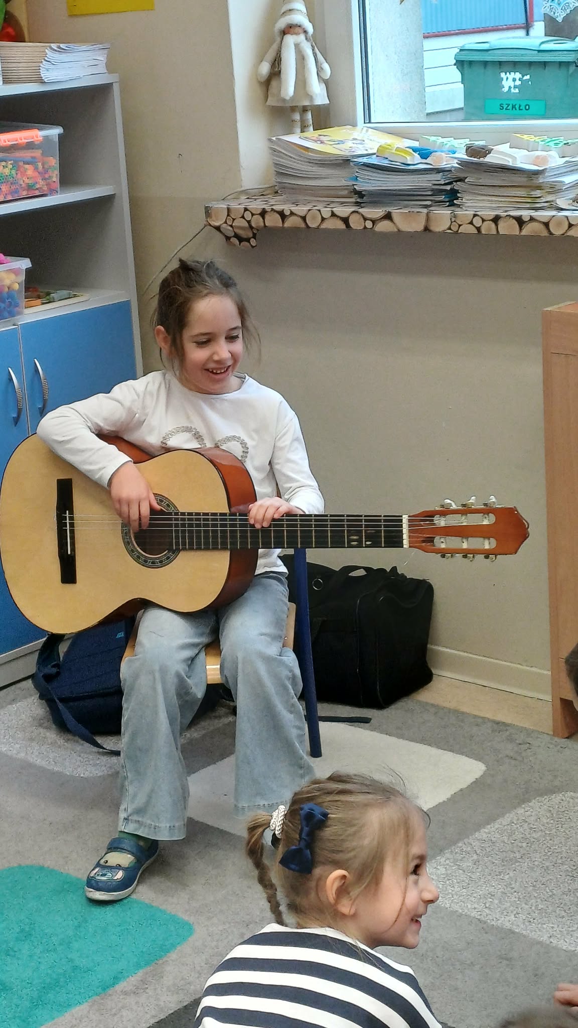A w ciepłej sali na zajęciach z rytmiki dzieciaki grają na instrumentach i super się bawią.