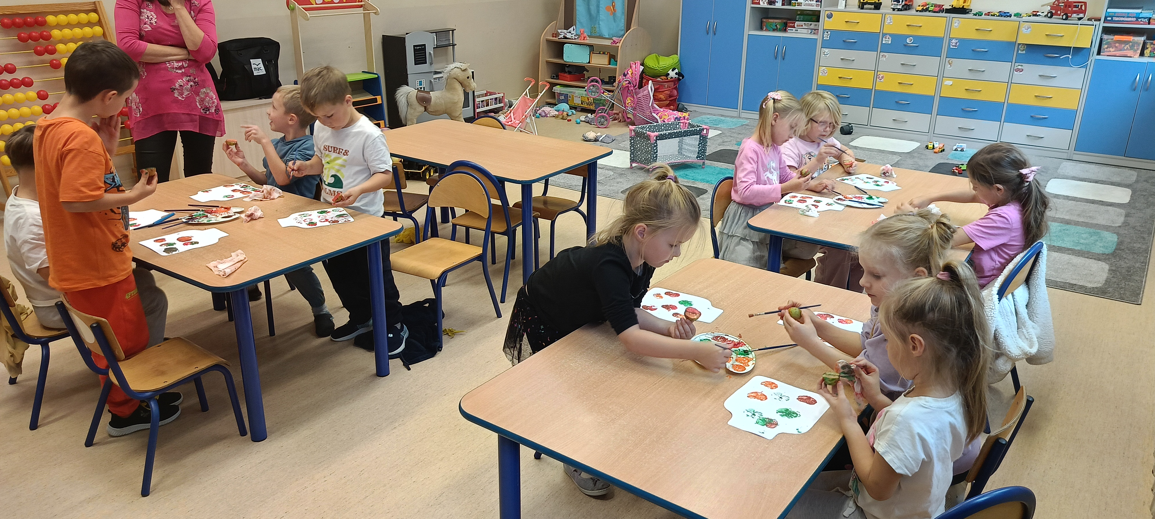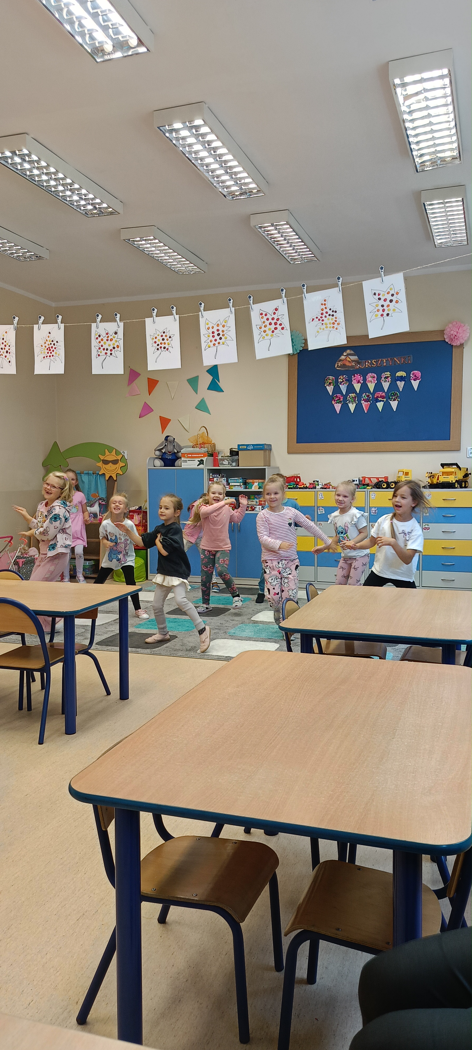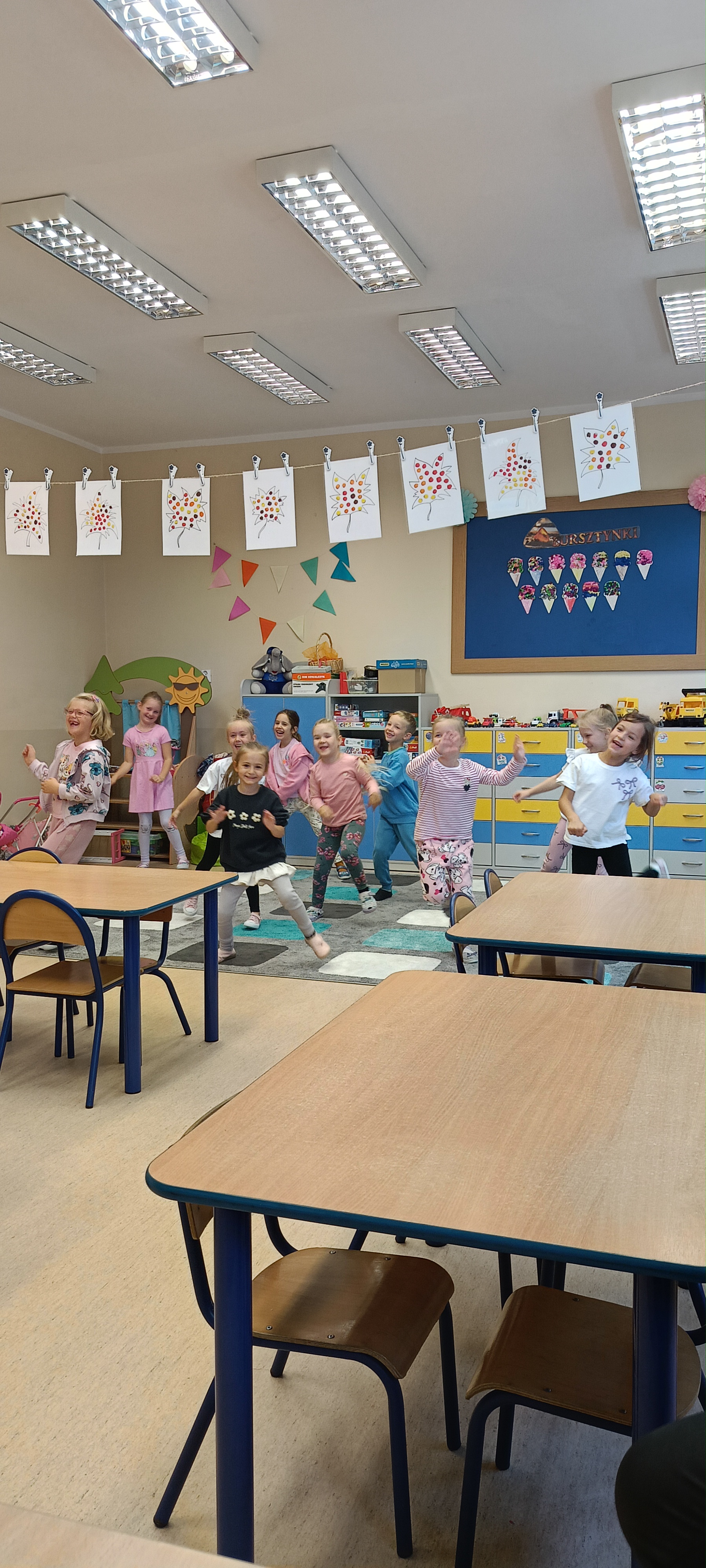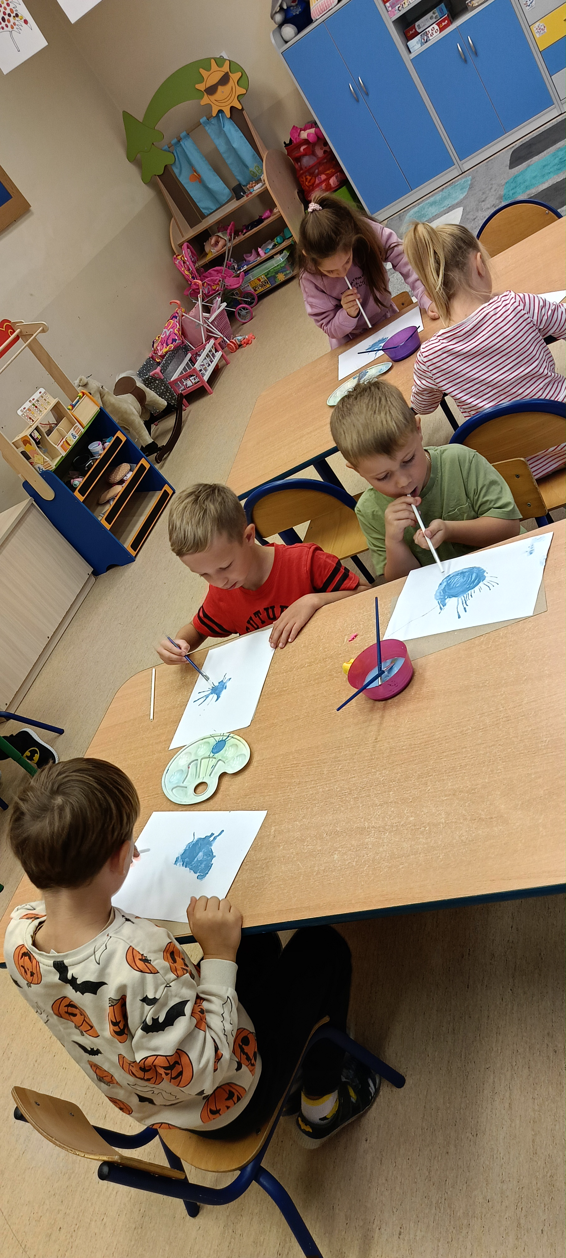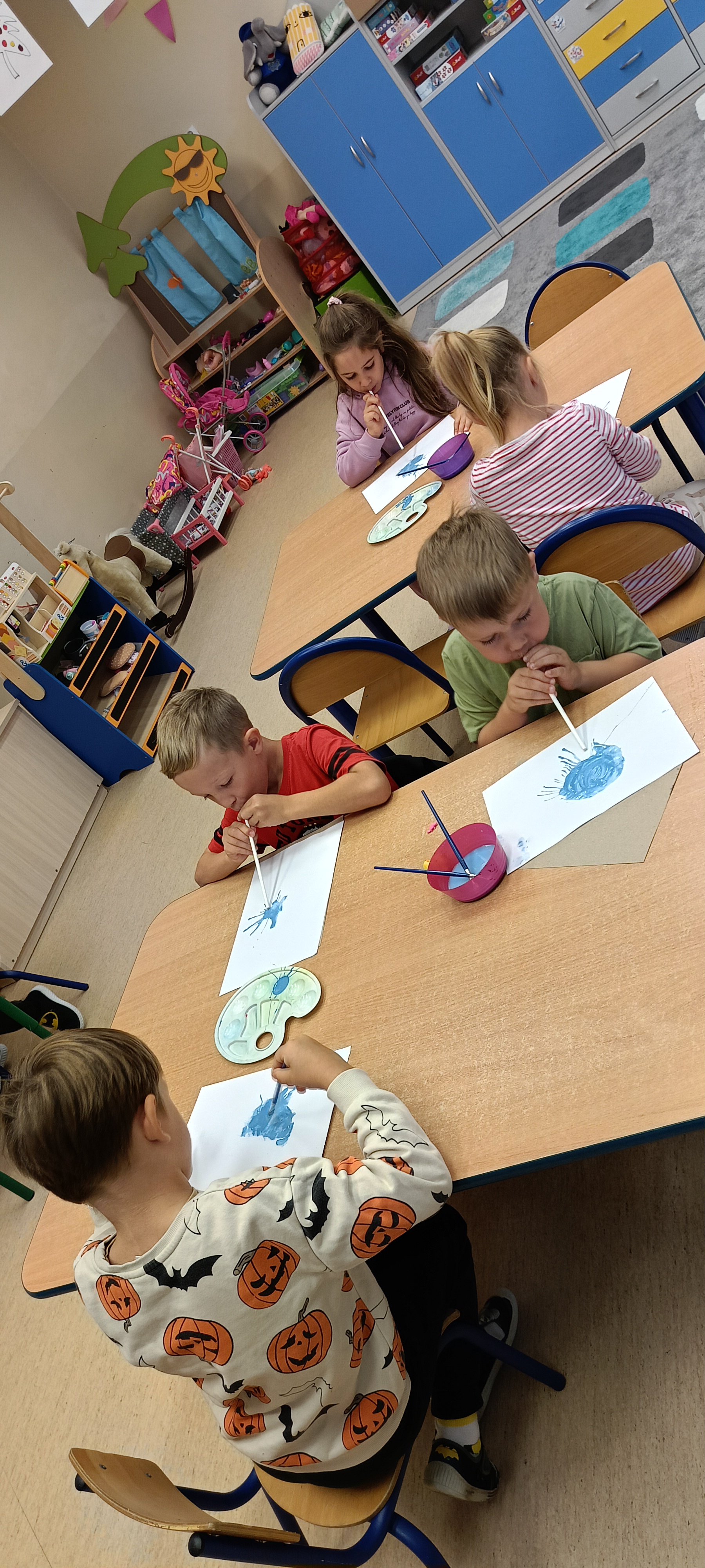 W naszej grupie Bursztynki tworzą swoje prace nie tylko za pomocą kredek i farb ale wykorzystujemy surowe jabłka, tworzymy kałuże za pomocą farb i słomek oraz wydzieranek. Dzieci są bardzo zdolne i kreatywne w różnych dziedzinach: plastycznych, muzycznych, edukacyjnych jak i w zabawach dowolnych.