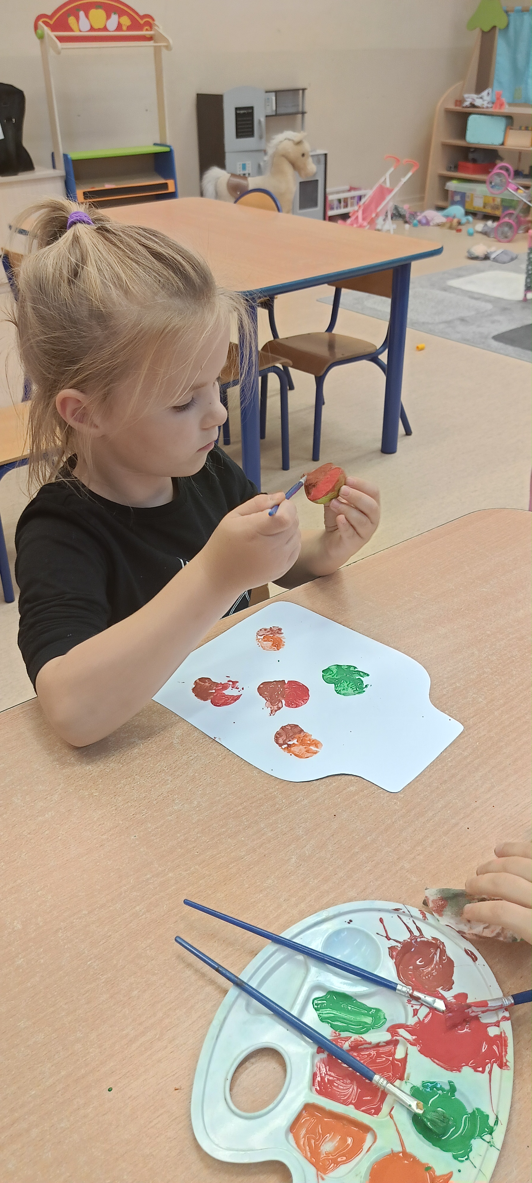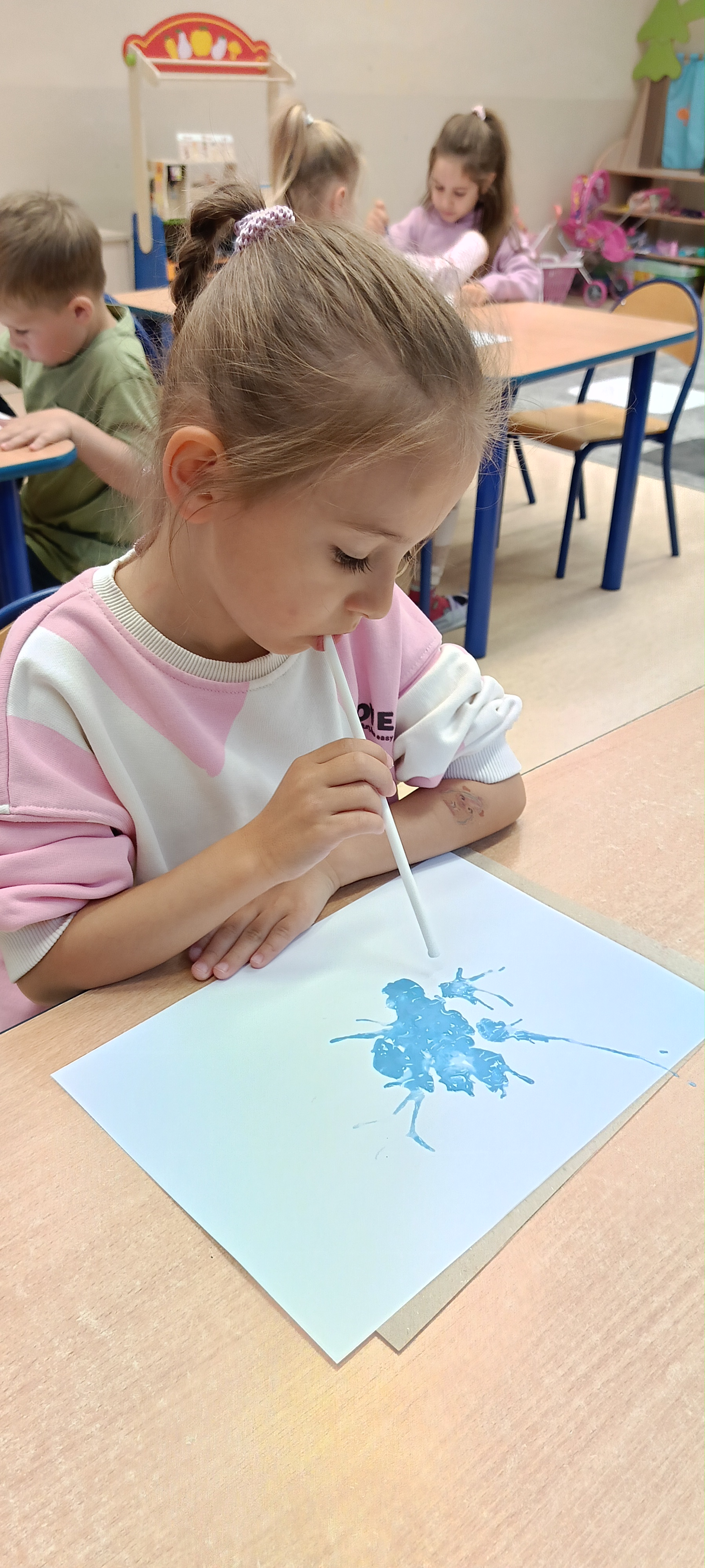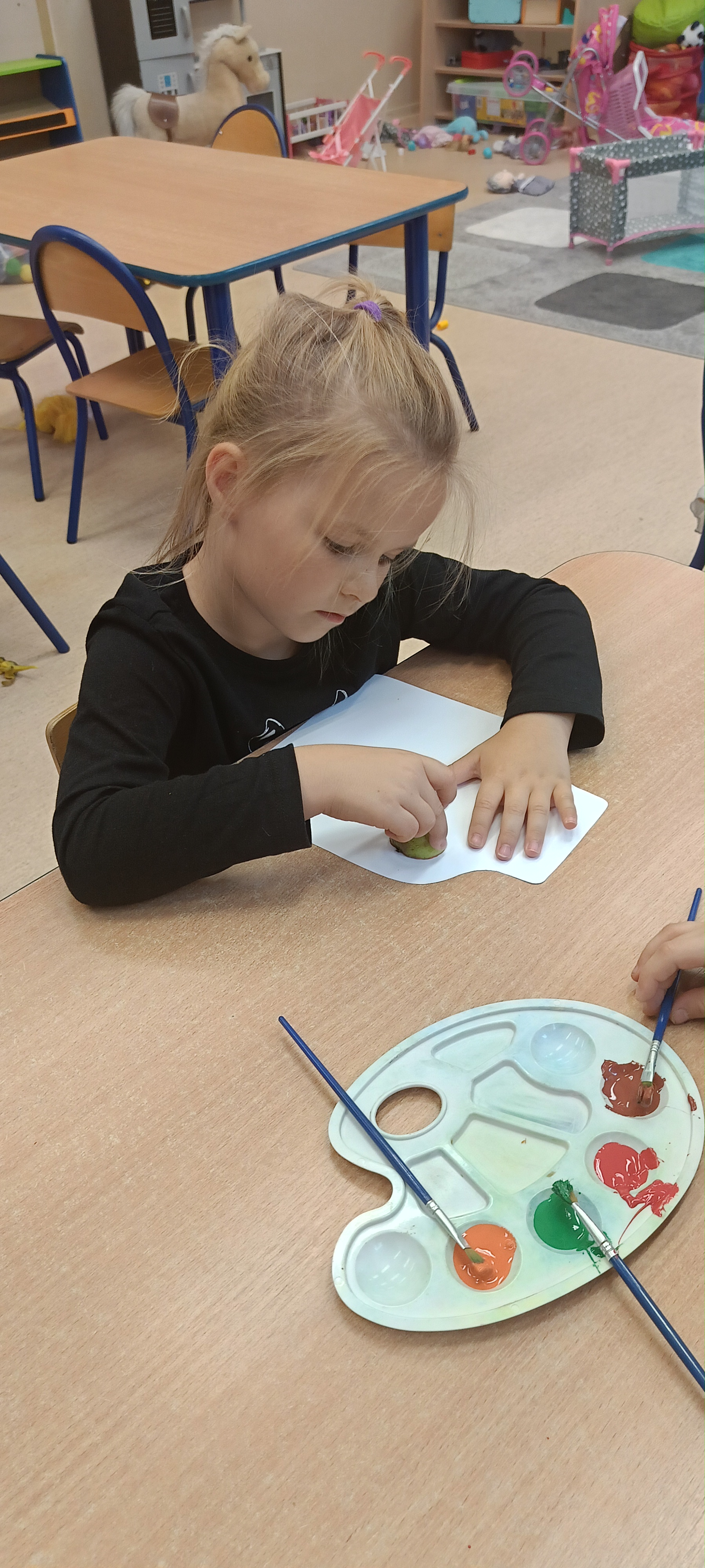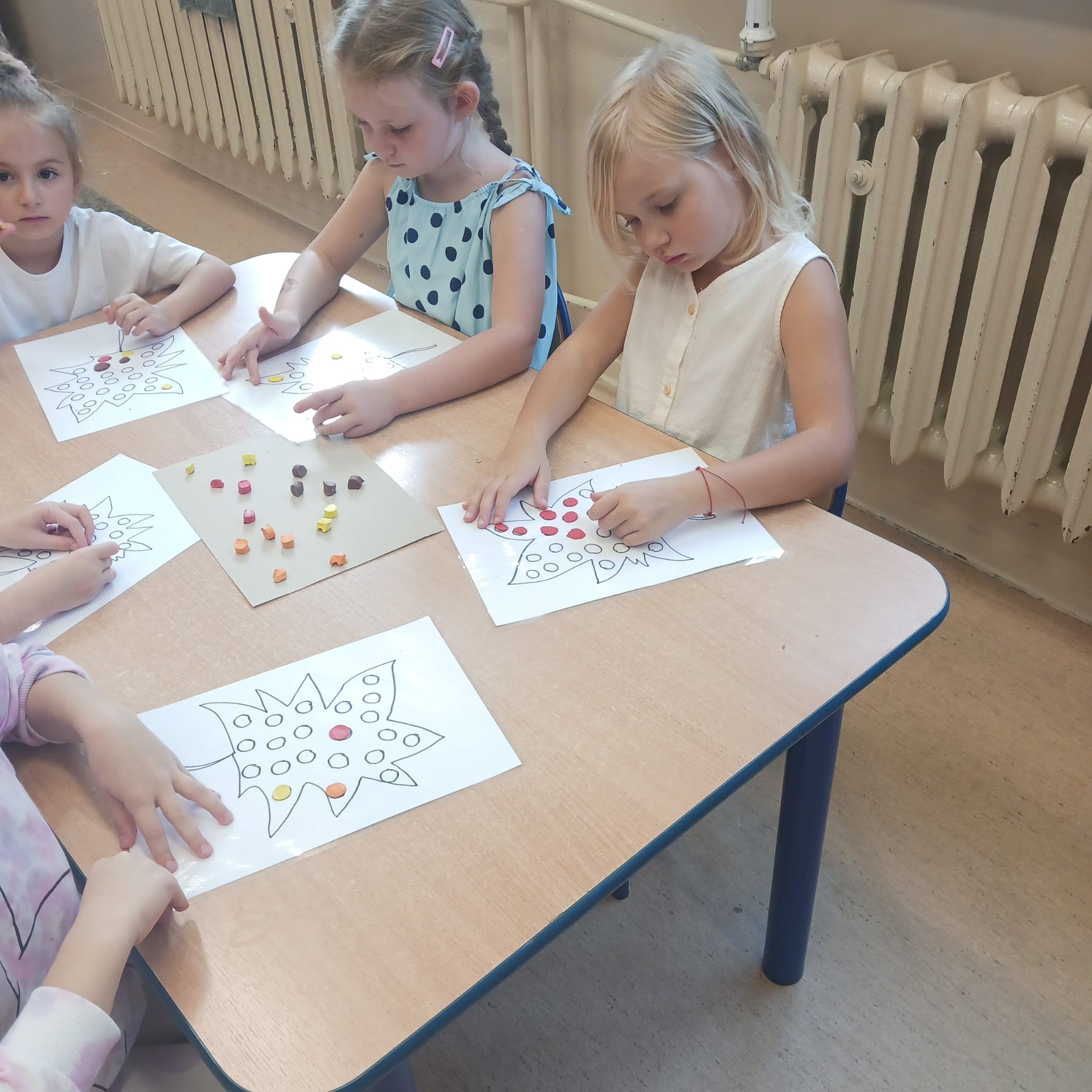 W naszej grupie Bursztynki tworzą swoje prace nie tylko za pomocą kredek i farb ale wykorzystujemy surowe jabłka, tworzymy kałuże za pomocą farb i słomek oraz wydzieranek. Dzieci są bardzo zdolne i kreatywne w różnych dziedzinach: plastycznych, muzycznych, edukacyjnych jak i w zabawach dowolnych.