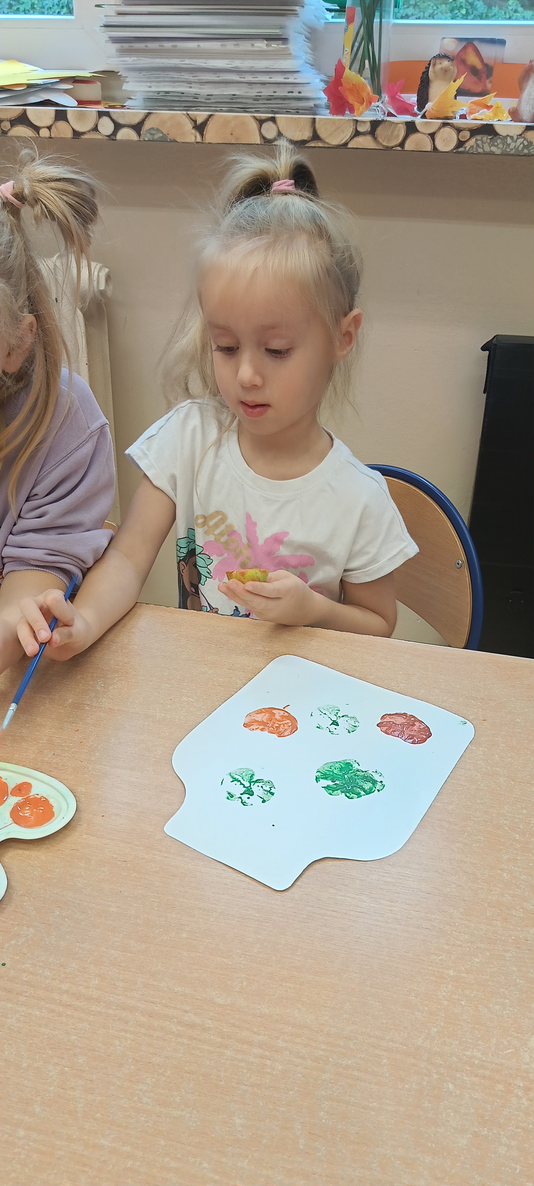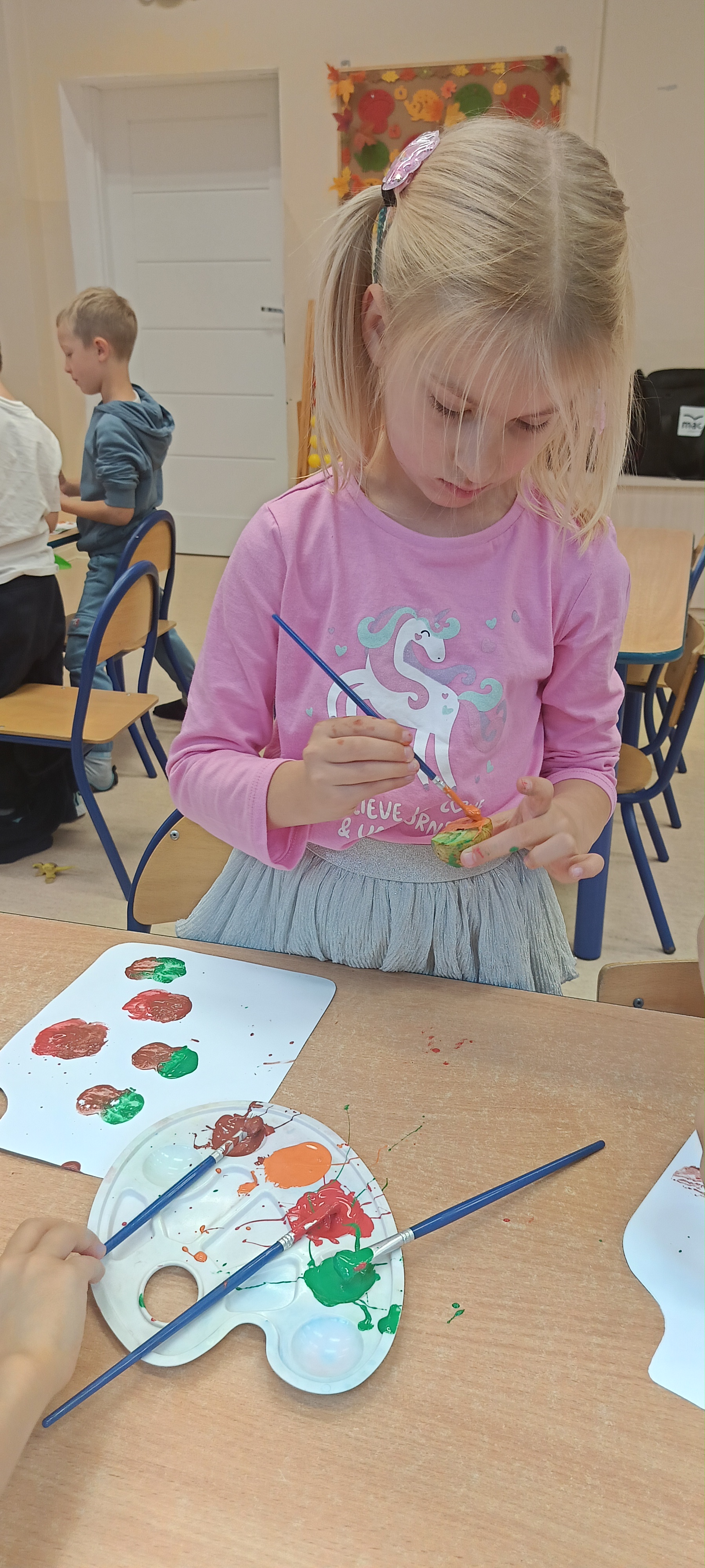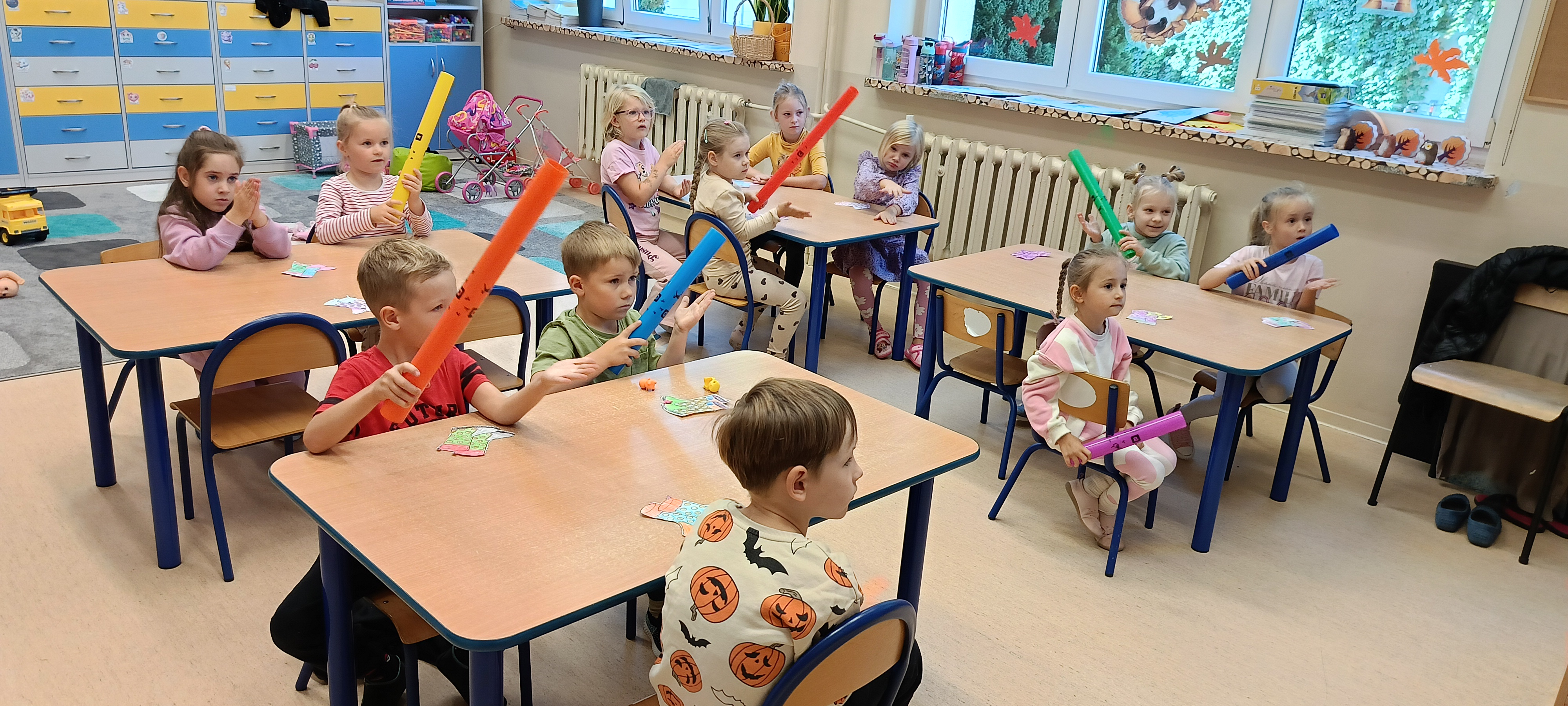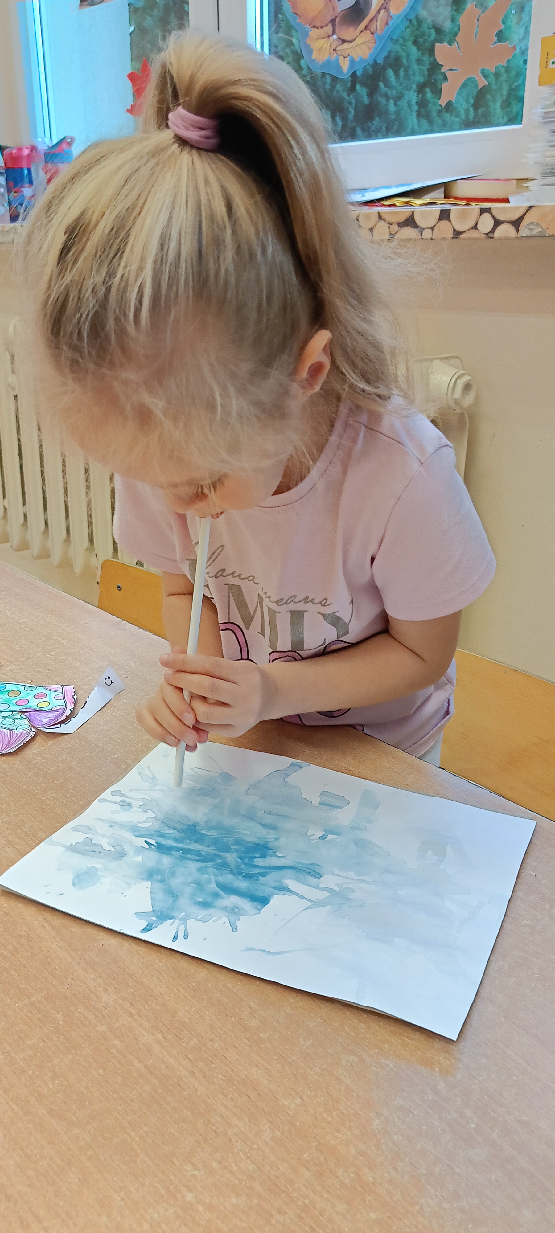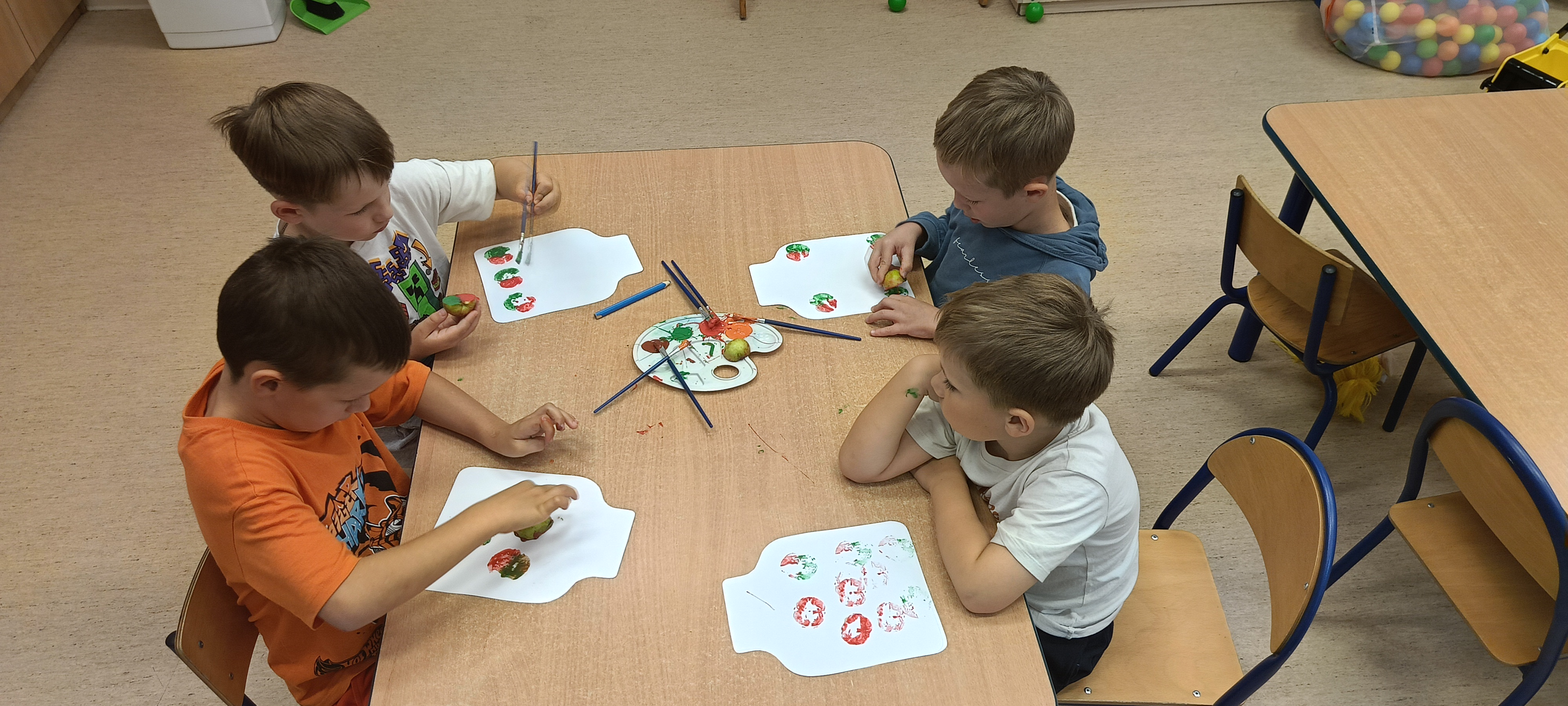 W naszej grupie Bursztynki tworzą swoje prace nie tylko za pomocą kredek i farb ale wykorzystujemy surowe jabłka, tworzymy kałuże za pomocą farb i słomek oraz wydzieranek. Dzieci są bardzo zdolne i kreatywne w różnych dziedzinach: plastycznych, muzycznych, edukacyjnych jak i w zabawach dowolnych.