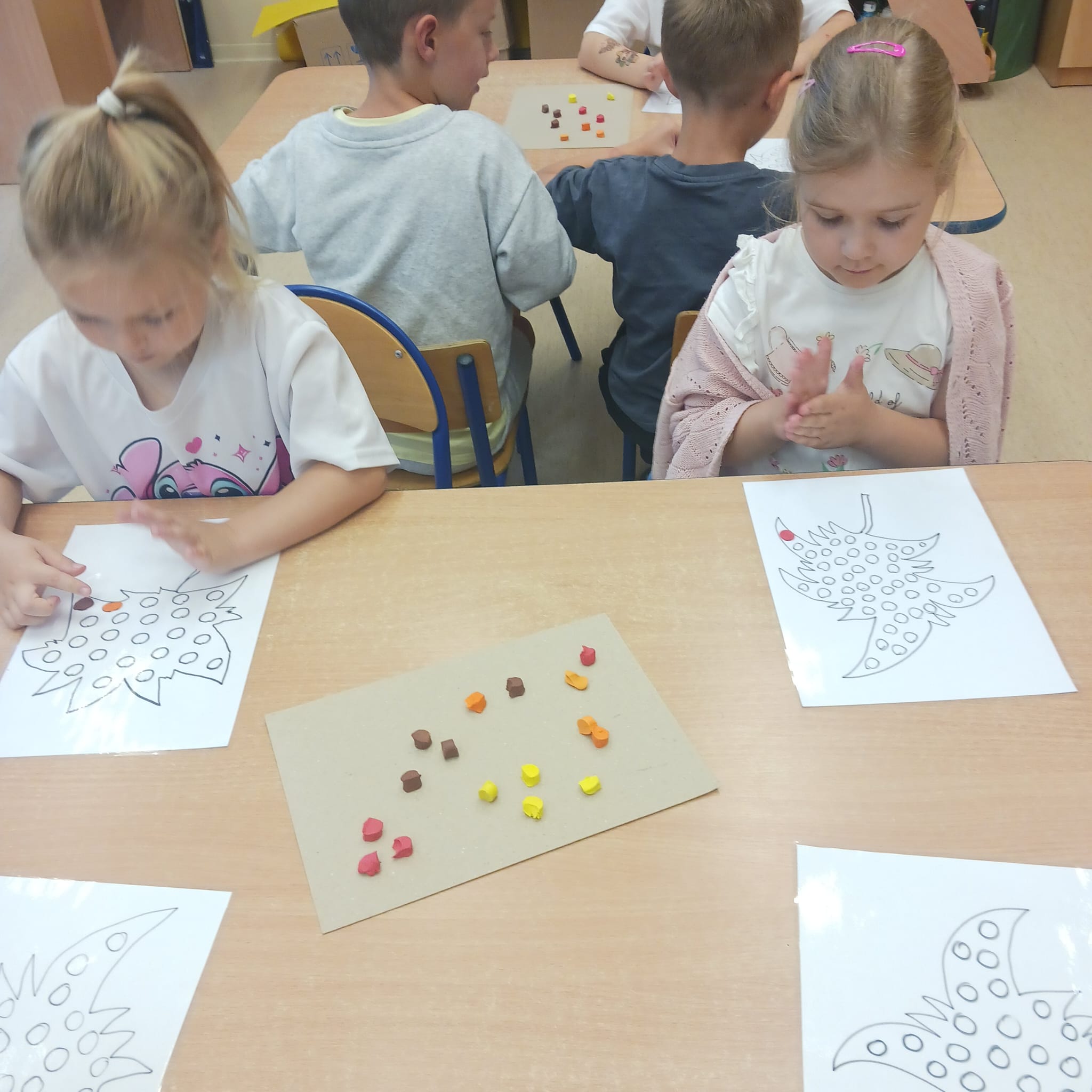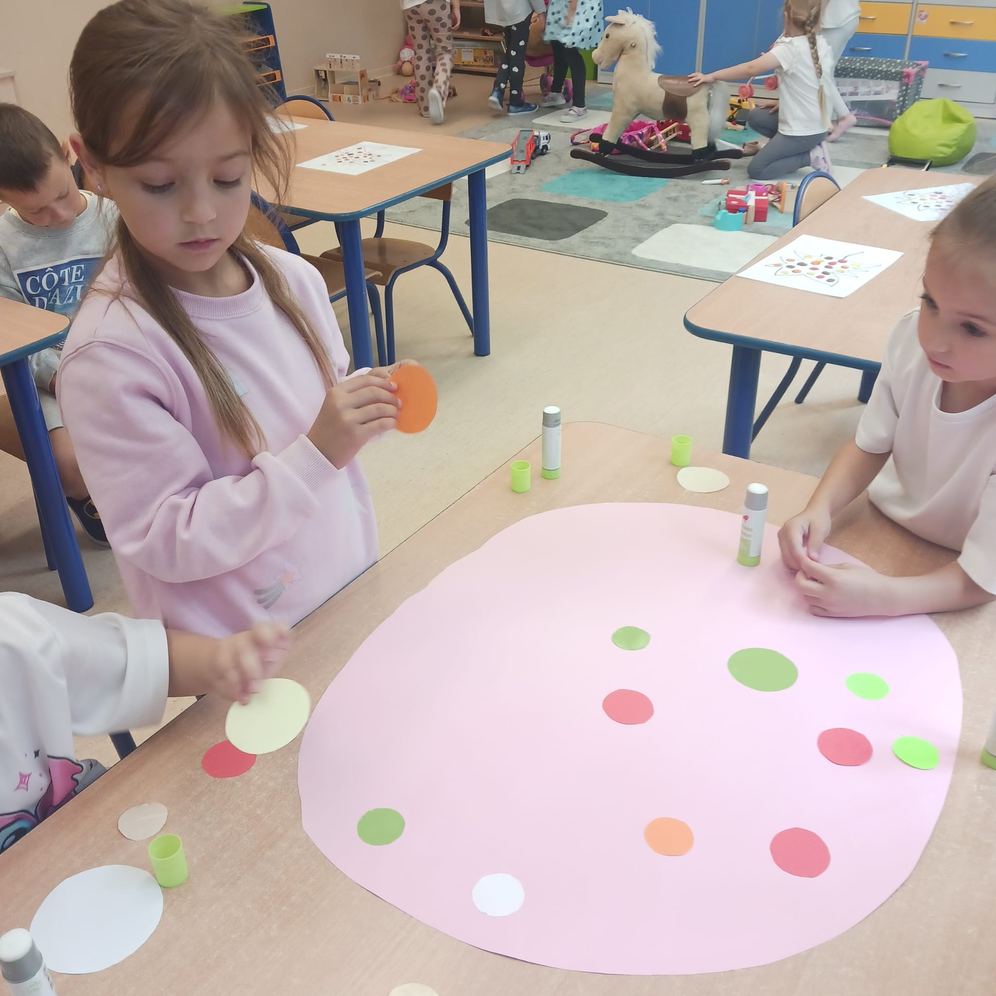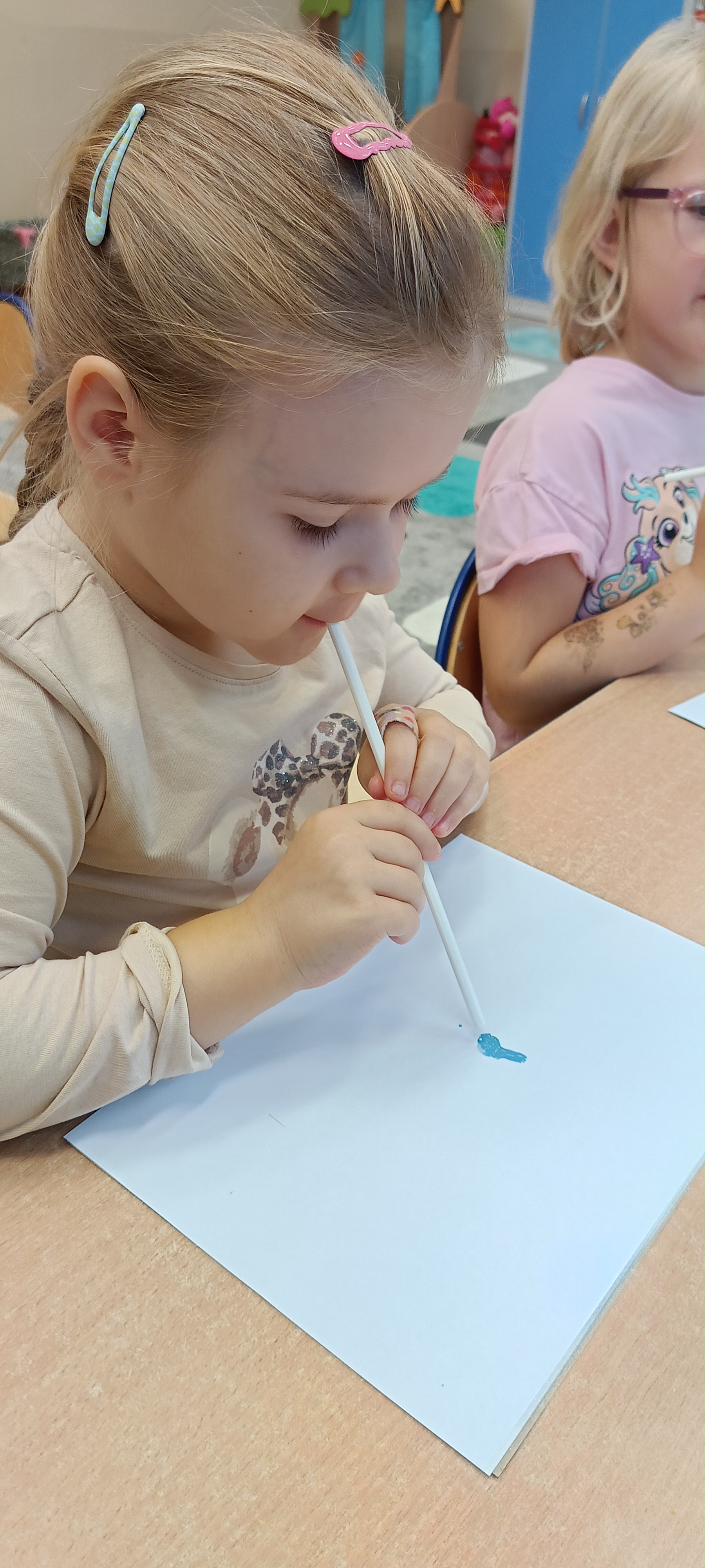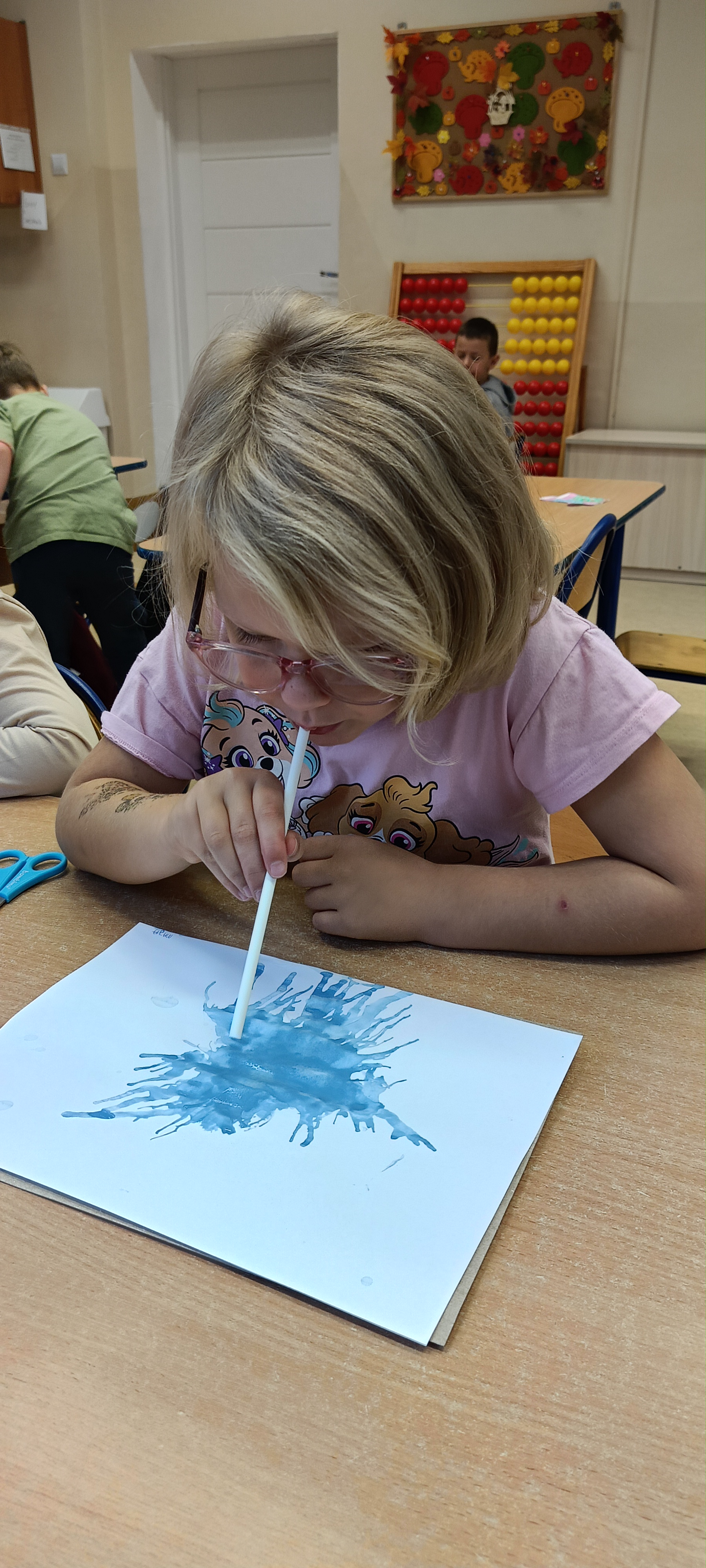 W naszej grupie Bursztynki tworzą swoje prace nie tylko za pomocą kredek i farb ale wykorzystujemy surowe jabłka, tworzymy kałuże za pomocą farb i słomek oraz wydzieranek. Dzieci są bardzo zdolne i kreatywne w różnych dziedzinach: plastycznych, muzycznych, edukacyjnych jak i w zabawach dowolnych.