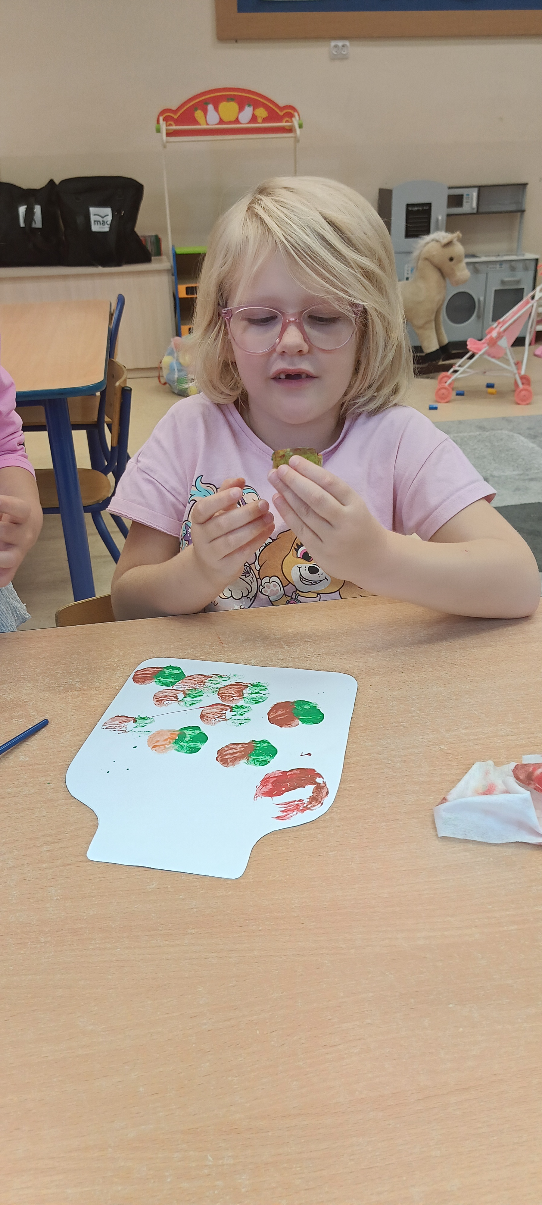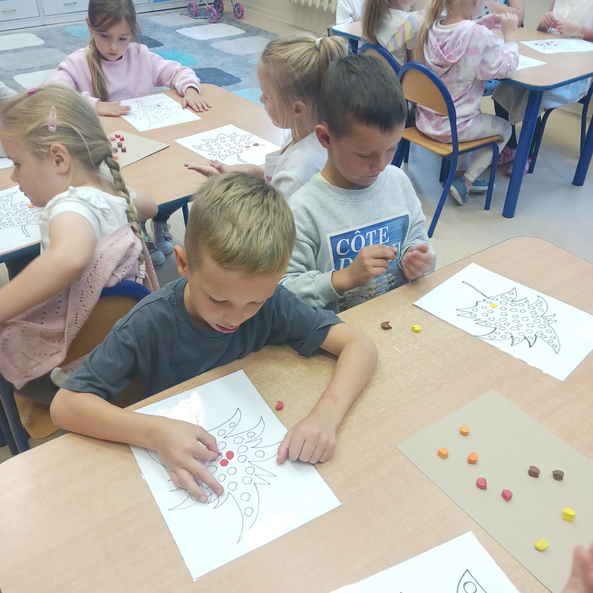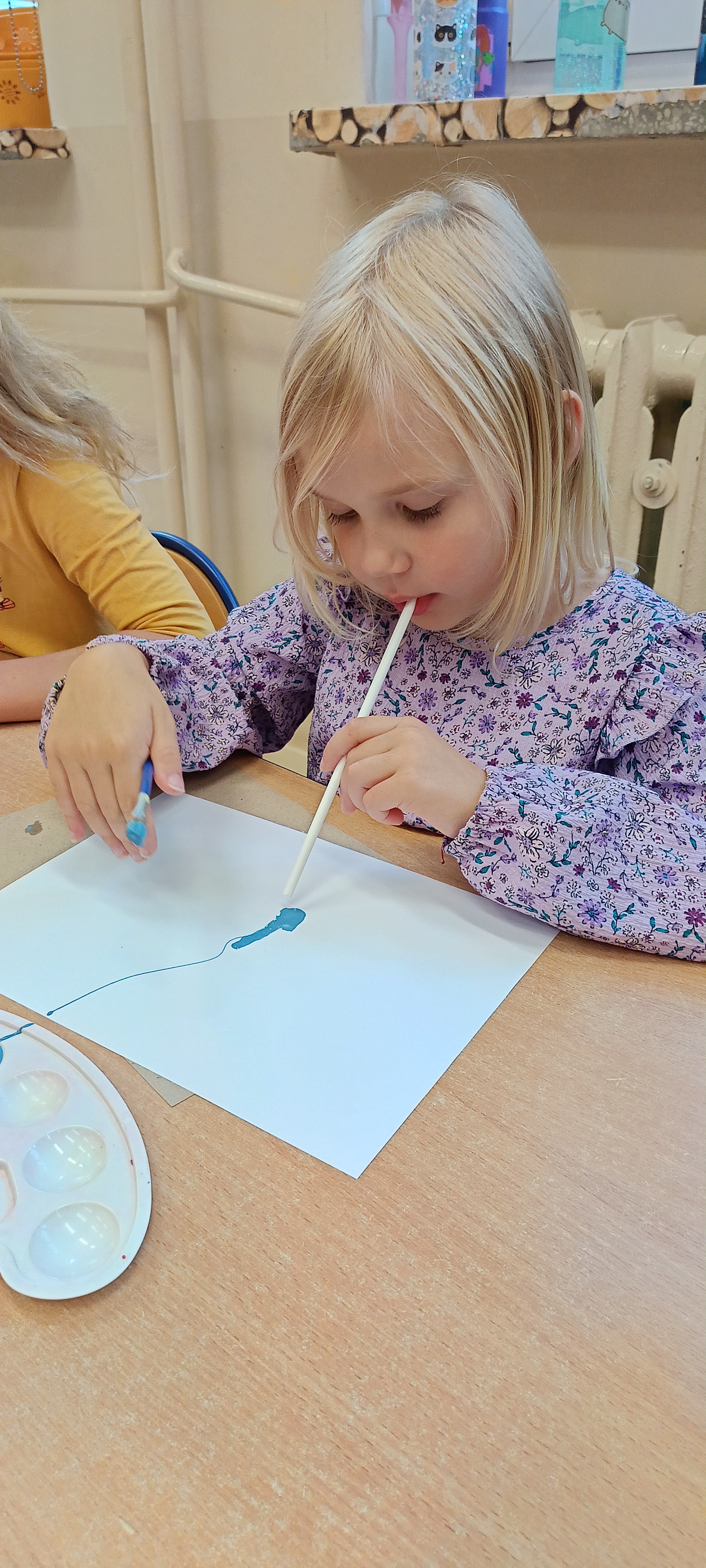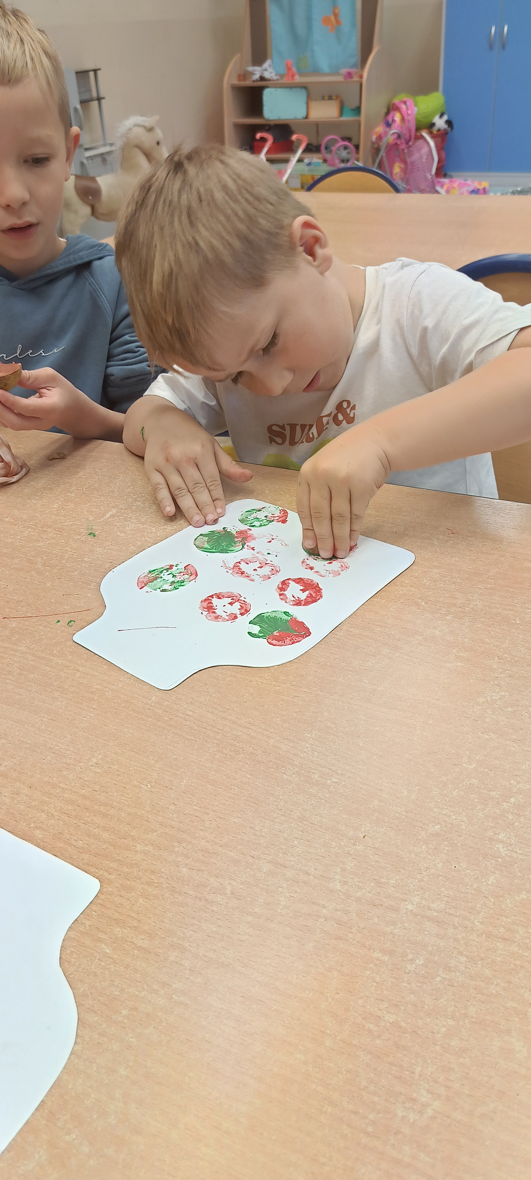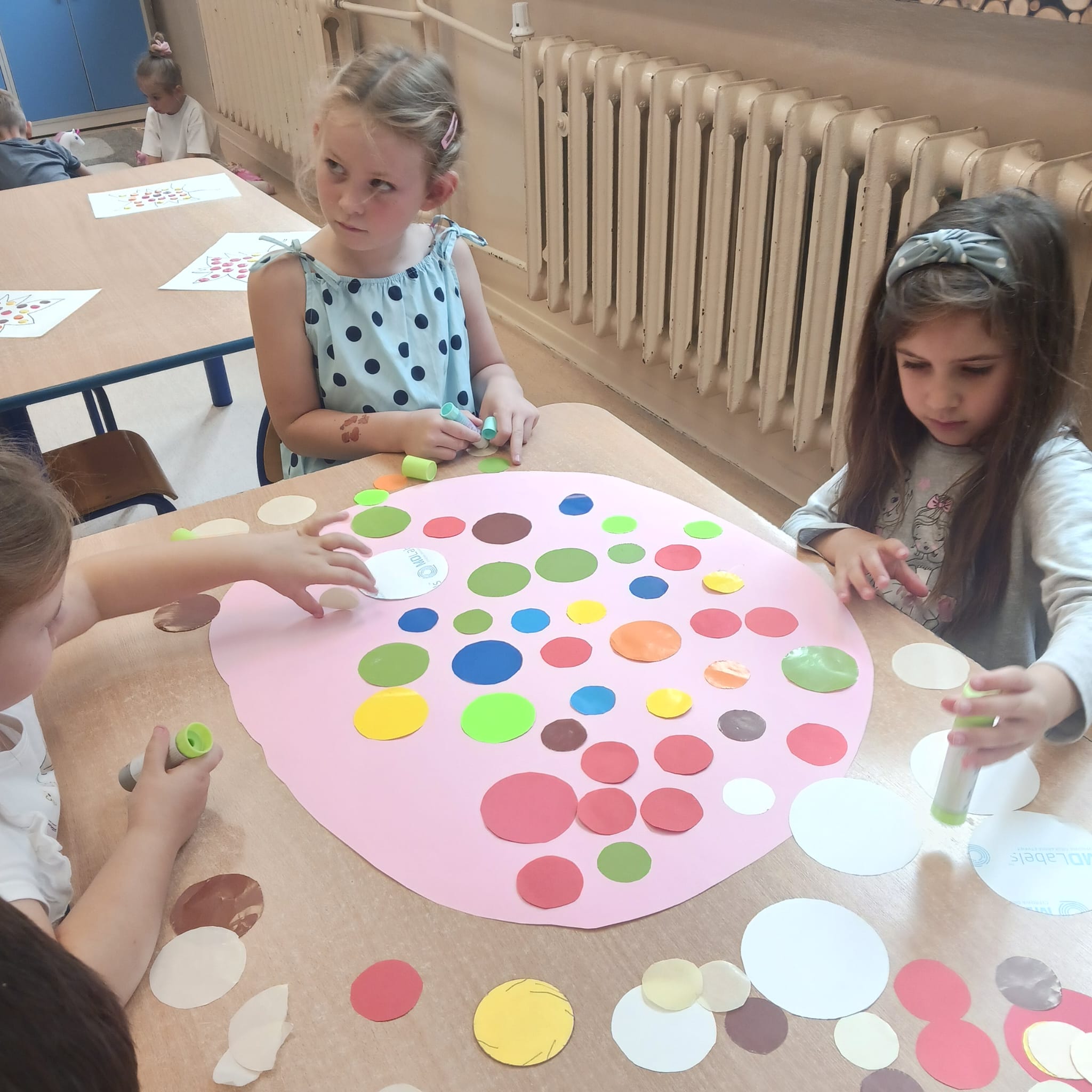 W naszej grupie Bursztynki tworzą swoje prace nie tylko za pomocą kredek i farb ale wykorzystujemy surowe jabłka, tworzymy kałuże za pomocą farb i słomek oraz wydzieranek. Dzieci są bardzo zdolne i kreatywne w różnych dziedzinach: plastycznych, muzycznych, edukacyjnych jak i w zabawach dowolnych.