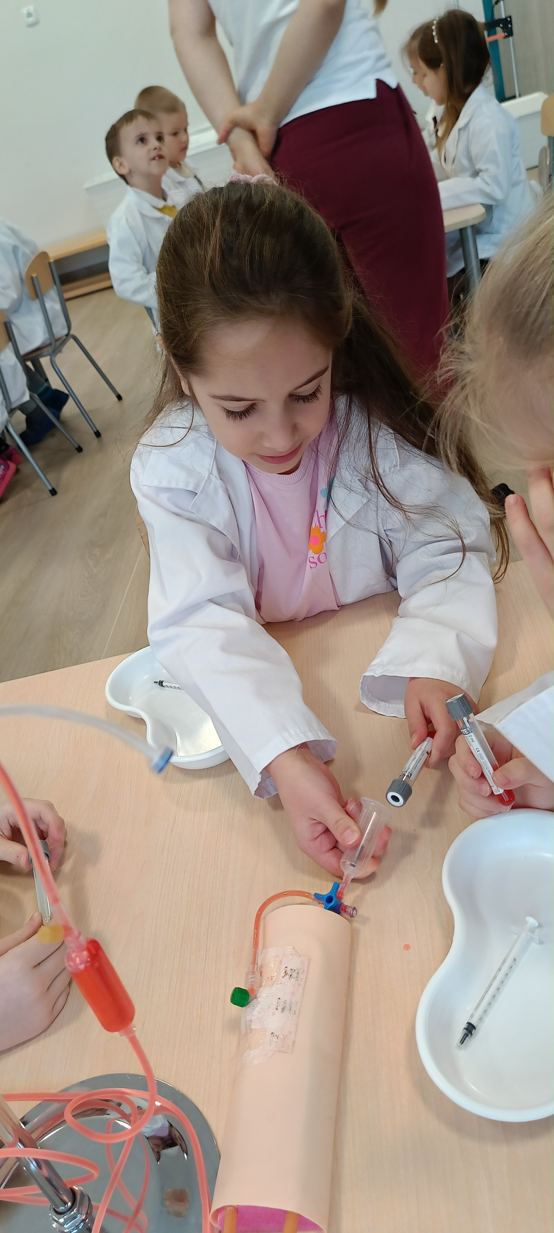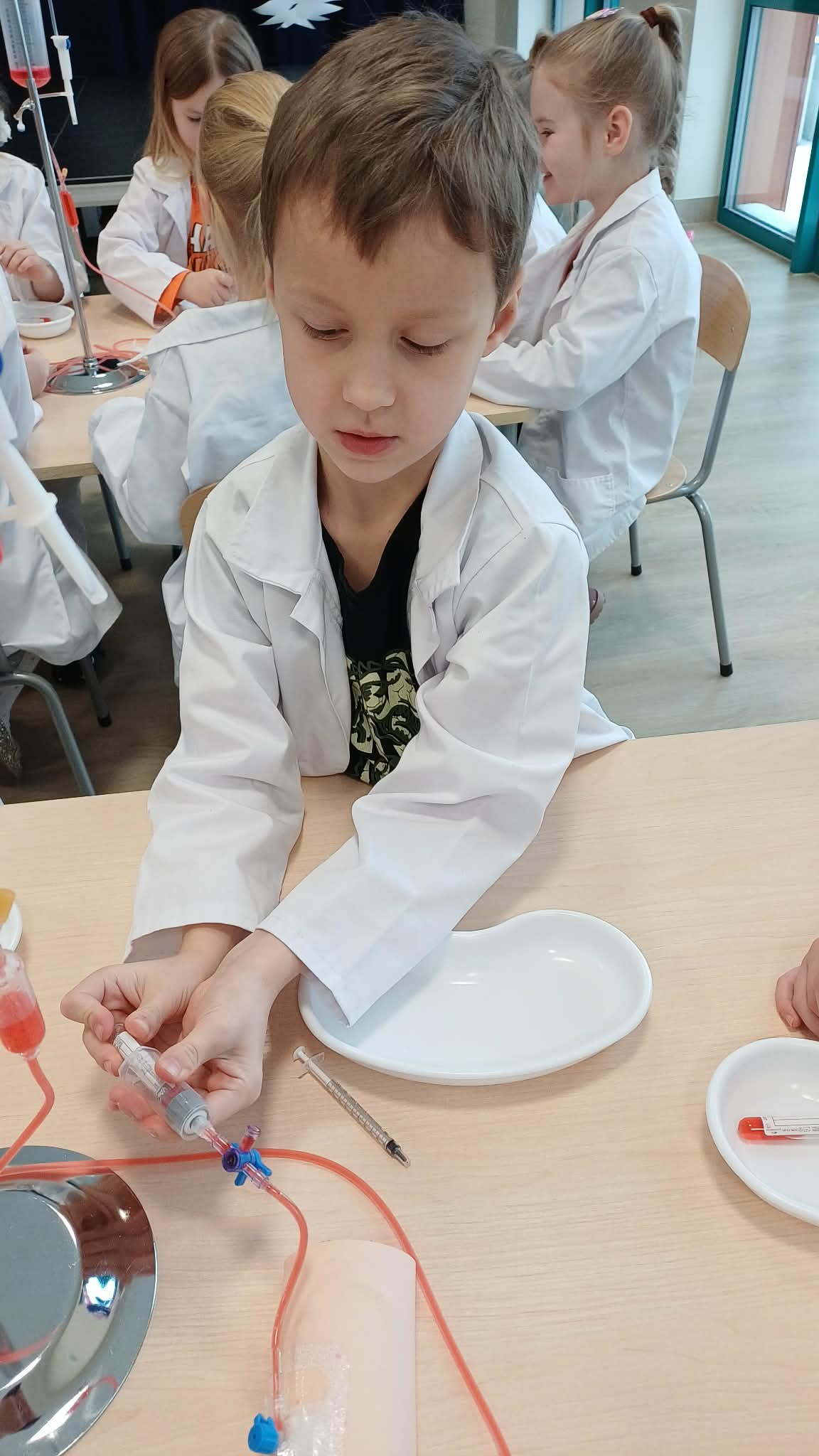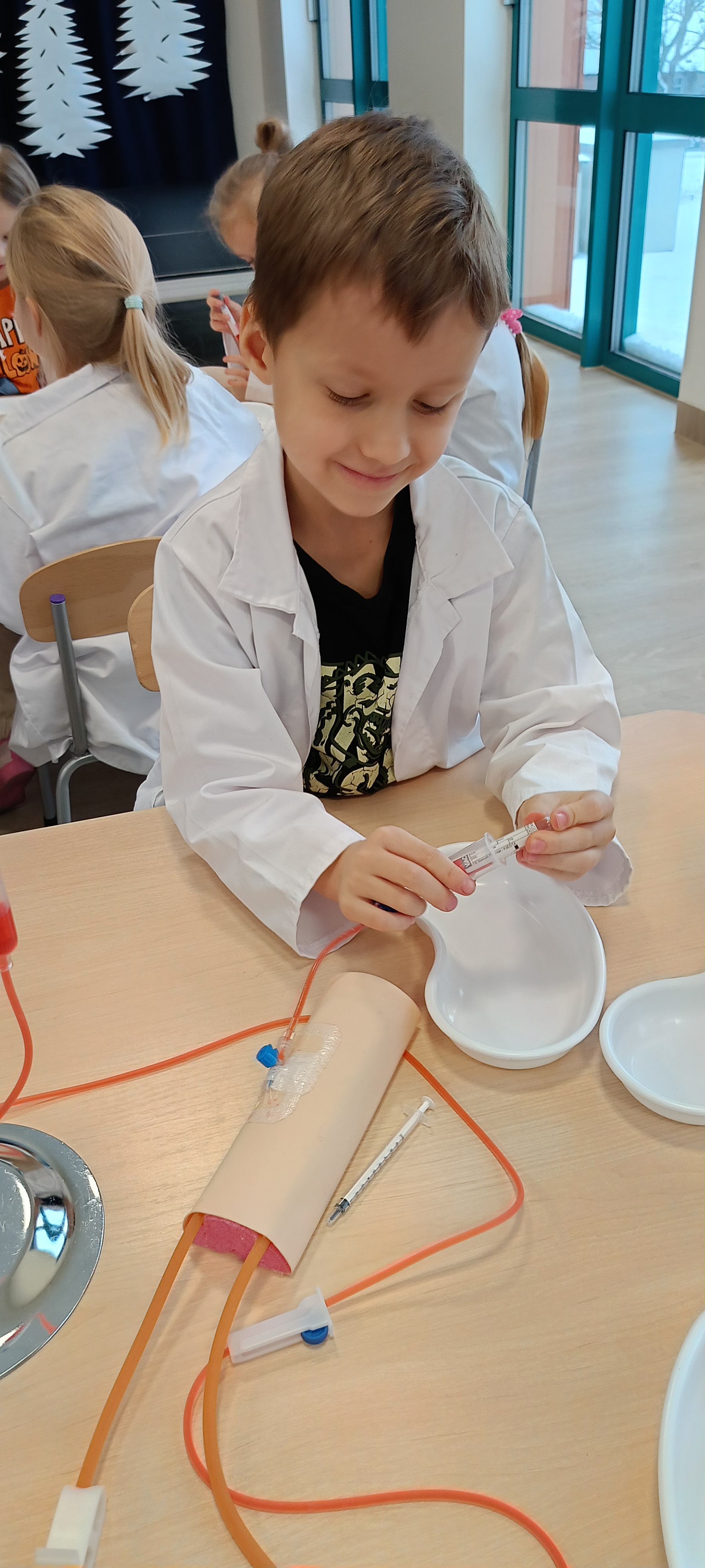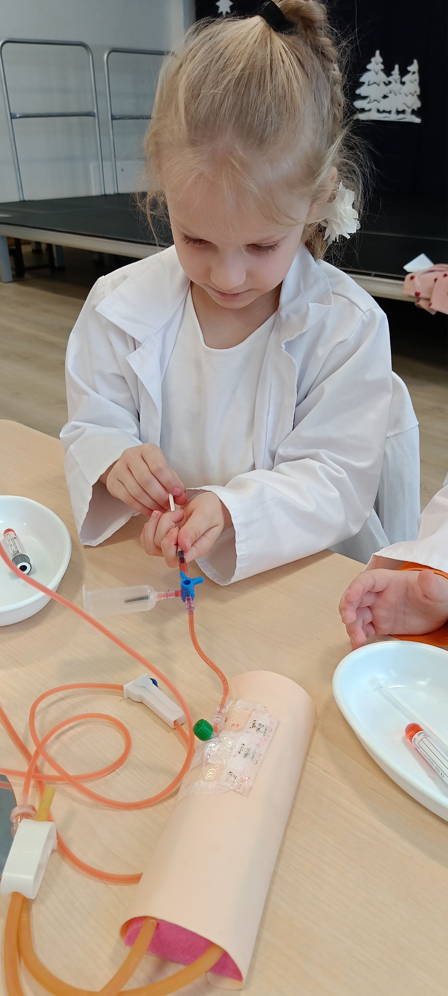 Dziś nasza grupa brała udział w warsztatach medycznych - pobieranie krwi. Bursztynki dowiedziały się czego używa się do pobierania krwi oraz jaka jest cała procedura przez wykonaniem zabiegu, później przeszli do zajęć praktycznych gdzie uczyły się pobierać krew do probówki oraz za pomocą strzykawki. Dzieci były zaangażowane i zadowolone z zajęć.