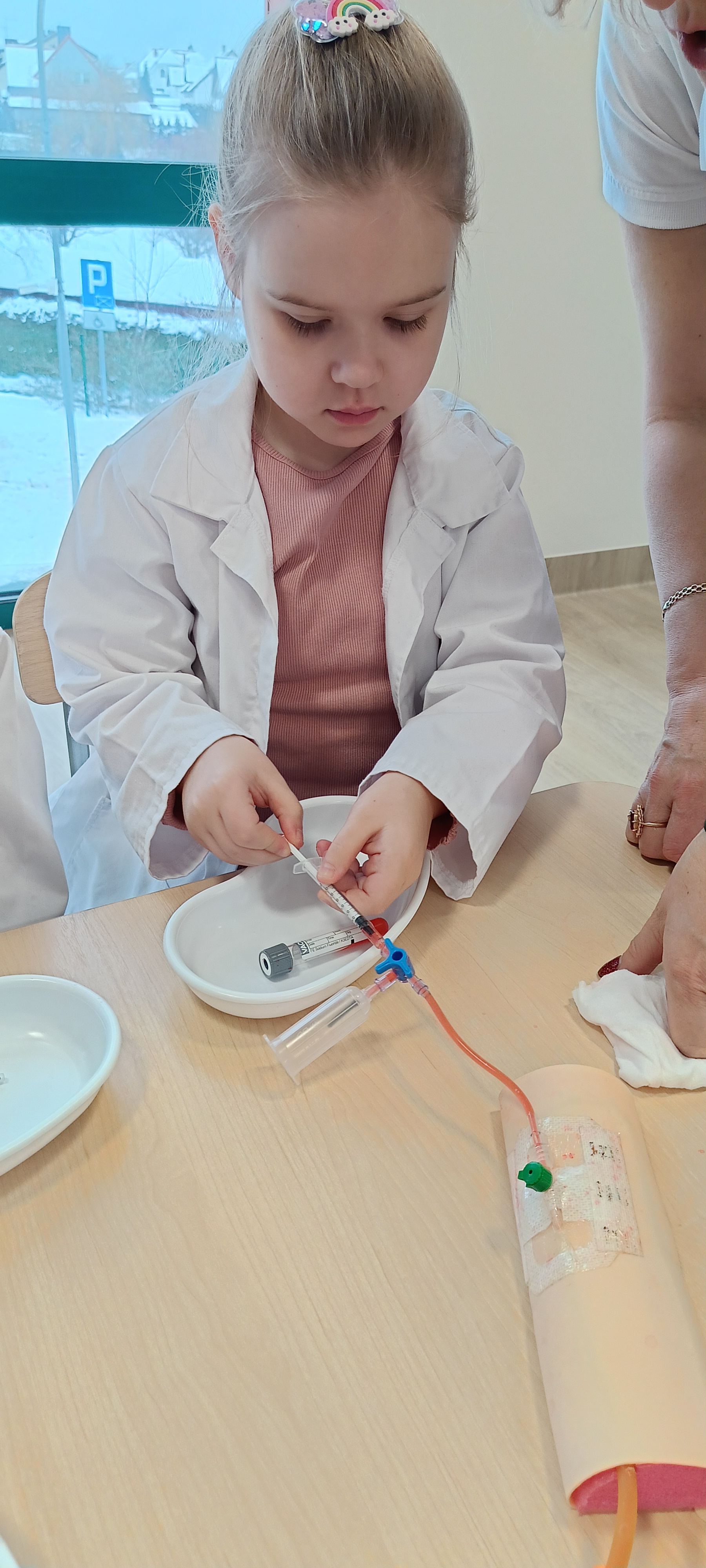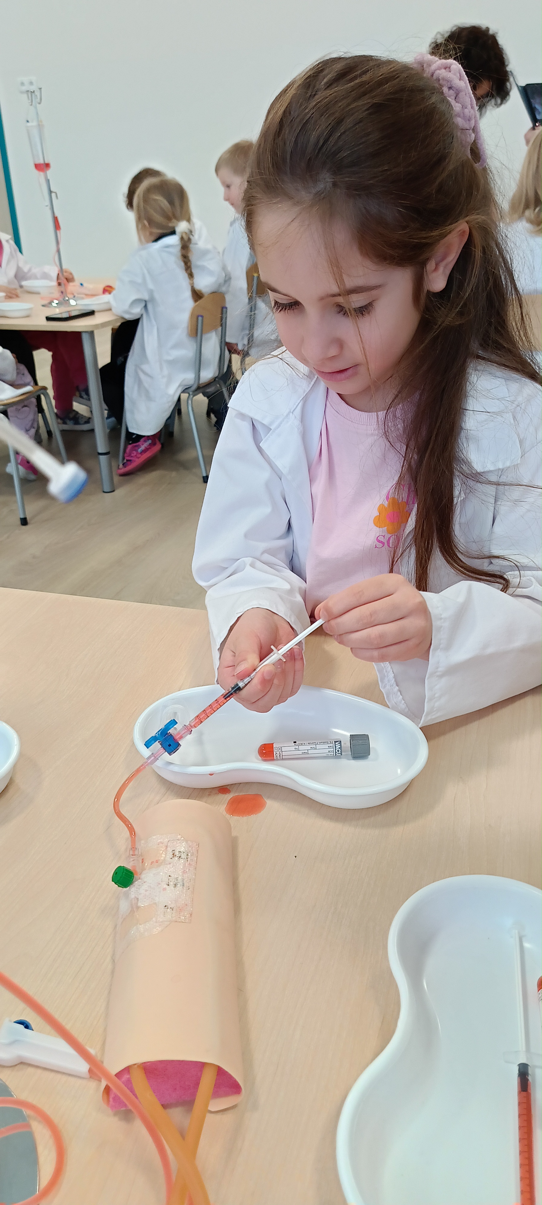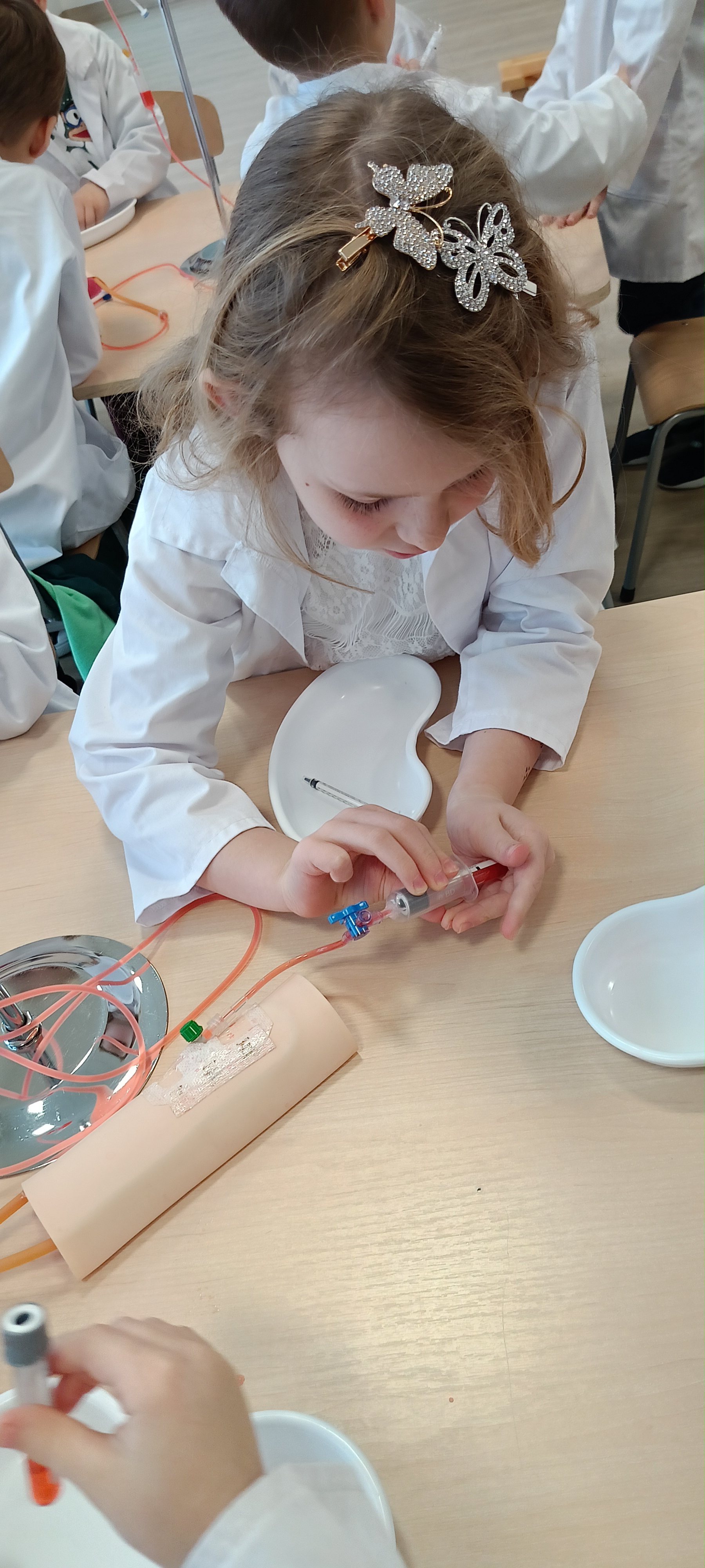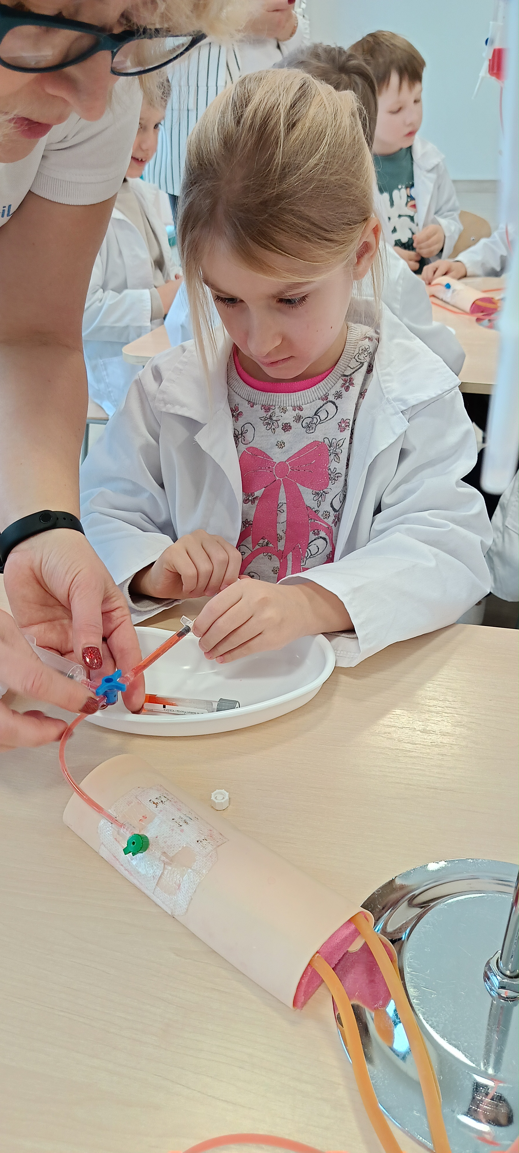 Dziś nasza grupa brała udział w warsztatach medycznych - pobieranie krwi. Bursztynki dowiedziały się czego używa się do pobierania krwi oraz jaka jest cała procedura przez wykonaniem zabiegu, później przeszli do zajęć praktycznych gdzie uczyły się pobierać krew do probówki oraz za pomocą strzykawki. Dzieci były zaangażowane i zadowolone z zajęć.