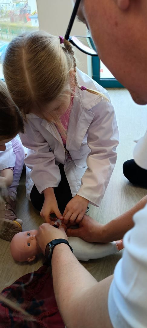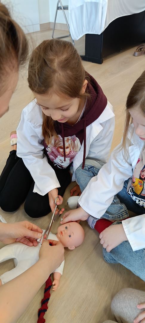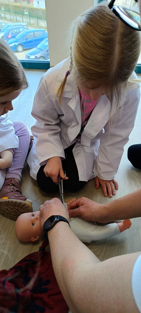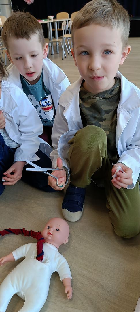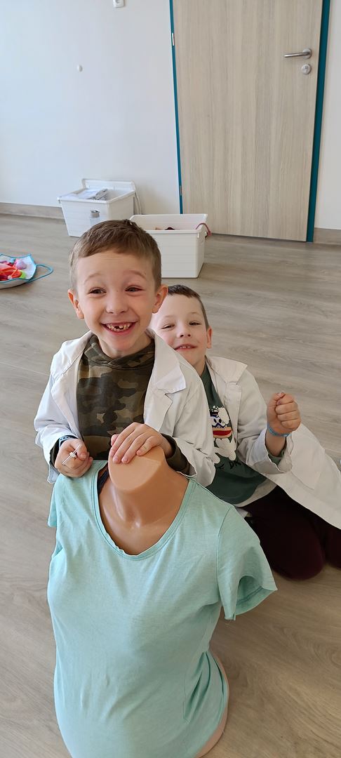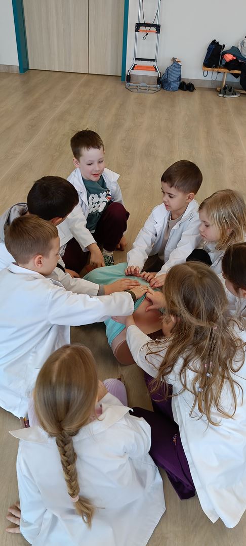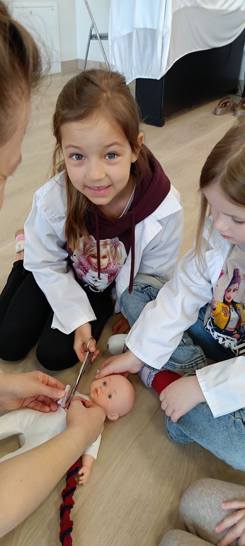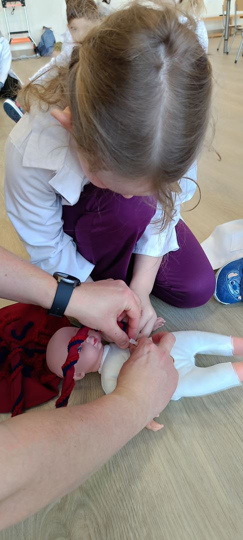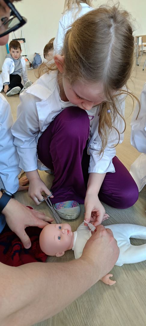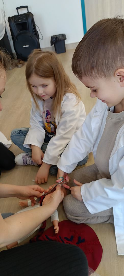 11 marca uczestniczyliśmy w warsztatach medycznych i dowiedzieliśmy skąd człowiek ma pępek. Pani dokładnie wyjaśniła nam jakie organy znajdują się w naszym organiźmie oraz jak rośnie dziecko w brzuchu kobiety. I na koniec Pani wytłumaczyła skąd wziął się pępek. Wytłumaczyła czym jest pępowina i że to od niej mamy pępek. Dzieci miały okazję przeciąć pępowinę, założyć klamerkę zabezpieczająca i podpisać bransoletkę poporodową. Zajęcia były przeprowadzone w bardzo naturalny, swobodny i ciekawy sposób.