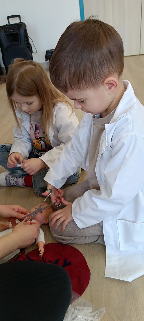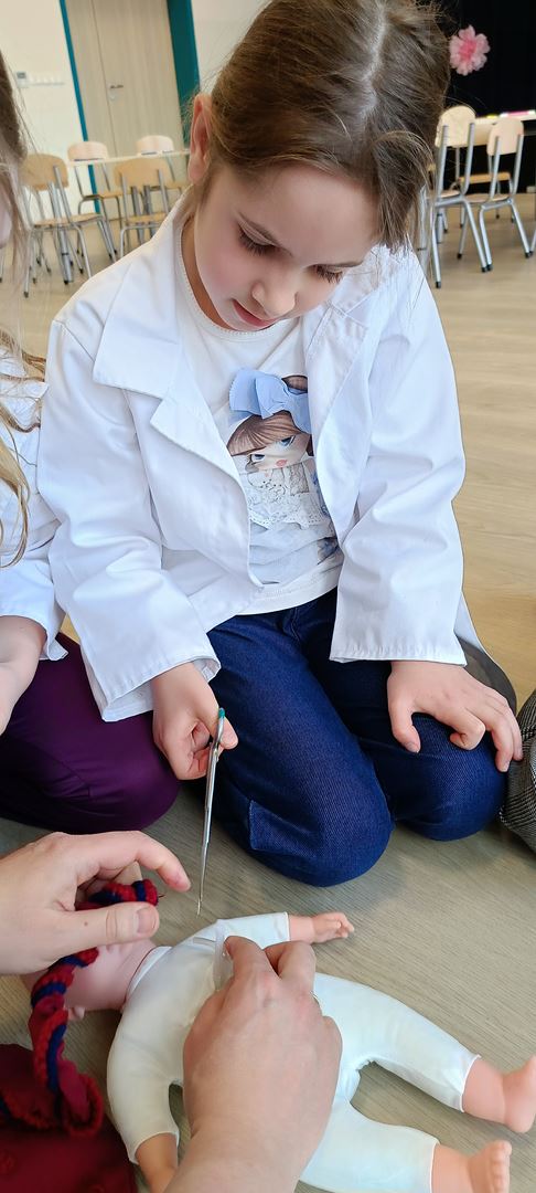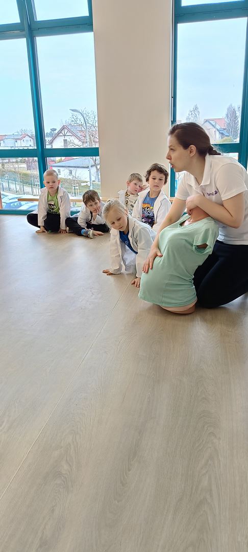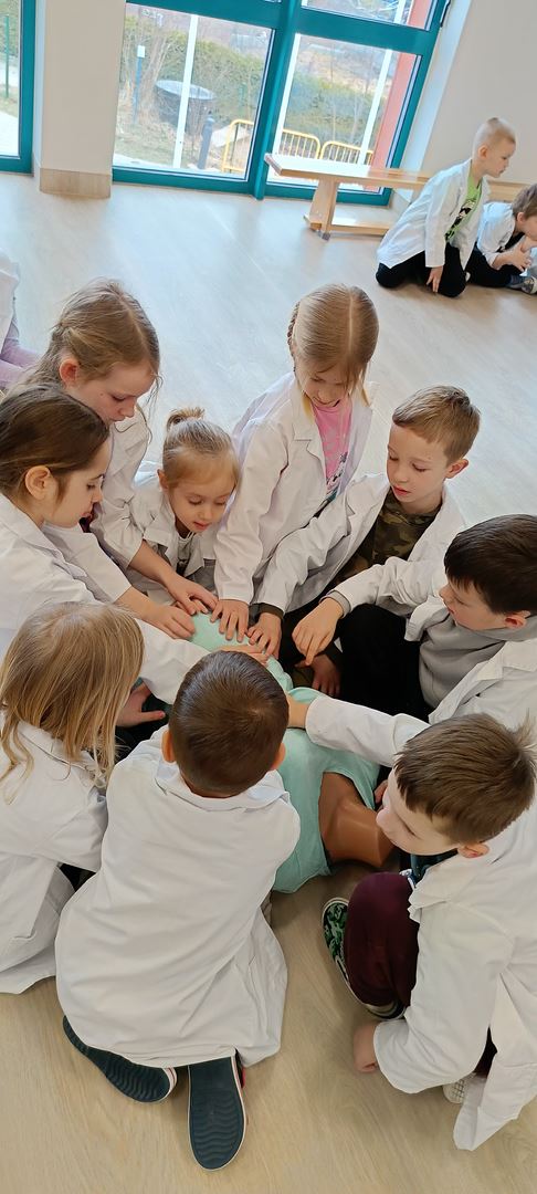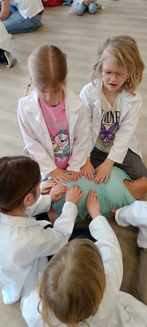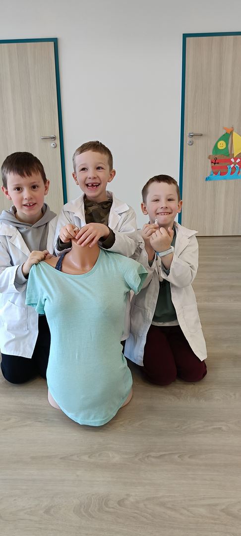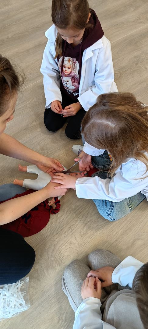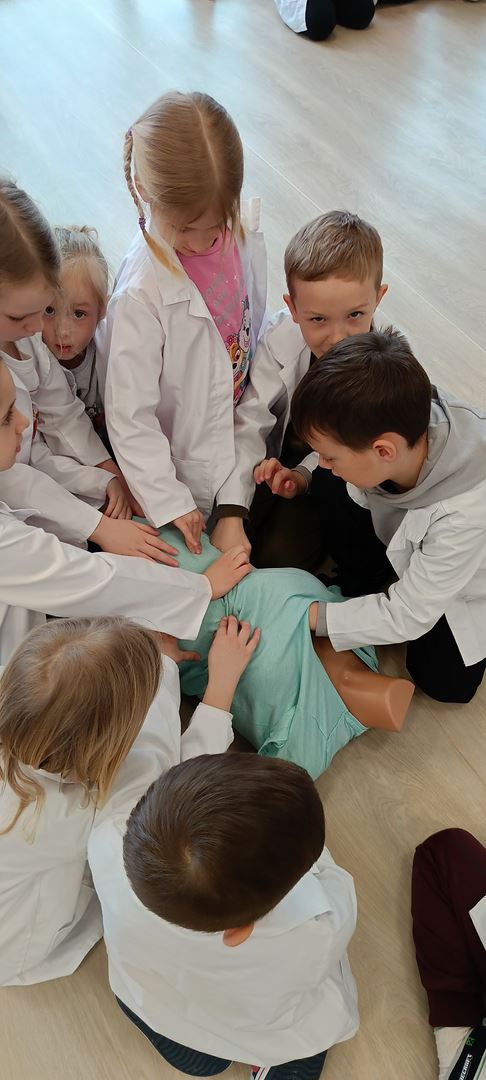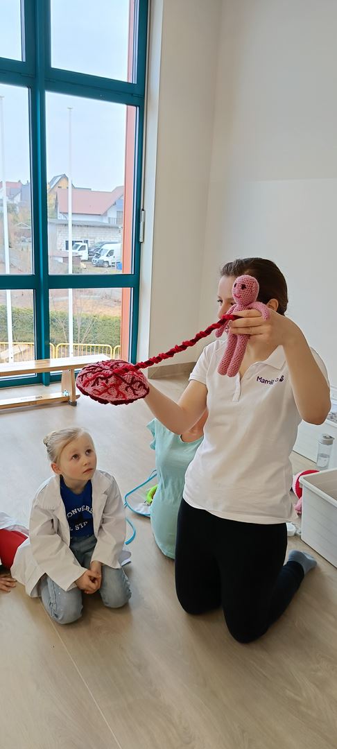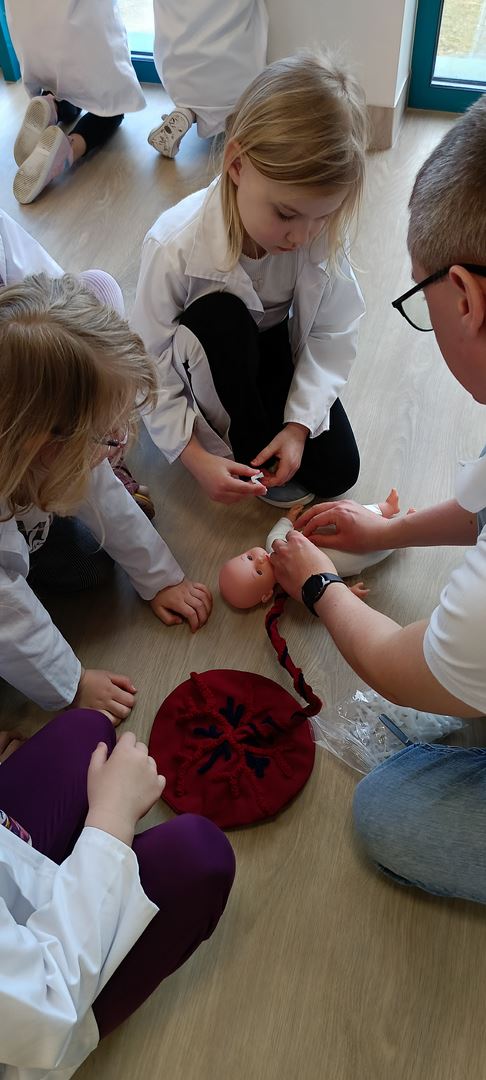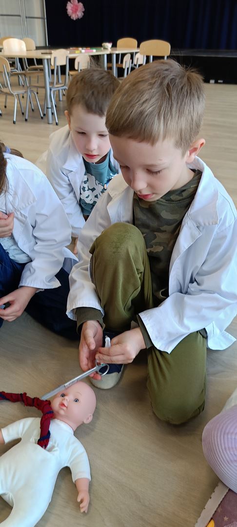 11 marca uczestniczyliśmy w warsztatach medycznych i dowiedzieliśmy skąd człowiek ma pępek. Pani dokładnie wyjaśniła nam jakie organy znajdują się w naszym organiźmie oraz jak rośnie dziecko w brzuchu kobiety. I na koniec Pani wytłumaczyła skąd wziął się pępek. Wytłumaczyła czym jest pępowina i że to od niej mamy pępek. Dzieci miały okazję przeciąć pępowinę, założyć klamerkę zabezpieczająca i podpisać bransoletkę poporodową. Zajęcia były przeprowadzone w bardzo naturalny, swobodny i ciekawy sposób.