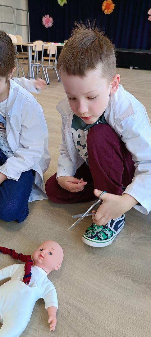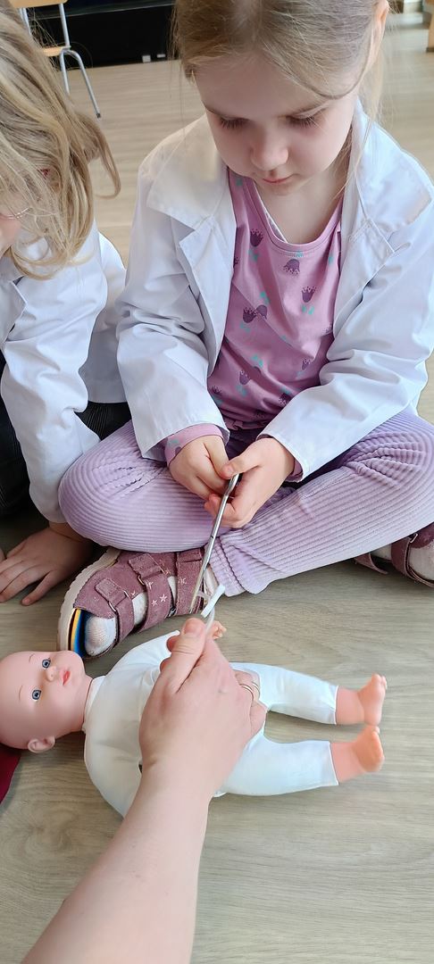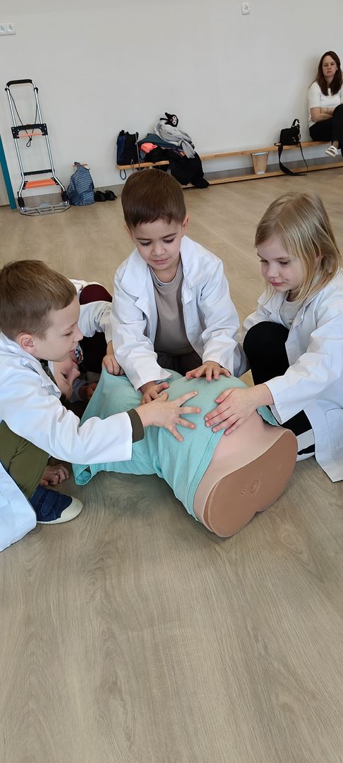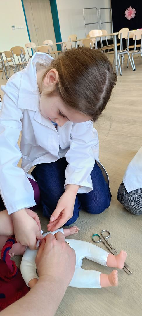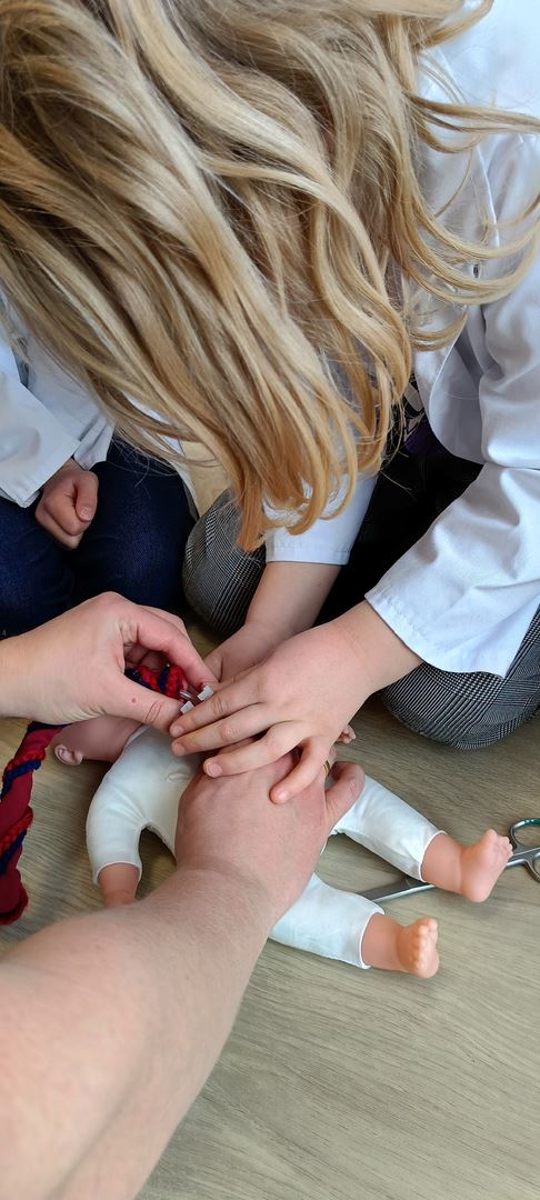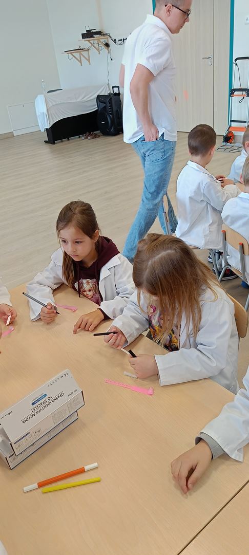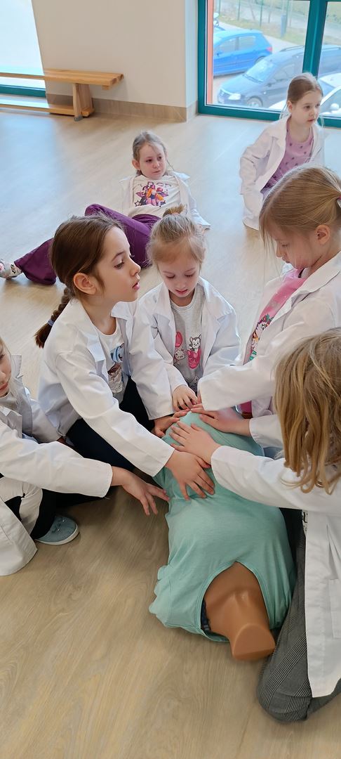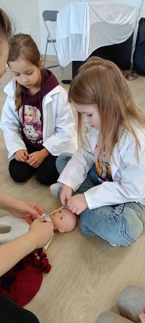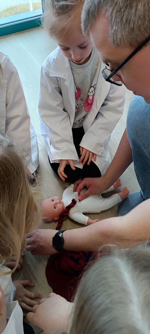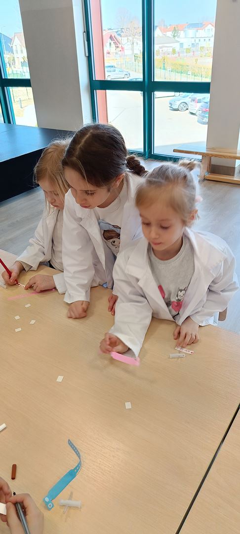 11 marca uczestniczyliśmy w warsztatach medycznych i dowiedzieliśmy skąd człowiek ma pępek. Pani dokładnie wyjaśniła nam jakie organy znajdują się w naszym organiźmie oraz jak rośnie dziecko w brzuchu kobiety. I na koniec Pani wytłumaczyła skąd wziął się pępek. Wytłumaczyła czym jest pępowina i że to od niej mamy pępek. Dzieci miały okazję przeciąć pępowinę, założyć klamerkę zabezpieczająca i podpisać bransoletkę poporodową. Zajęcia były przeprowadzone w bardzo naturalny, swobodny i ciekawy sposób.
