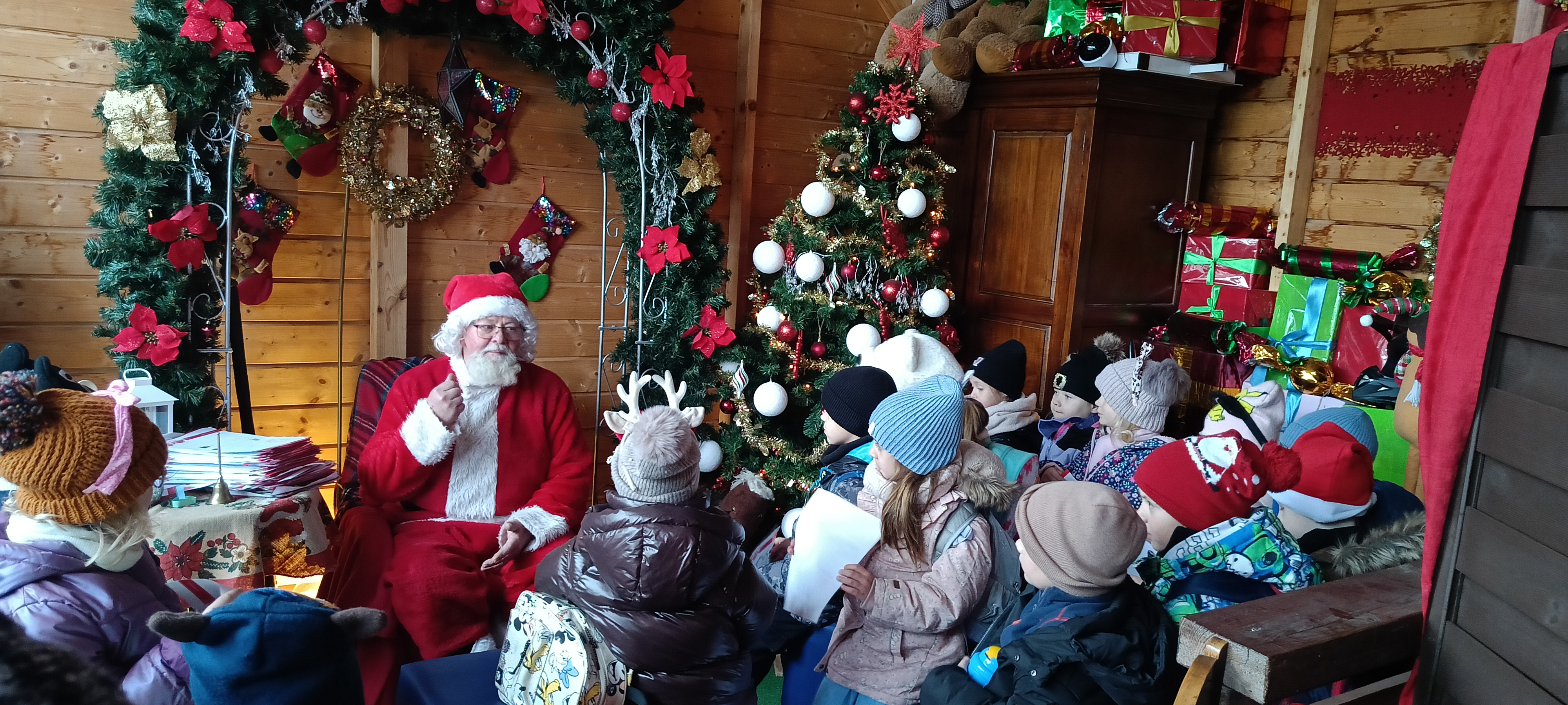 Bursztynki 15 grudnia pojechały ekspresem polarnym do wioski Świętego Mikołaja gdzie zrobiły swoje ozdoby na choinkę, napisały list ze swoimi życzeniami i najważniejsze spotkały się że Świętym Mikołajem. Na koniec odwiedziliśmy farmę że zwierzętami Mikołaja z końmi, baranem, alpakami, owcami i krową szkocka. Po seansie świątecznym wróciliśmy do szkoły.