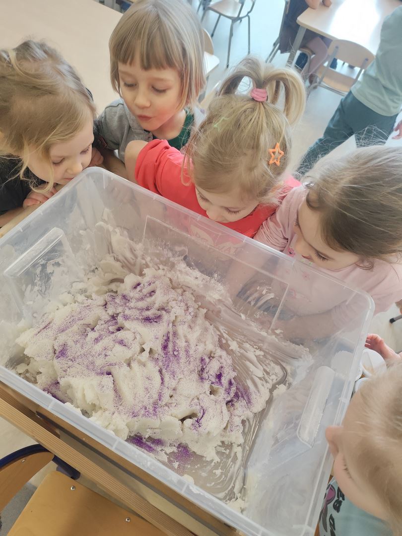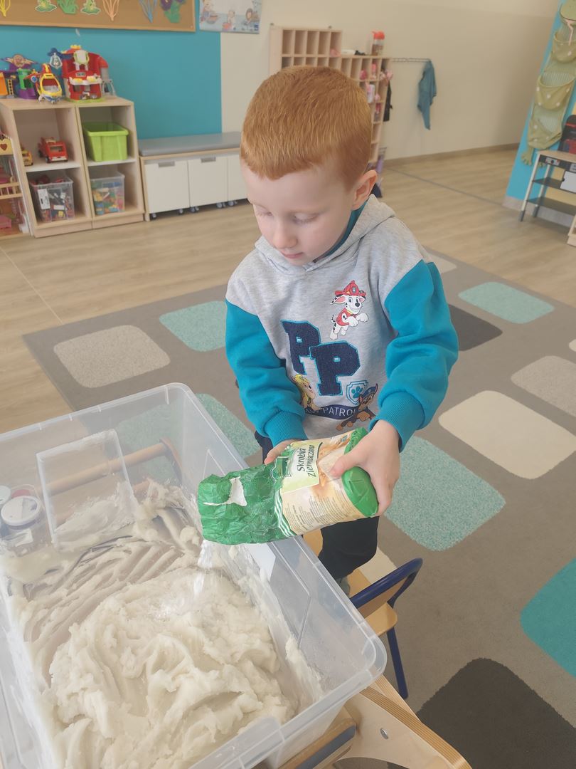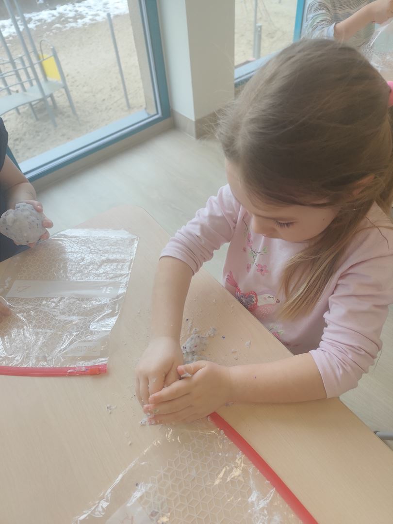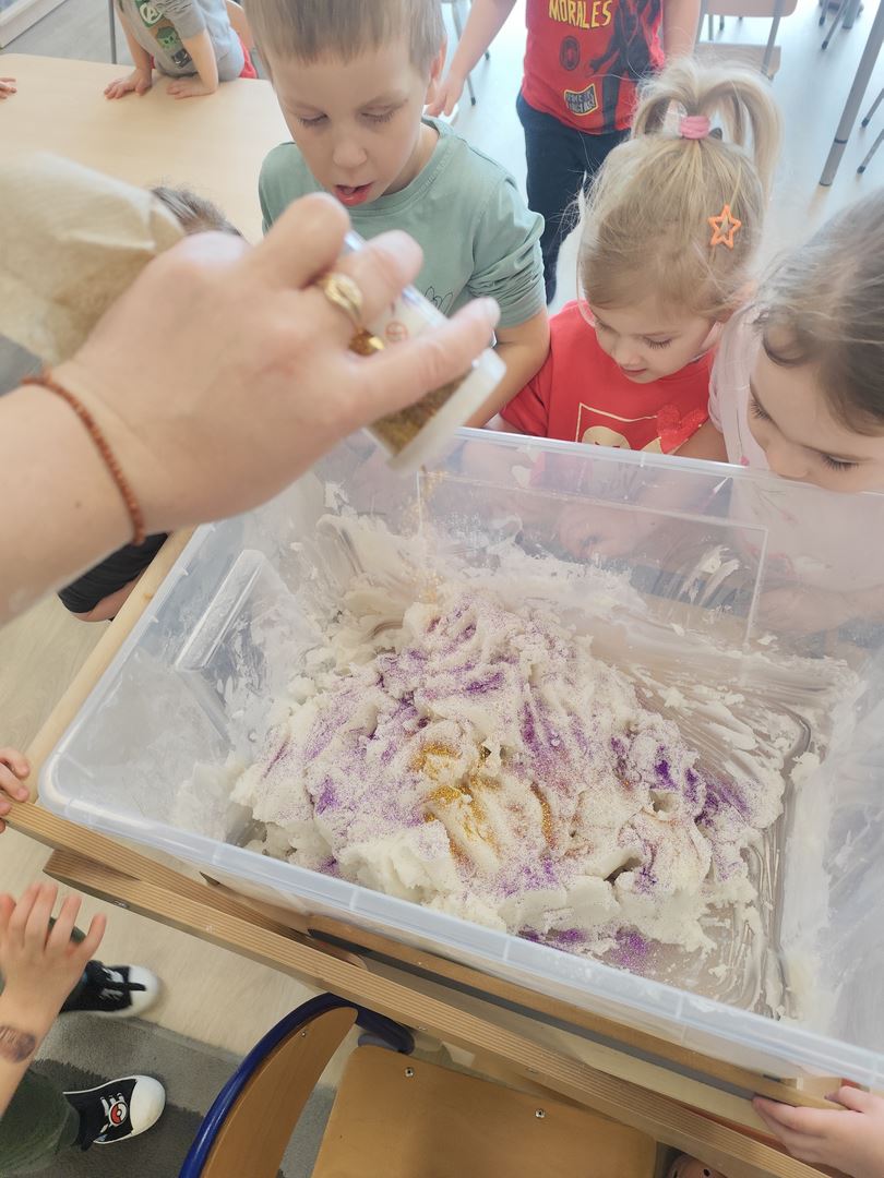 W pierwszym dniu tygodnia tematu " Jak poznajemy świat ?" razem z dziećmi stworzyliśmy brokatową, pachnącą wanilią masę sensoryczną .