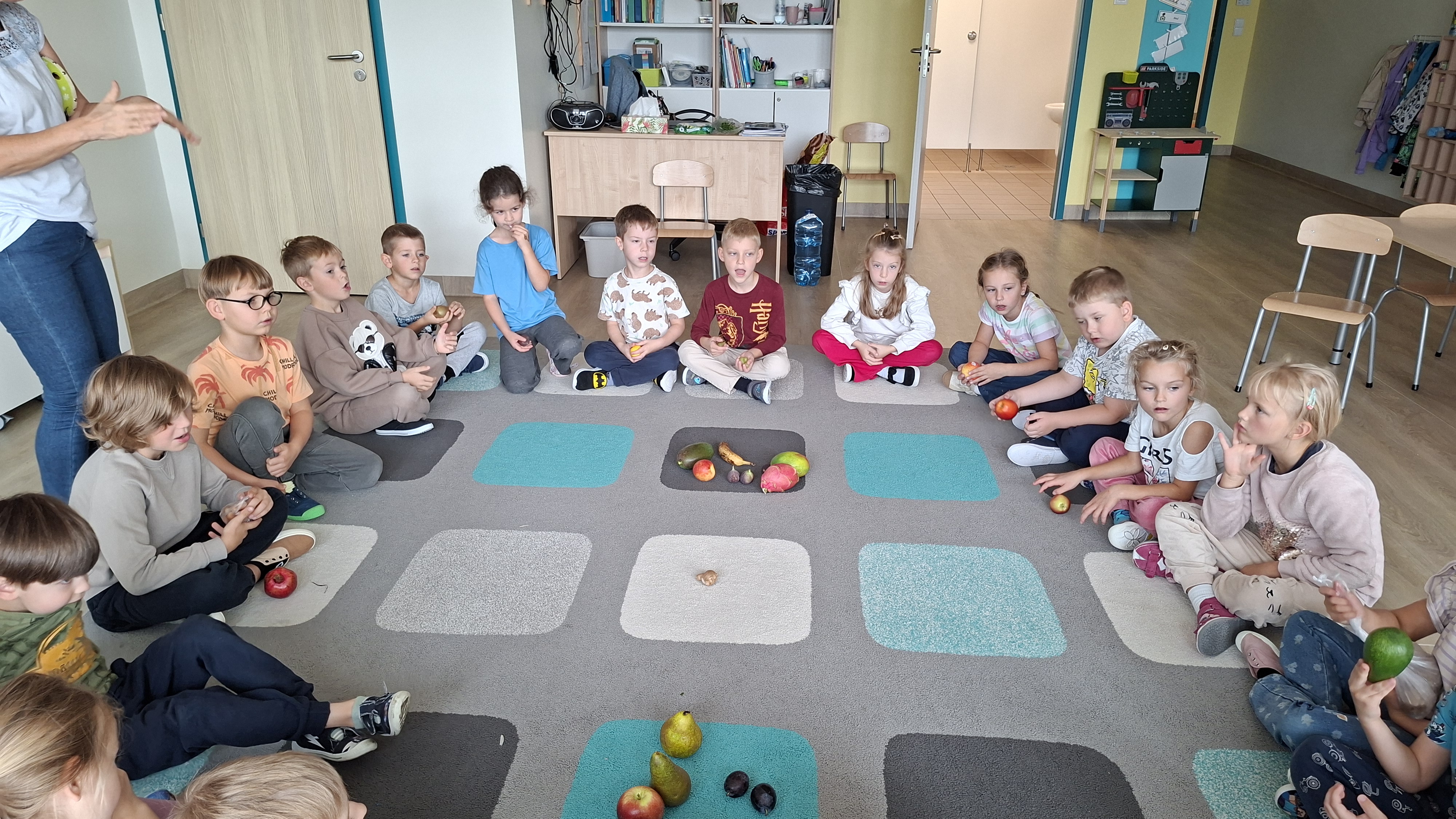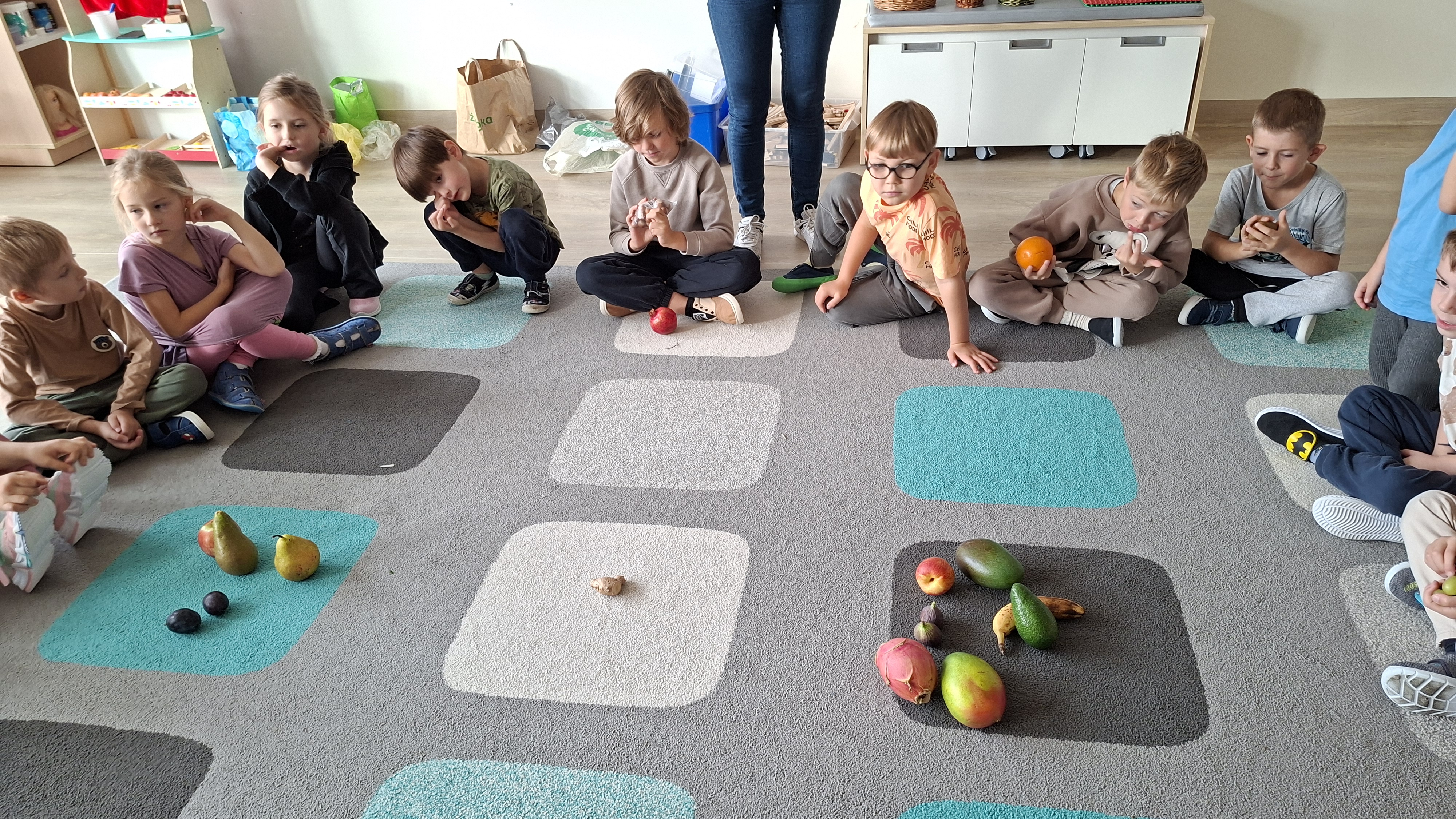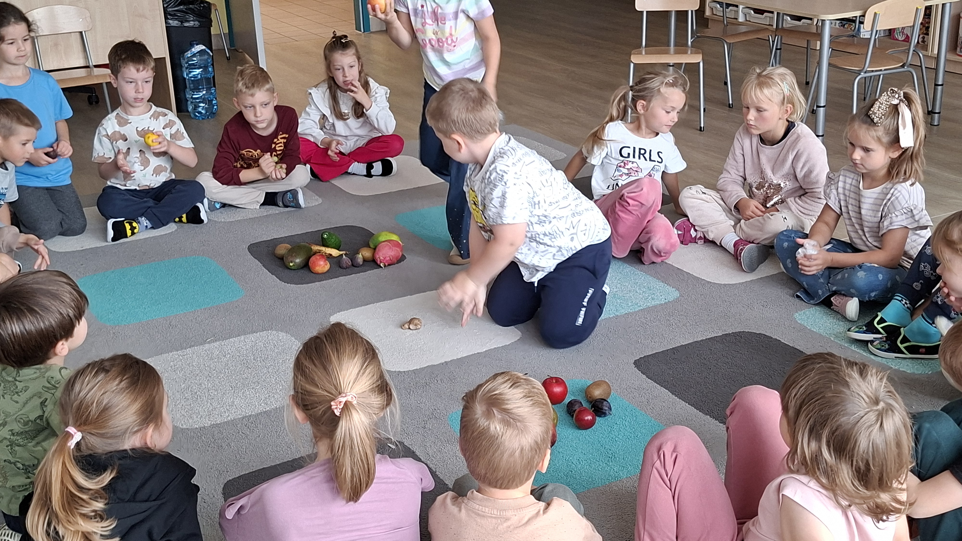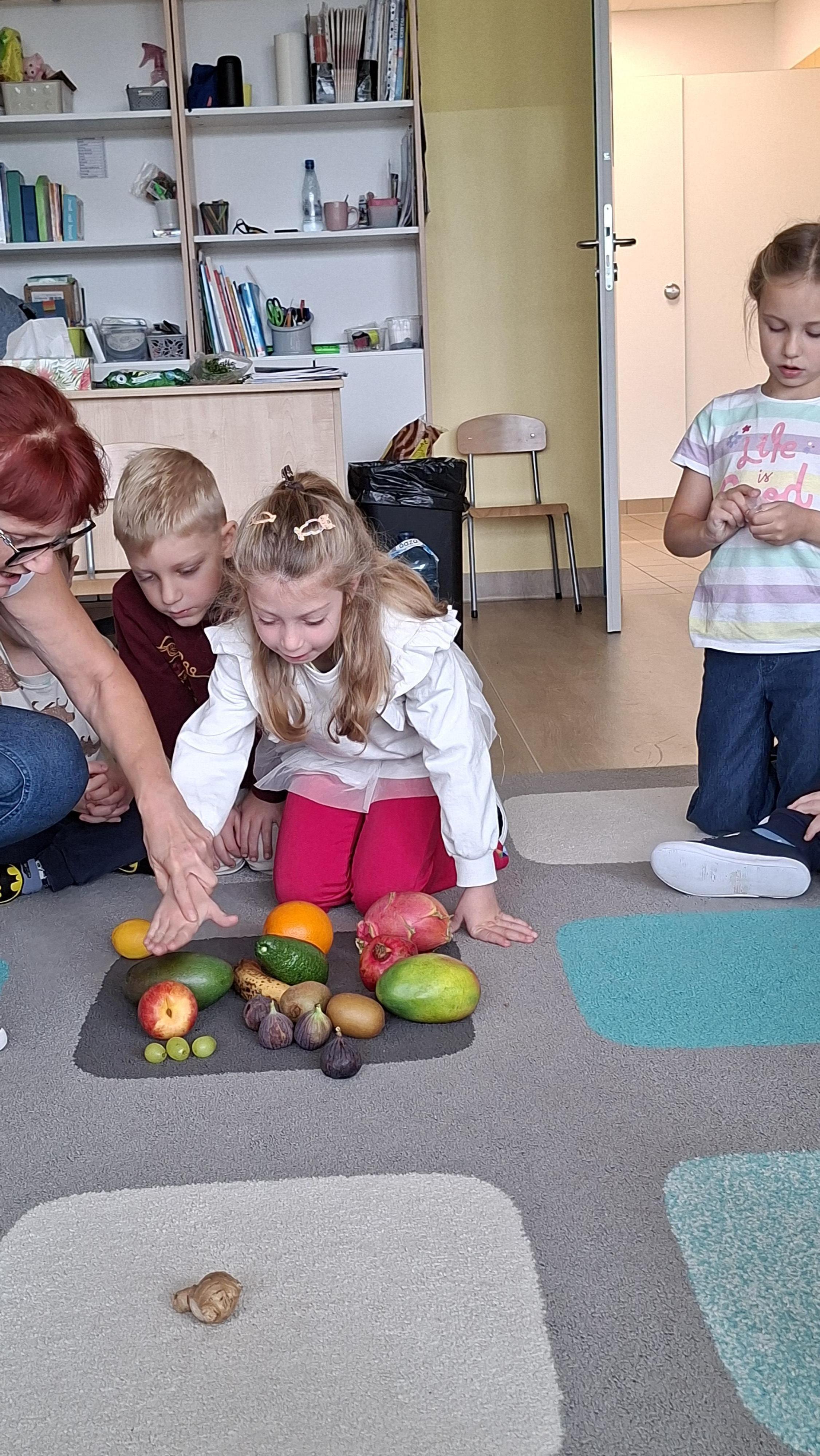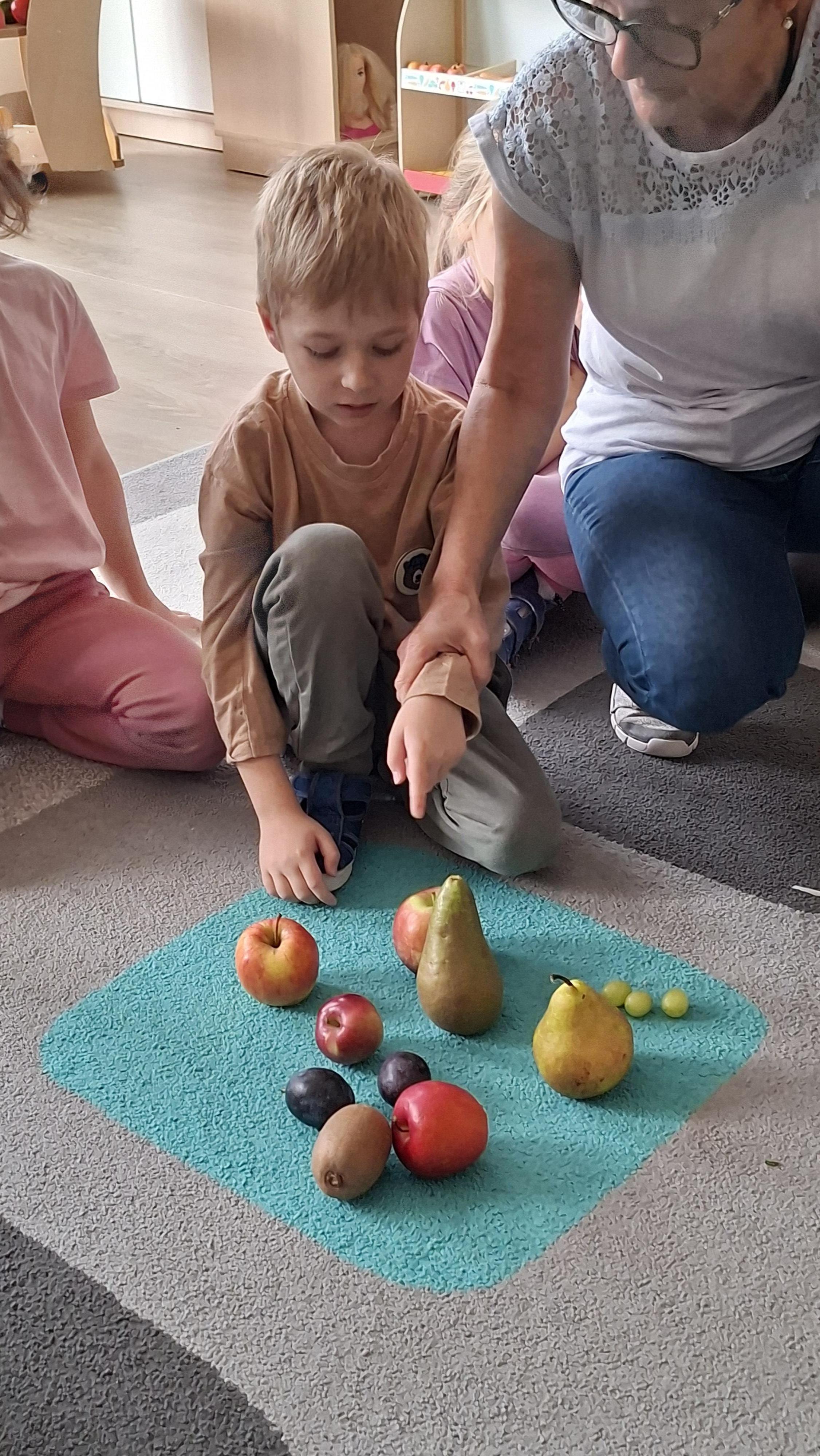 W pierwszym tygodniu października mieliśmy zajęcia z warzywami i owocami. Segregowaliśmy owoce na rosnące w kraju i owoce egzotyczne. Warzywa dzieliliśmy na korzeniowe, z których jadalna jest część podziemna oraz na te, z których jadamy cześć nadziemną. Przeliczaliśmy elementy powstałych zbiorów, porównywaliśmy których jest więcej, a których mniej. Dzieliliśmy nazwy warzyw i owoców na sylaby i wodrębnialiśmy pierwszą i ostatnią sylabę. Na koniec wszystkie owoce zostały pokrojone, a my zjedliśmy pyszną sałatkę owocową.
