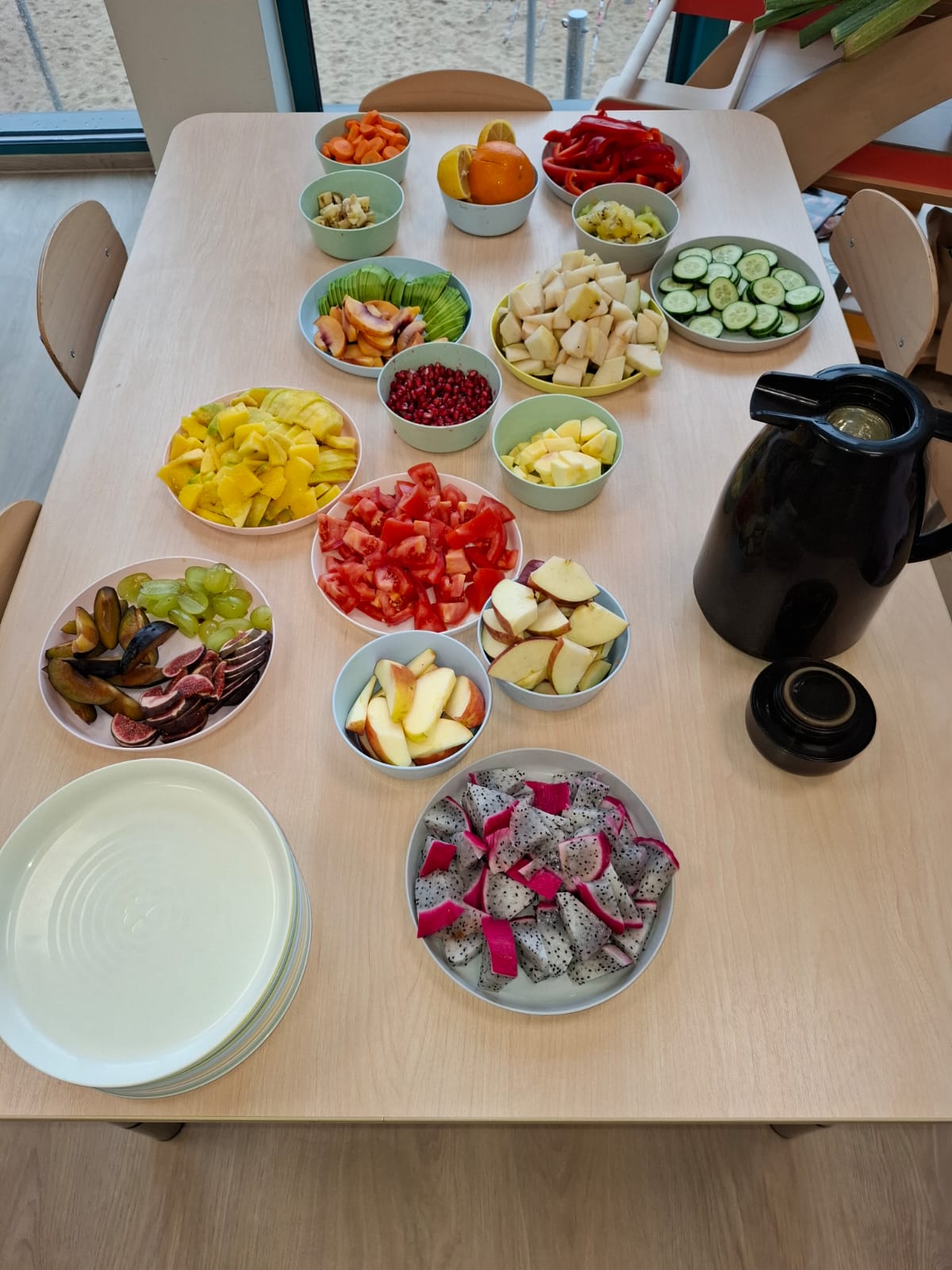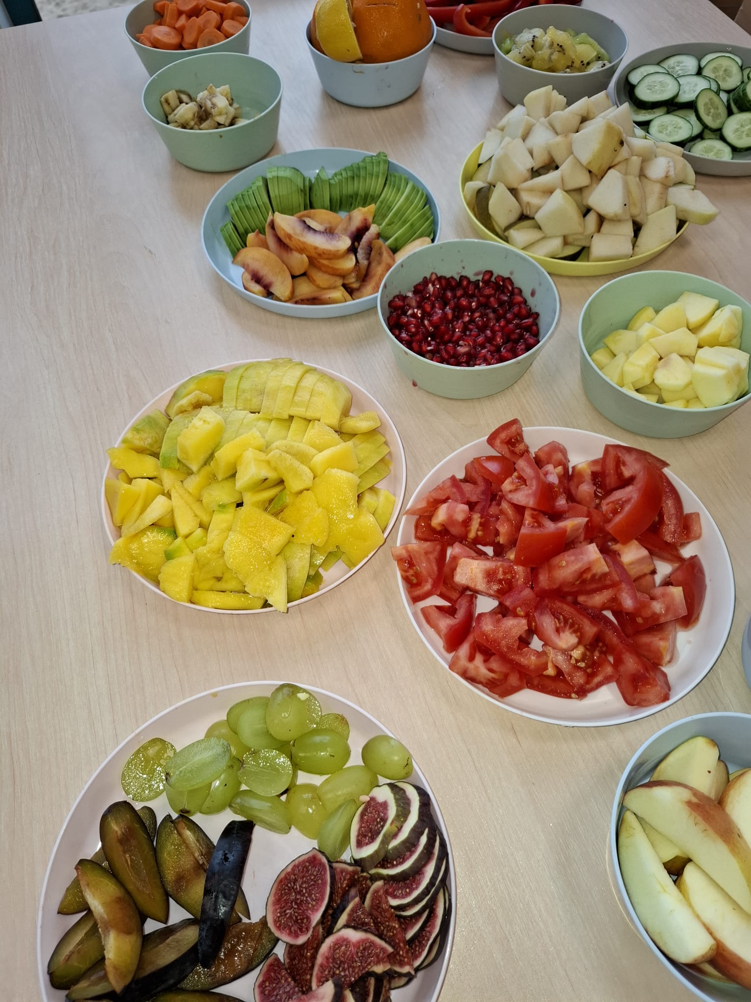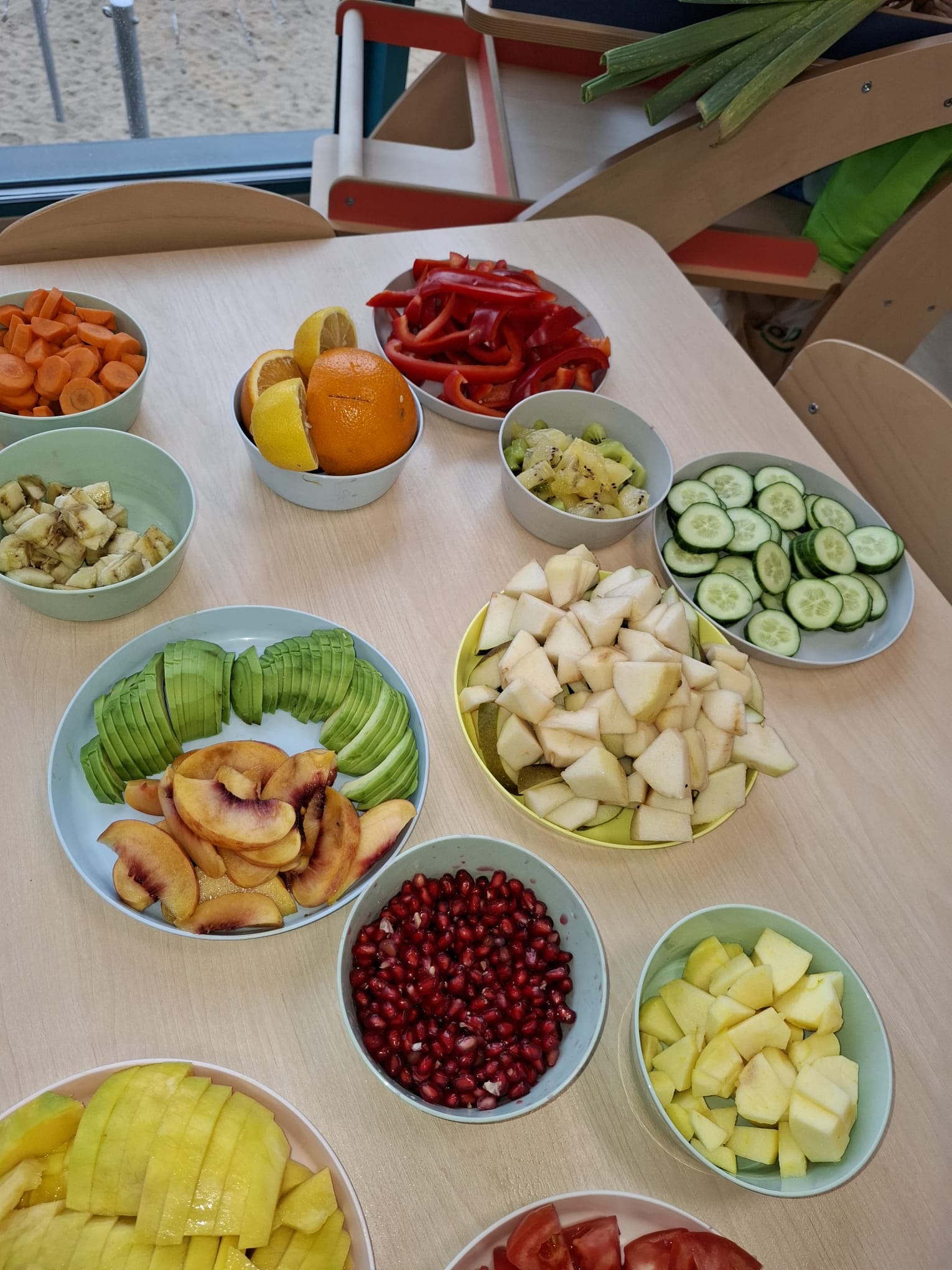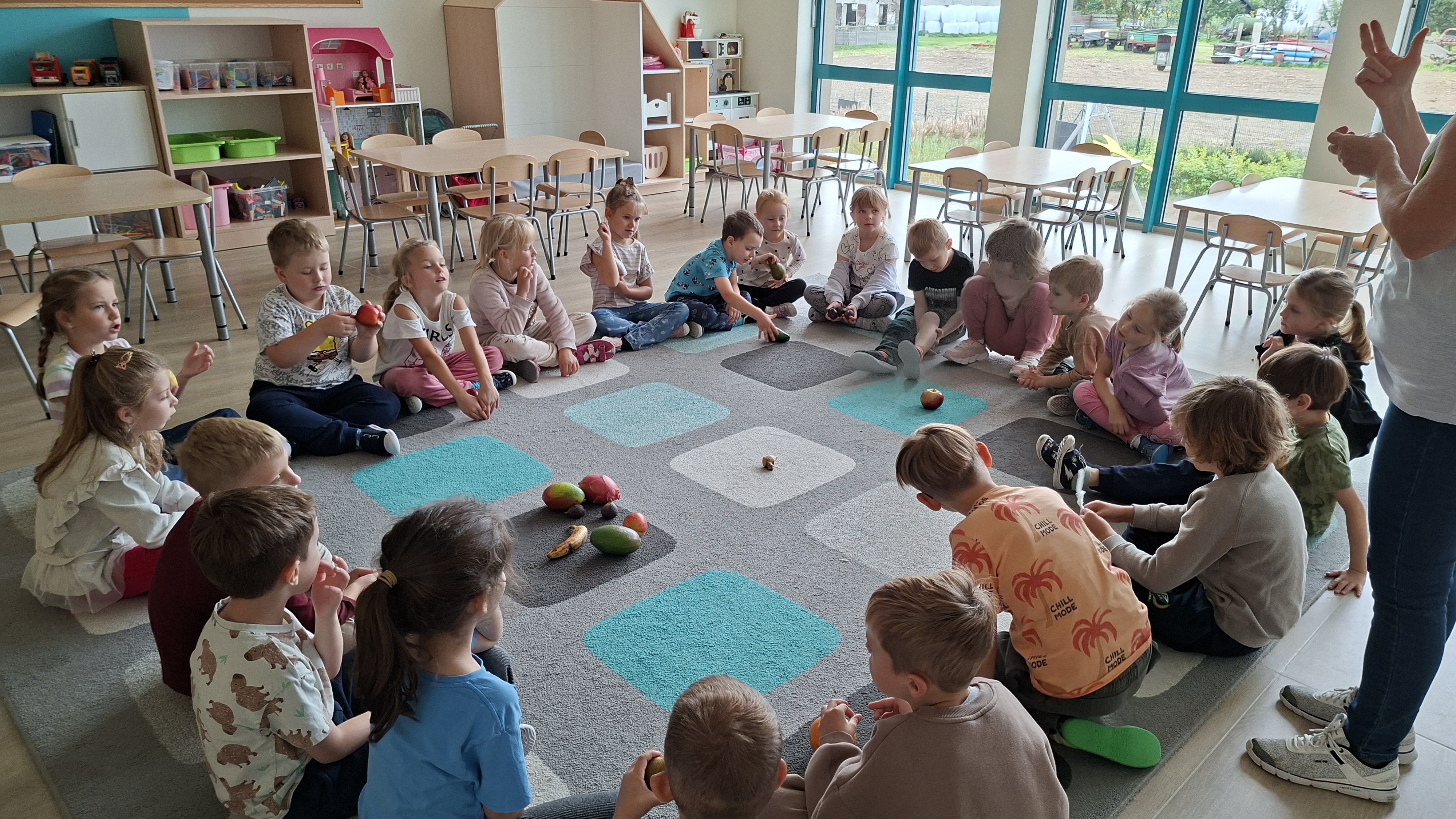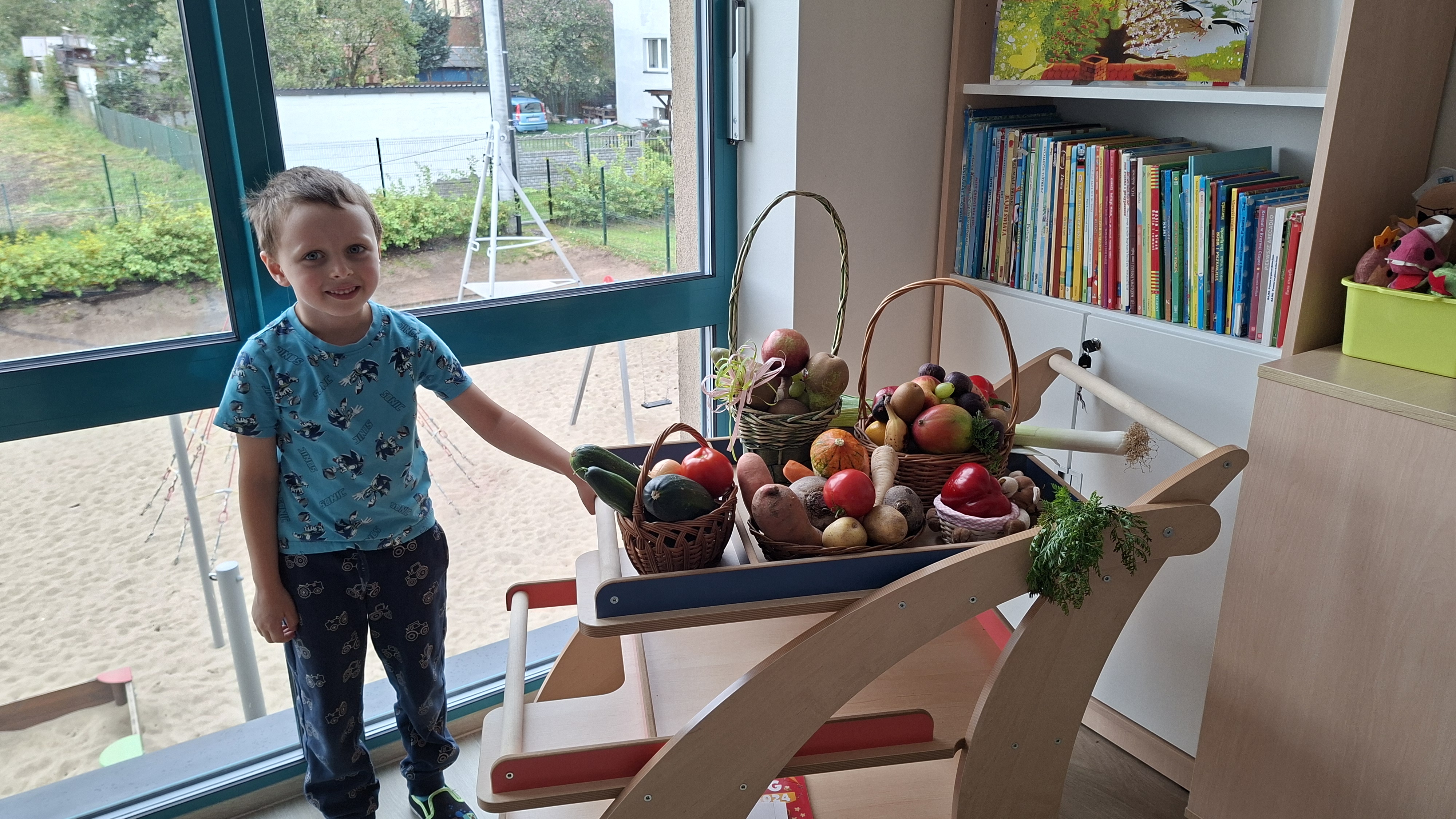 W pierwszym tygodniu października mieliśmy zajęcia z warzywami i owocami. Segregowaliśmy owoce na rosnące w kraju i owoce egzotyczne. Warzywa dzieliliśmy na korzeniowe, z których jadalna jest część podziemna oraz na te, z których jadamy cześć nadziemną. Przeliczaliśmy elementy powstałych zbiorów, porównywaliśmy których jest więcej, a których mniej. Dzieliliśmy nazwy warzyw i owoców na sylaby i wodrębnialiśmy pierwszą i ostatnią sylabę. Na koniec wszystkie owoce zostały pokrojone, a my zjedliśmy pyszną sałatkę owocową.